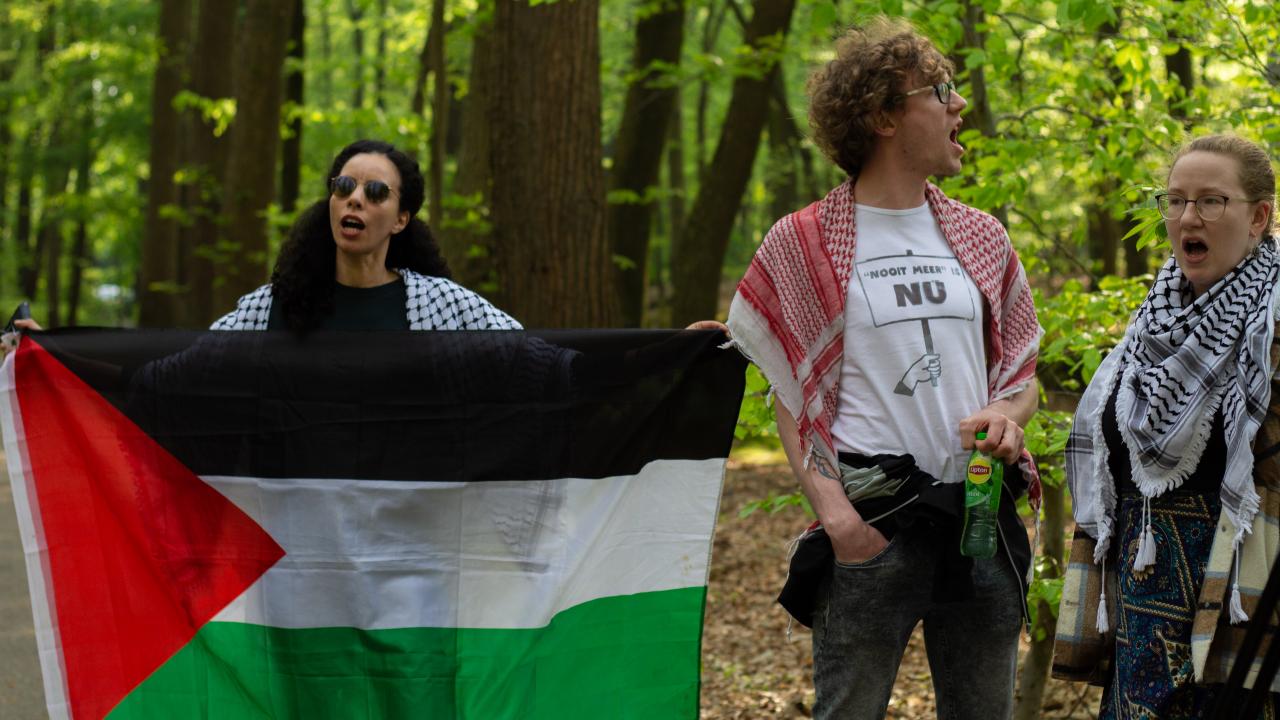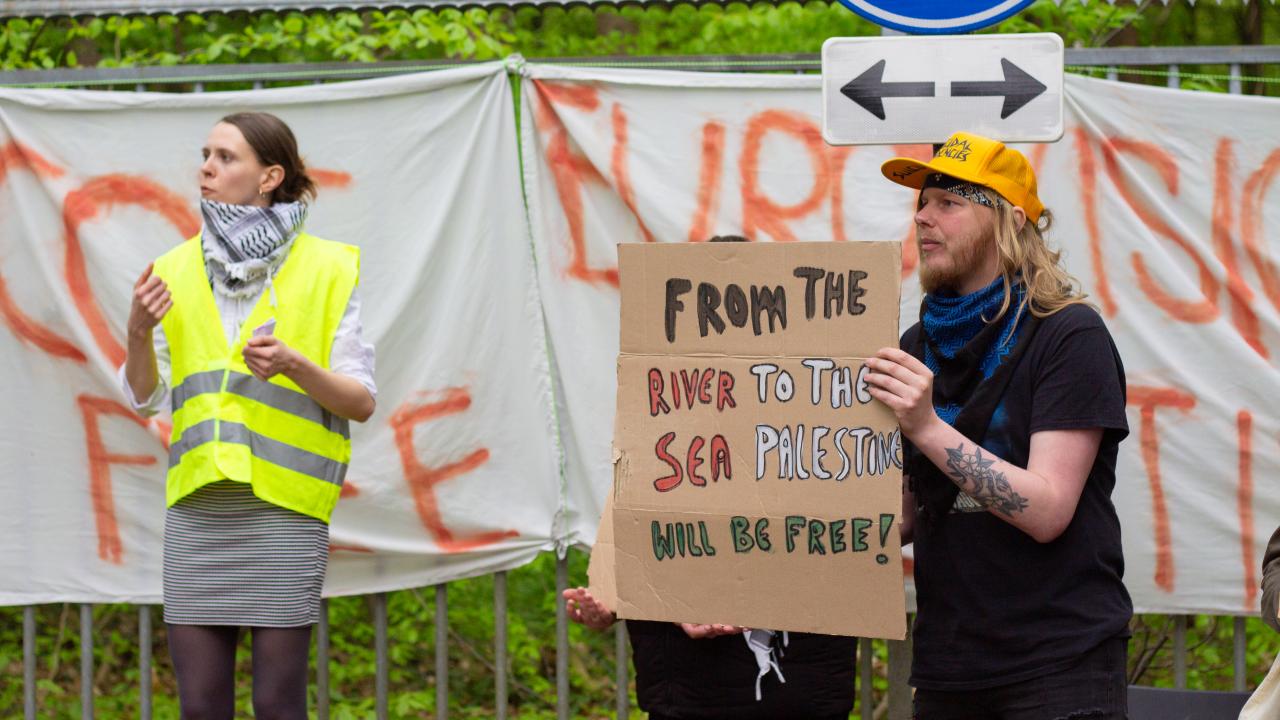 AVRO-TROS`u yarışmadan çekilmeye çağıran göstericiler, ellerinde Filistin bayrakları ile "Eurovision`u boykot et" ve "Özgür Filistin" yazılı pankartlar ve dövizler taşıdı.