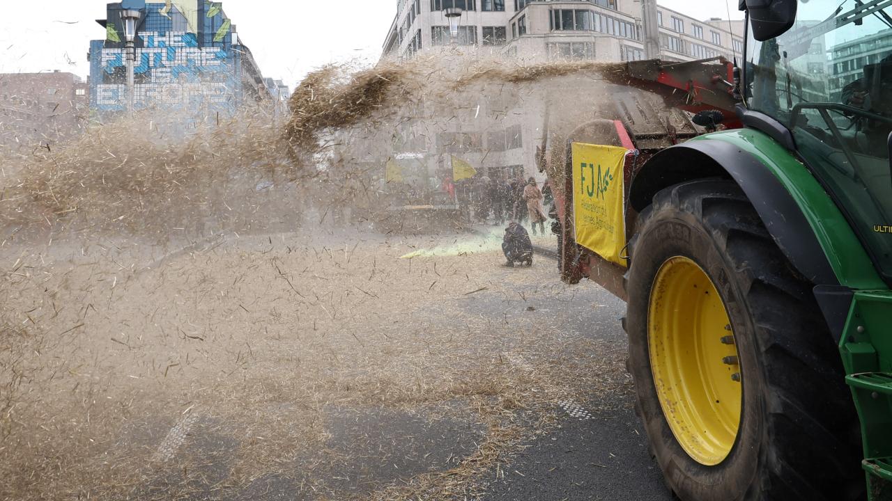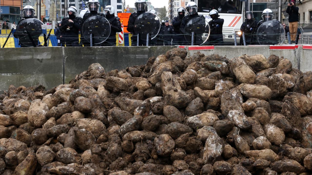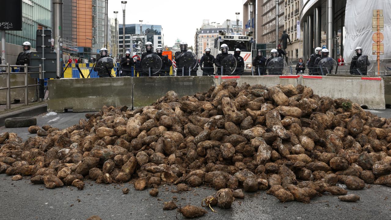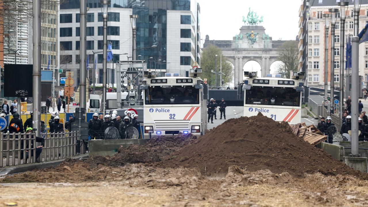 AB ülkelerinin tarım bakanlarının toplantı yaptığı bina önündeki ana yol Rue de la Loi`yı trafiğe kapatan çiftçiler, polis barikatıyla karşılaştı. Polis barikatının önüne önce saman püskürten çiftçiler, daha sonra römorklarla şeker pancarı, tahta palet ve tezek döktü.