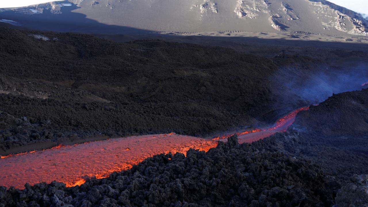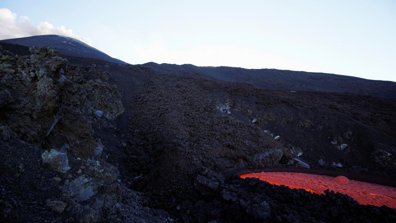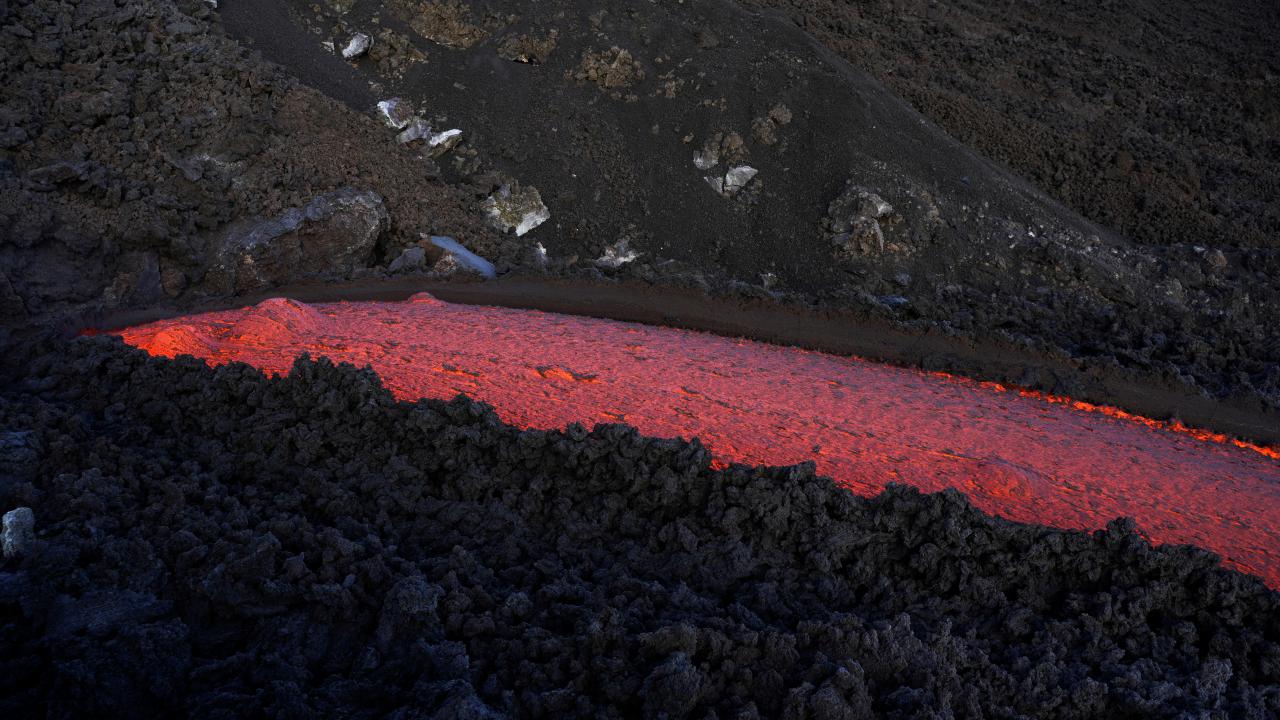 Etna Yanardağı'nda görülen volkanik faaliyet sonrası yanardağın güneydoğu kraterinden uzun kırmızı-sıcak lav akıntıları akıyor.