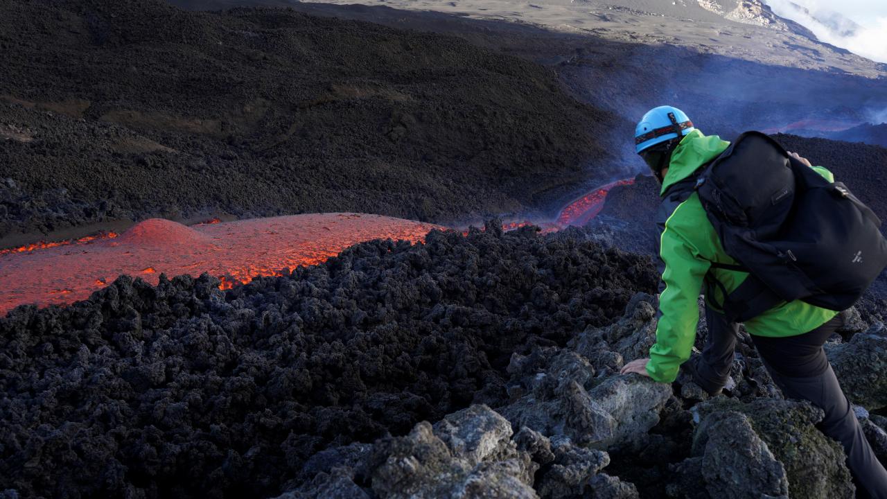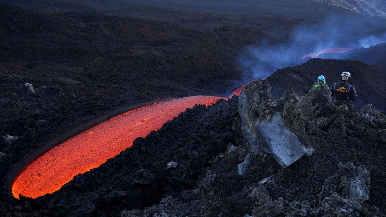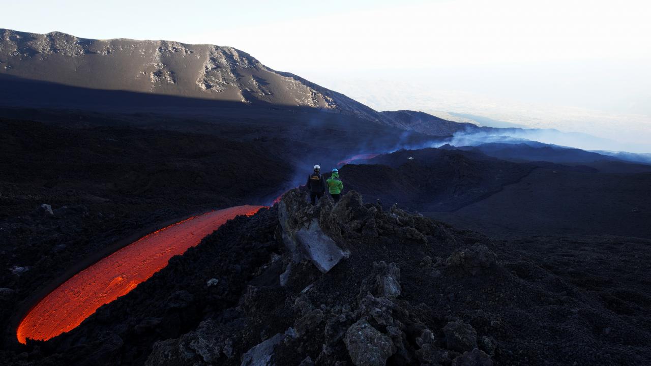 İtalya Ormancılık Departmanı üyeleri, Avrupa`nın en yüksek ve en aktif yanardağı Etna Dağı`nın güneydoğu kraterinden aşağı akan lavları izliyor.