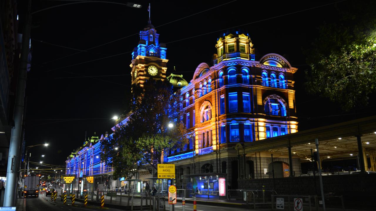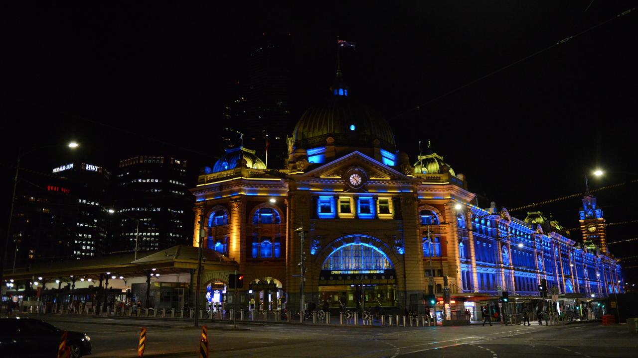 Avustralya’nın Melbourne kentindeki Flinders Tren İstasyonu, Federasyon Meydanı ve bazı köprüler Ukrayna’ya destek vermek amacıyla Ukrayna bayrağındaki sarı ve mavi renklerle ışıklandırıldı.