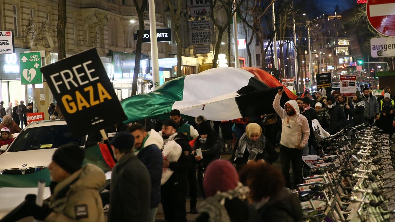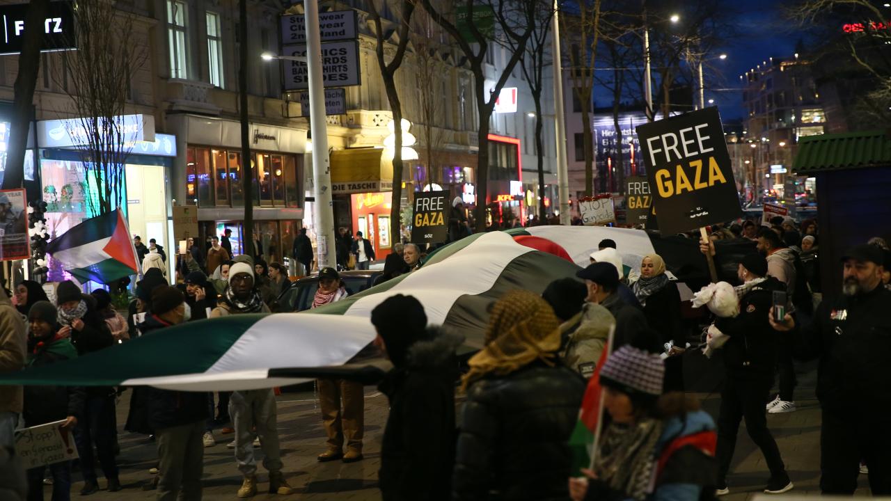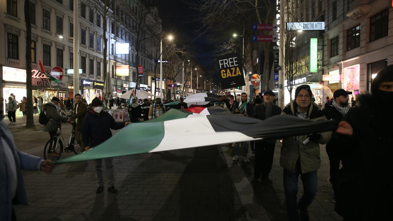 Başkentin önemli caddelerinden Mariahilfer’de toplanan göstericiler, Filistin bayraklarının yanı sıra, "Çocuklar katledilmesine son", "Hemen ateşkes", "Özgür Gazze" yazılı pankartlar açtı.
