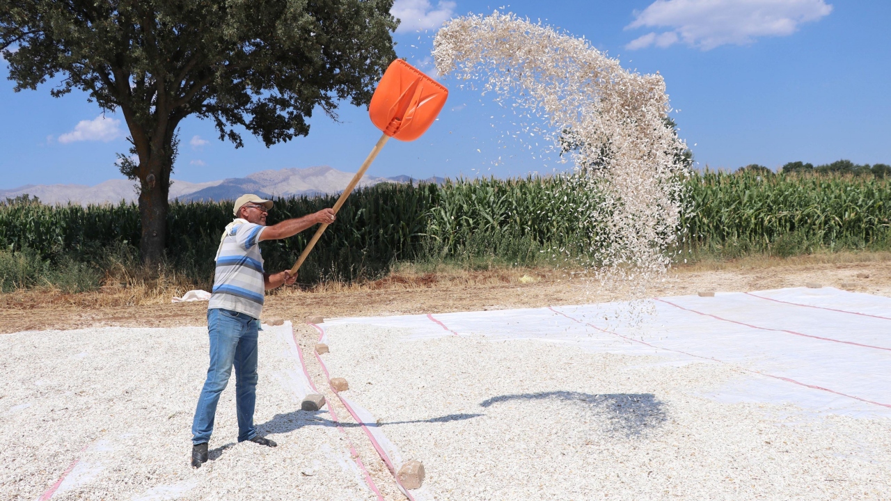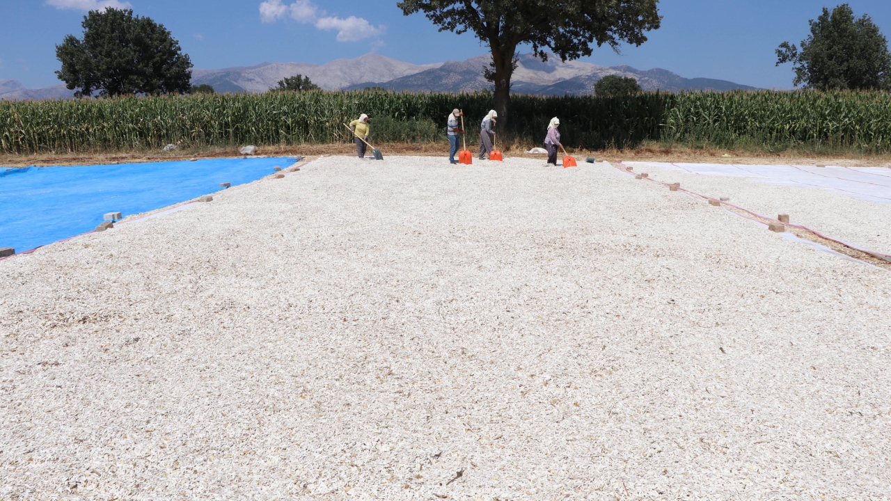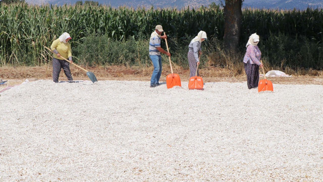 Çiftçiler, hasat edilen çekirdeklerini güneşte kurutmaya bırakıyor.