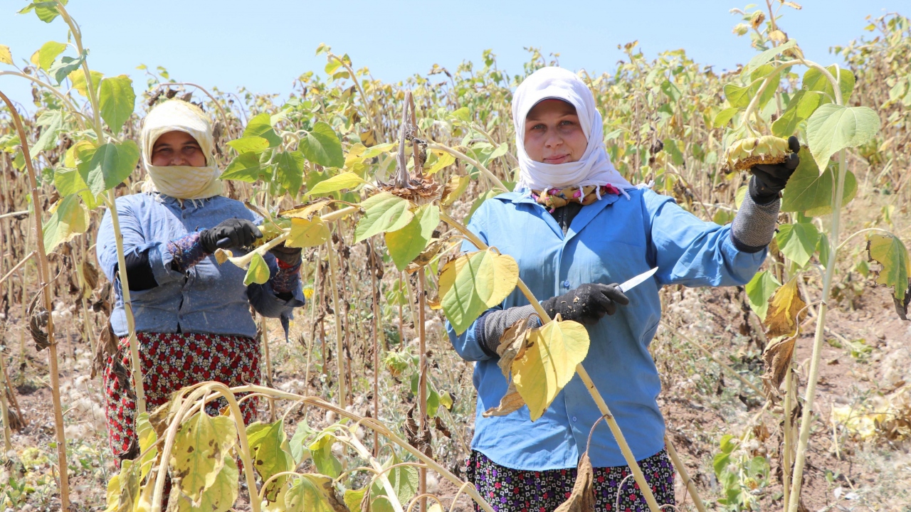 Sabahın erken saatlerinde tarlalara giren çiftçiler, bıçaklarla ay çekirdeklerini topluyor. Ay çekirdekleri, daha sonra tarlaya giren ve traktöre bağlı patoz makinesi ile koçanından ayrıştırılıyor.