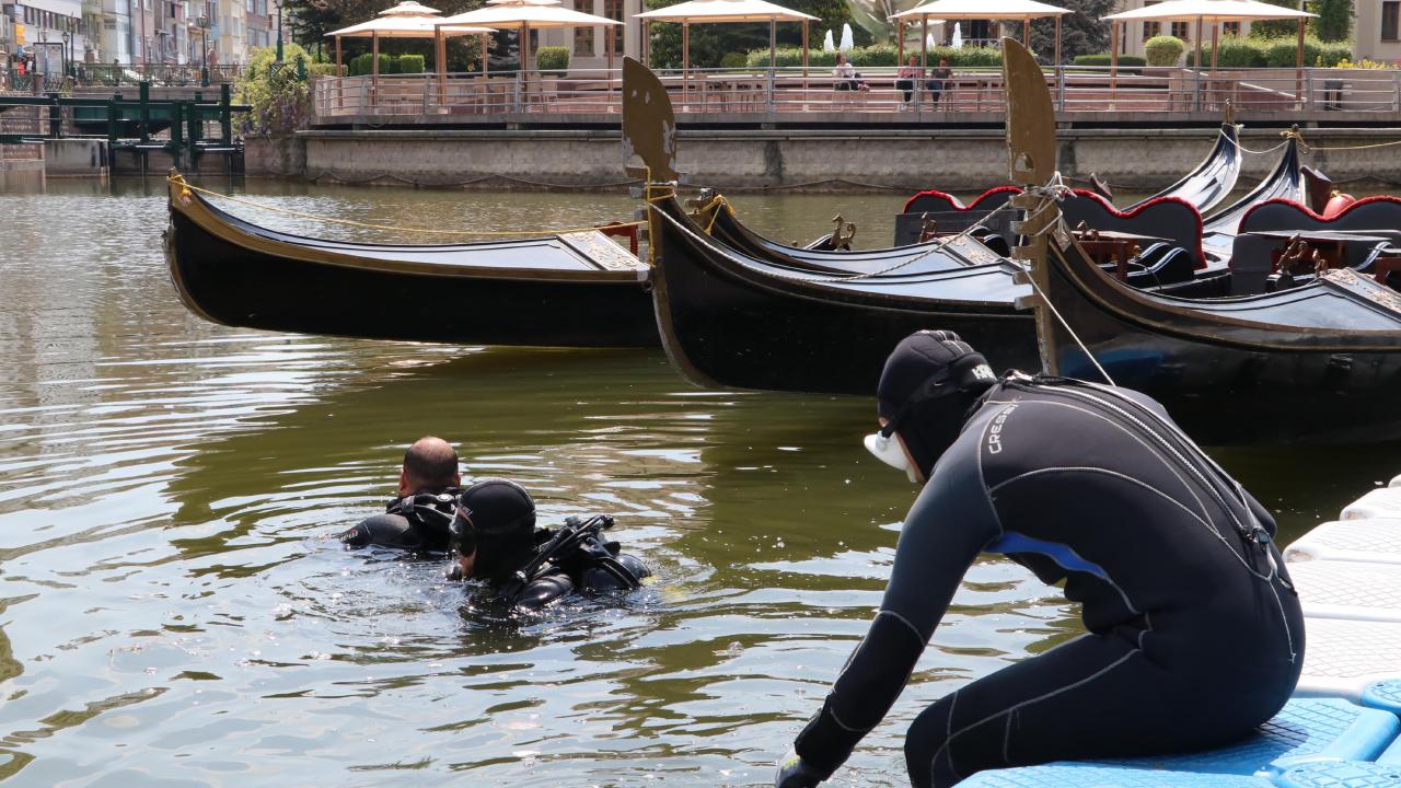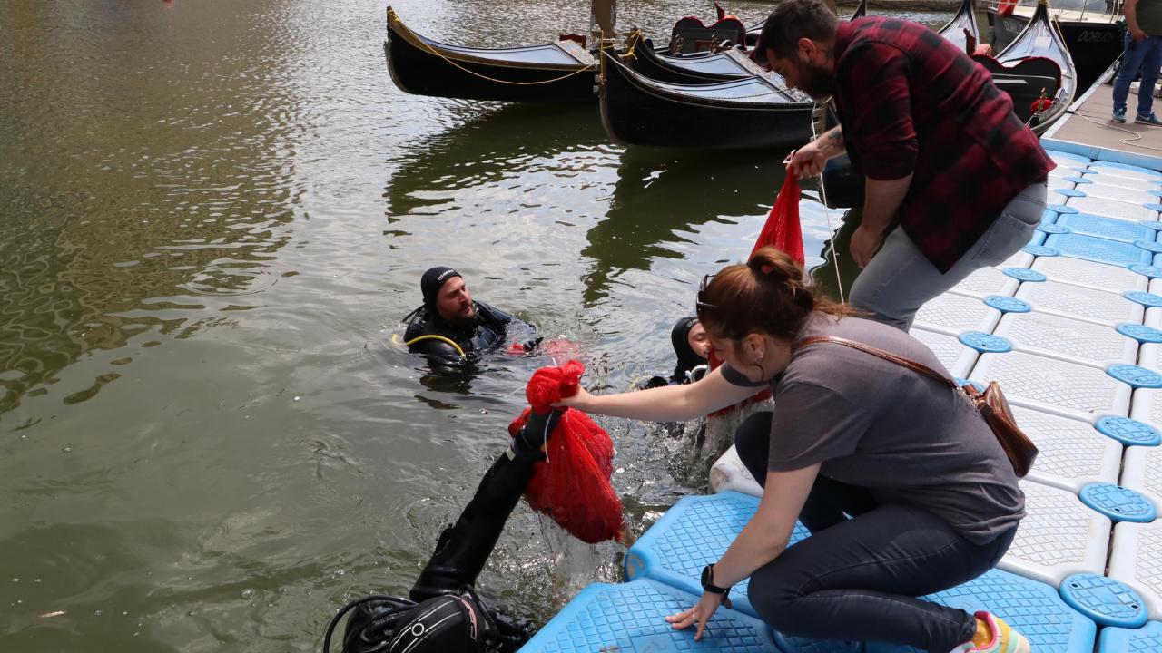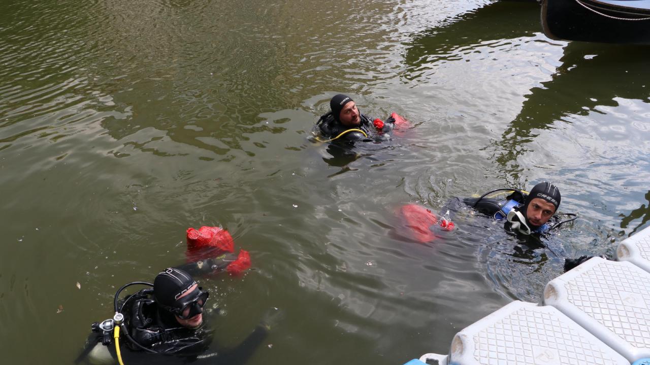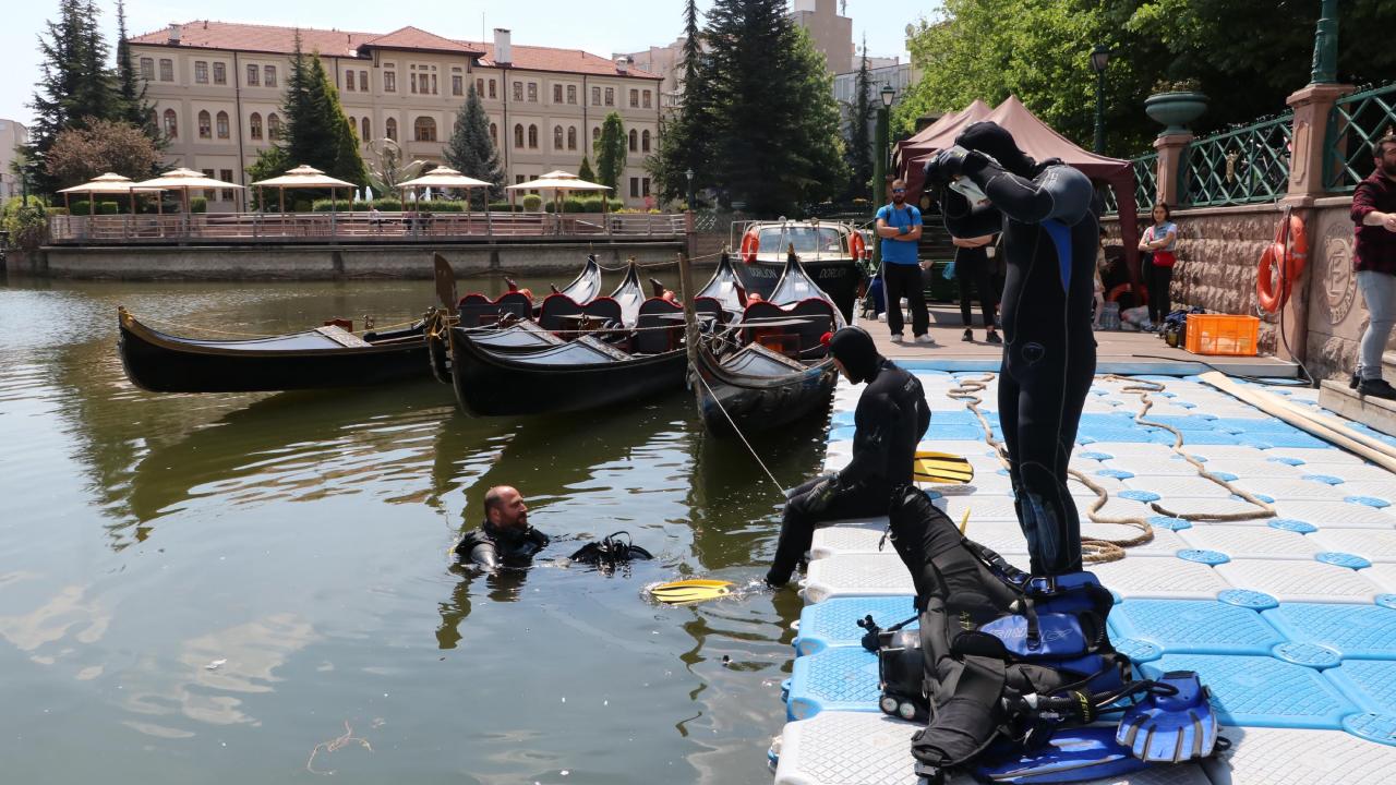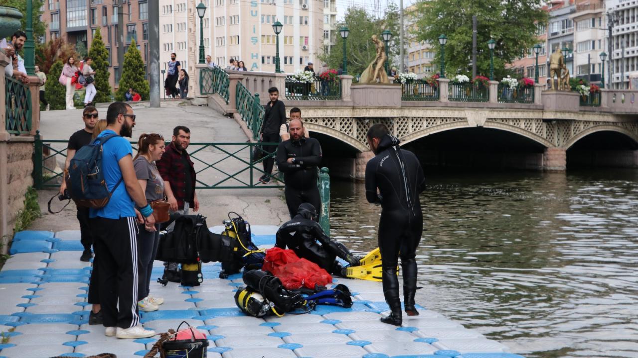 Eskişehir'in en önemli simgelerinden Porsuk Çayı’nda, dalgıçların 10 metrelik alanda 20 dakika süren çalışmasıyla mont, çocuk ayakkabısı, cam şişe, ambalaj ve maskelerin de bulunduğu 3 çuval çöp çıkarıldı.