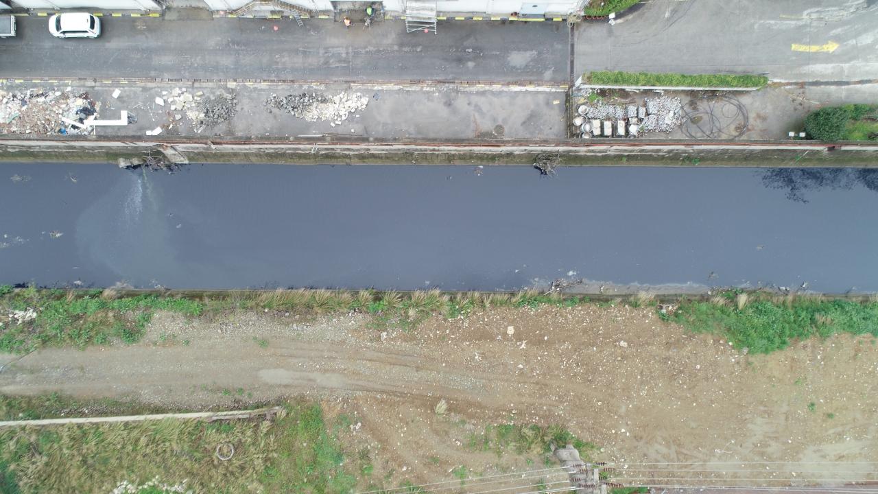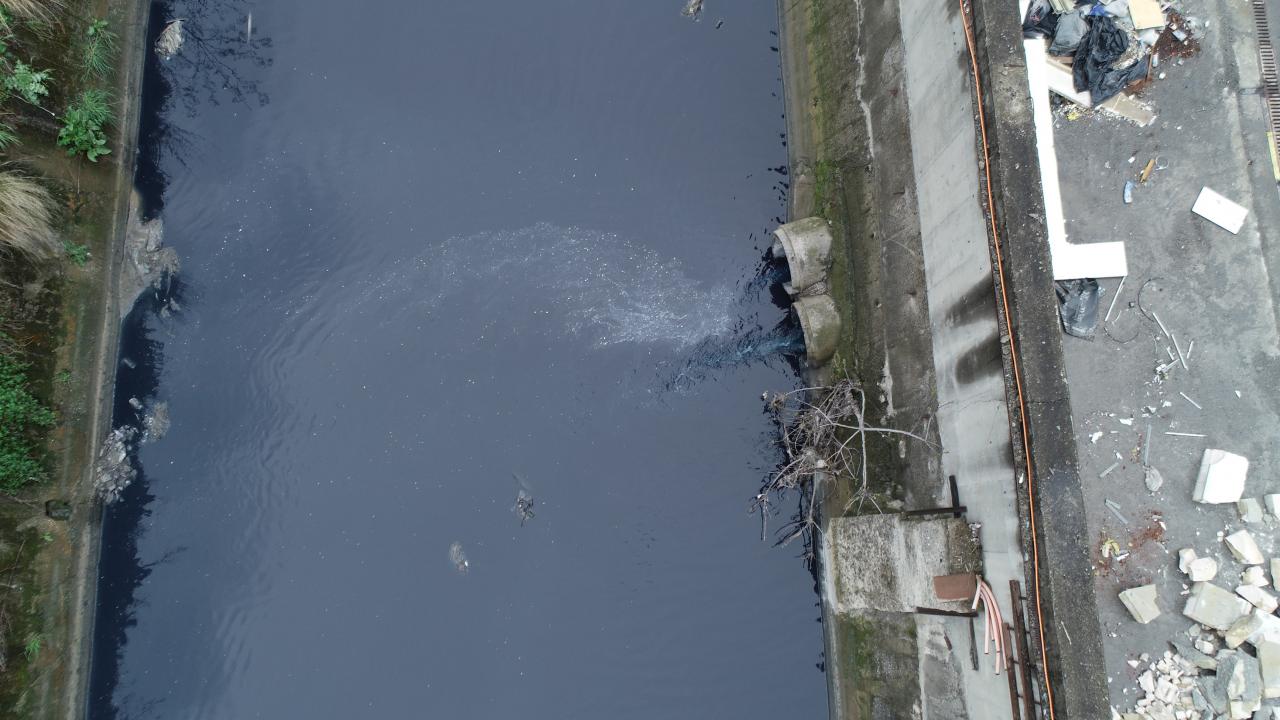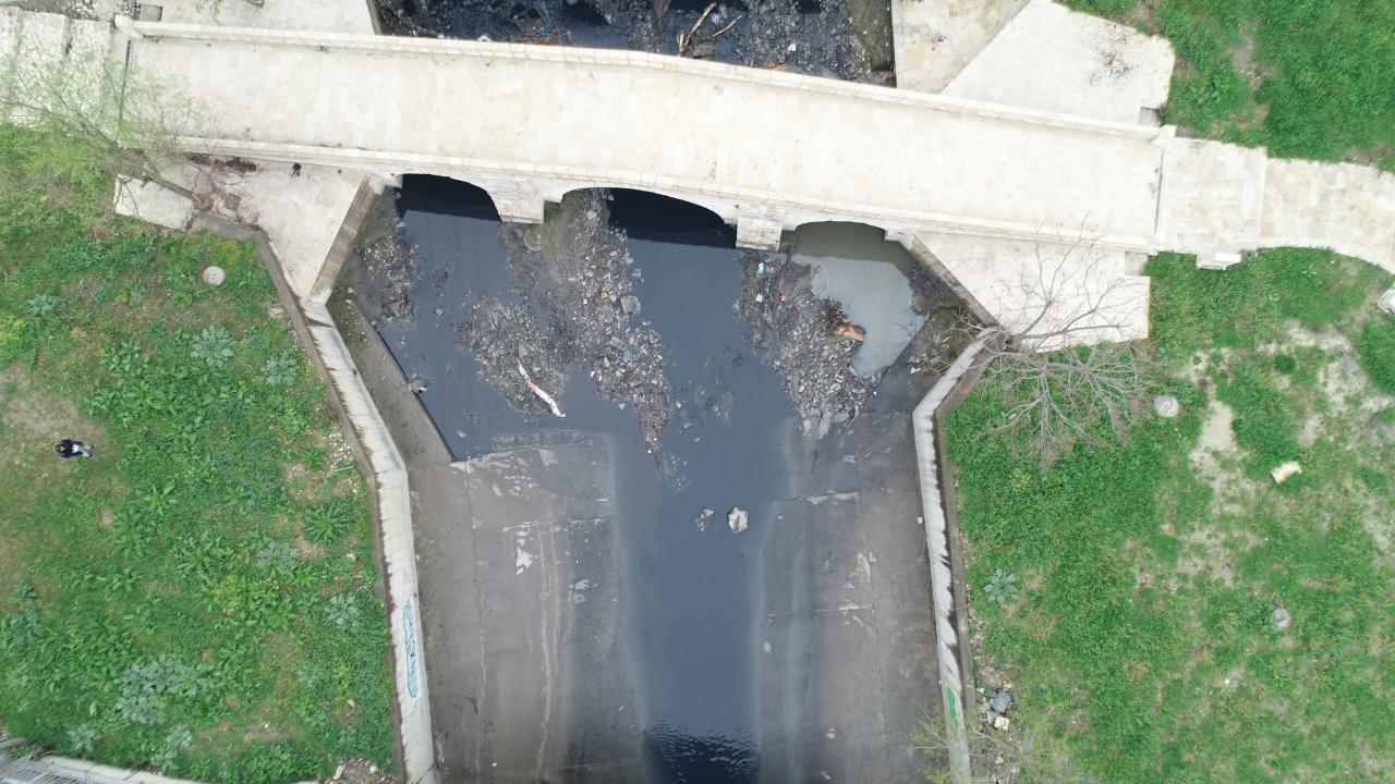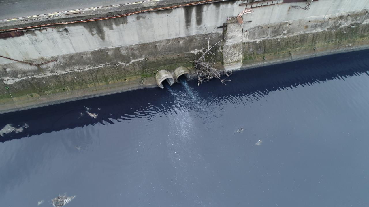 Renk değişimine neden olan atık suyun Küçükçekmece bölgesinden Ayamama Deresi`ne döküldüğü bölge havadan görüntülendi.