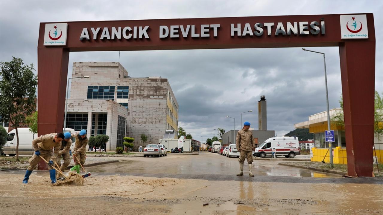 11 Ağustos’taki selde zarar gören ve daha sonra kısmi olarak hizmete açılan Ayancık Devlet Hastanesi çevresinde ise su taşkınına karşı önlemler alındı.