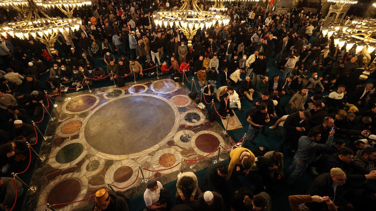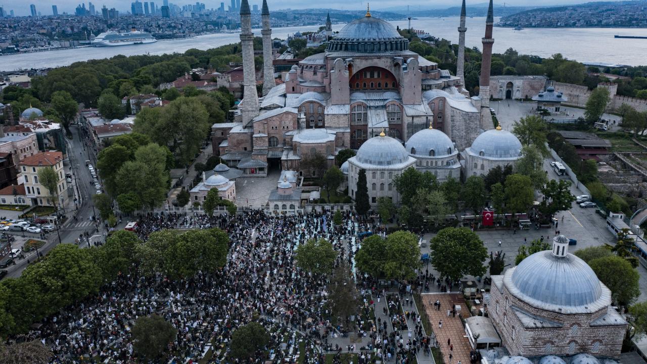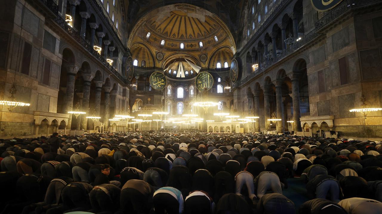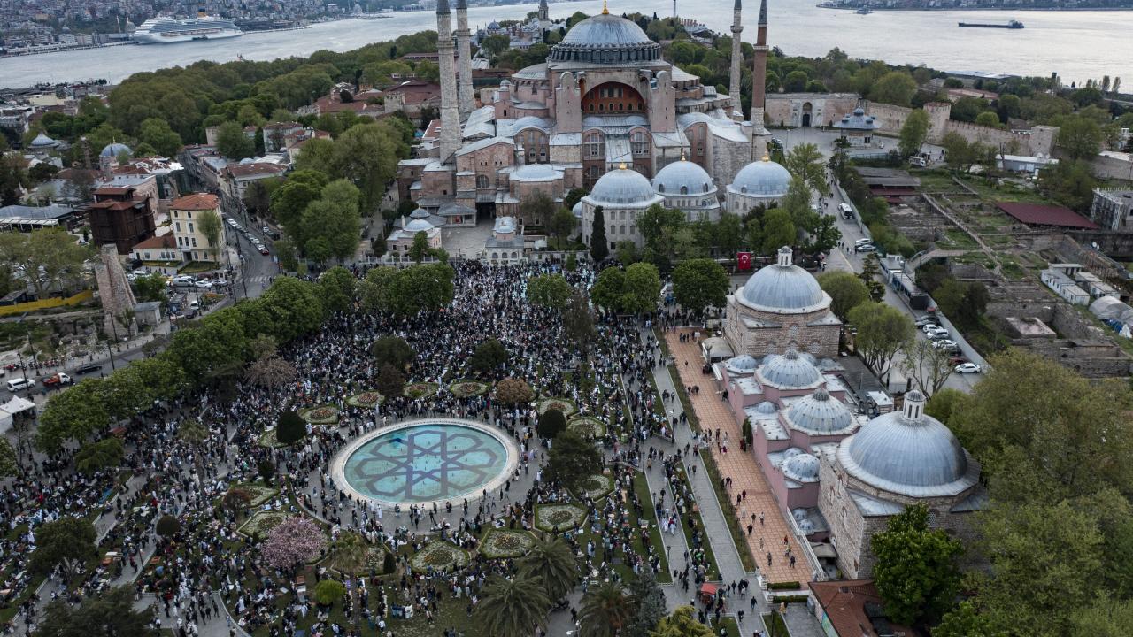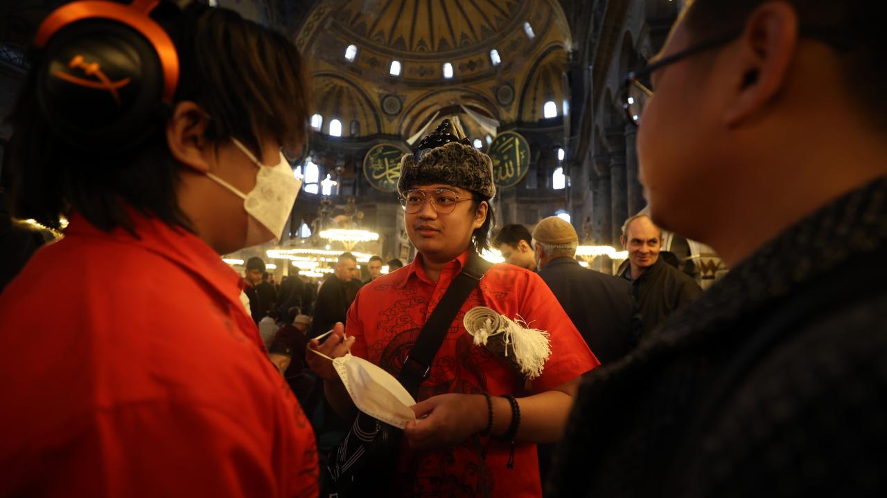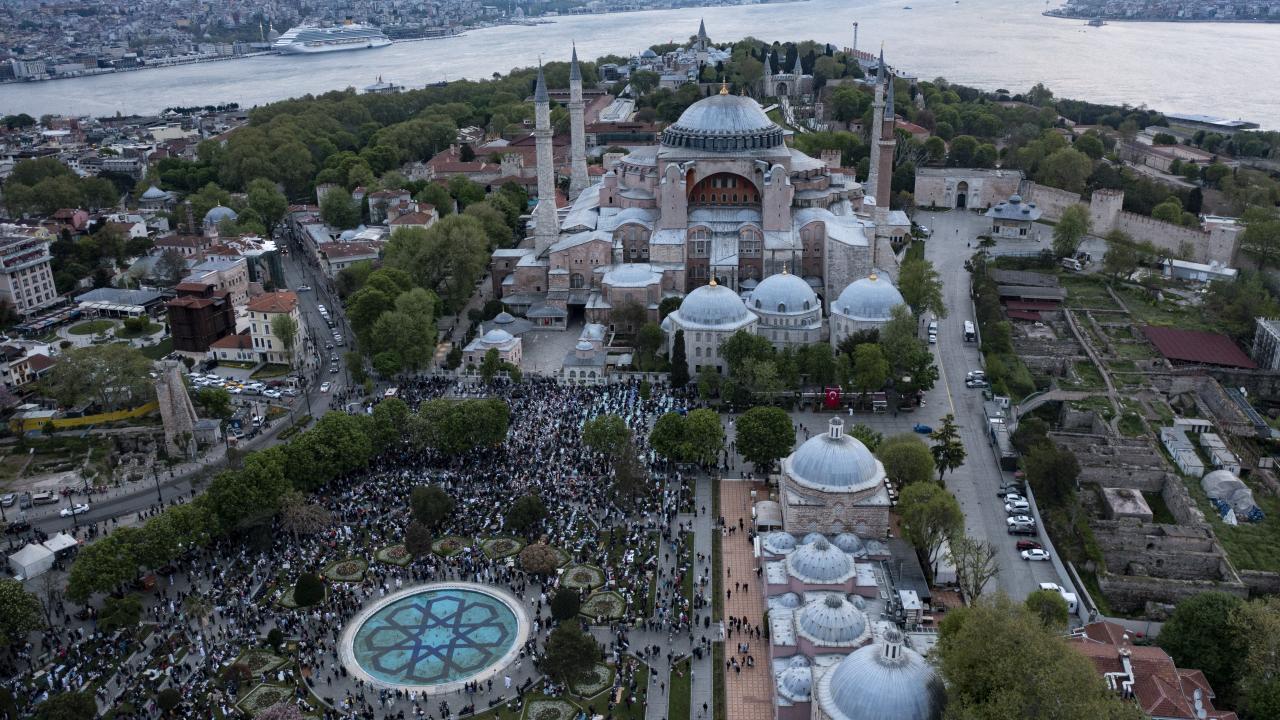 Caminin içi bayram namazı vaktinden önce dolarken, İstanbul`un yanı sıra başka kentlerden ve yurt dışından gelenler namaz için Ayasofya Meydanı`nı doldurdu.