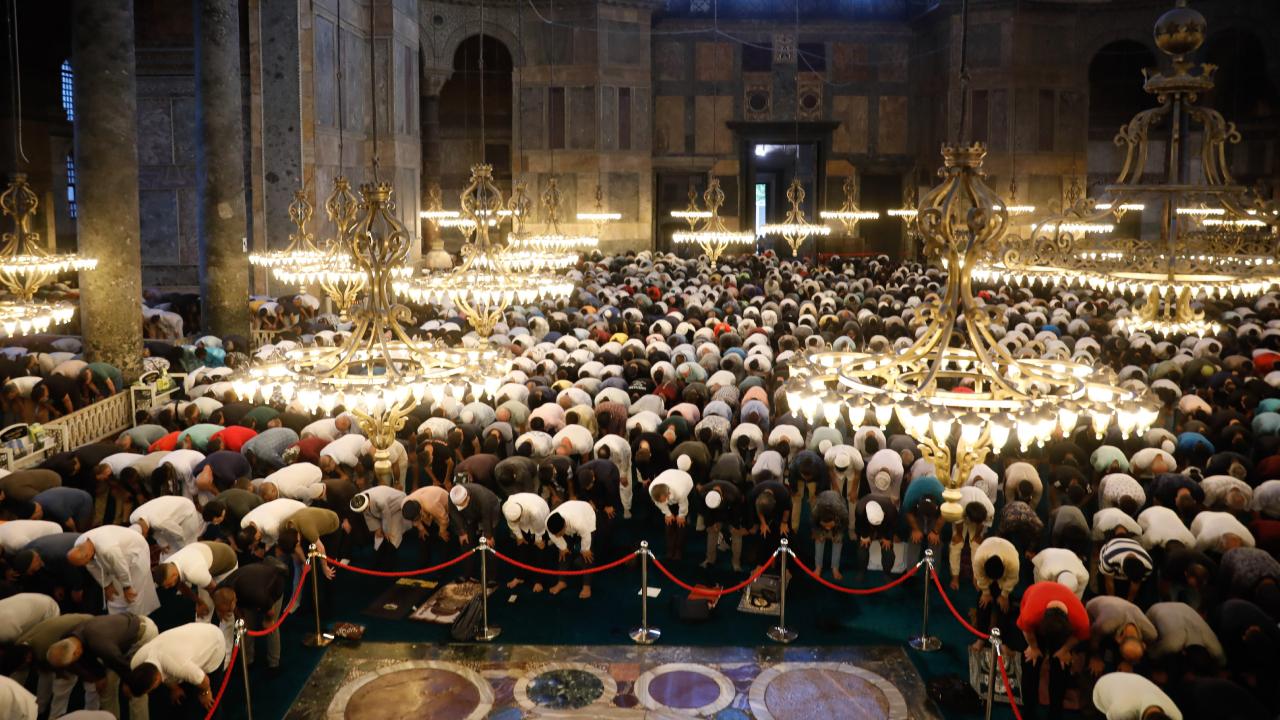 Sabahın erken saatlerinde sokaklarda bayram namazı hareketliliği yaşandı. Bayram namazını kılacak vatandaşlar, camileri doldurdu. Ayasofya-i Kebir Camii, gece saatlerinde dolmaya başladı. İçeride yer bulamayanlar seccadeleri caminin avlusuna serdi.