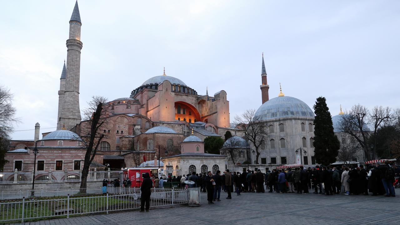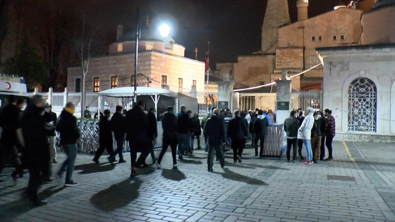 Ayasofya Cami’ne vatandaşlar akın etti. Cami avlusu ve kapısında uzun kuyruklar oluştu.