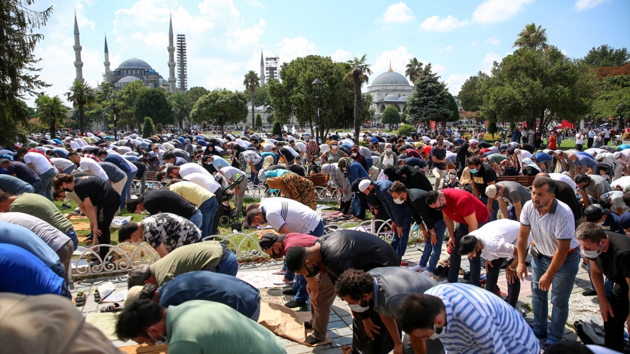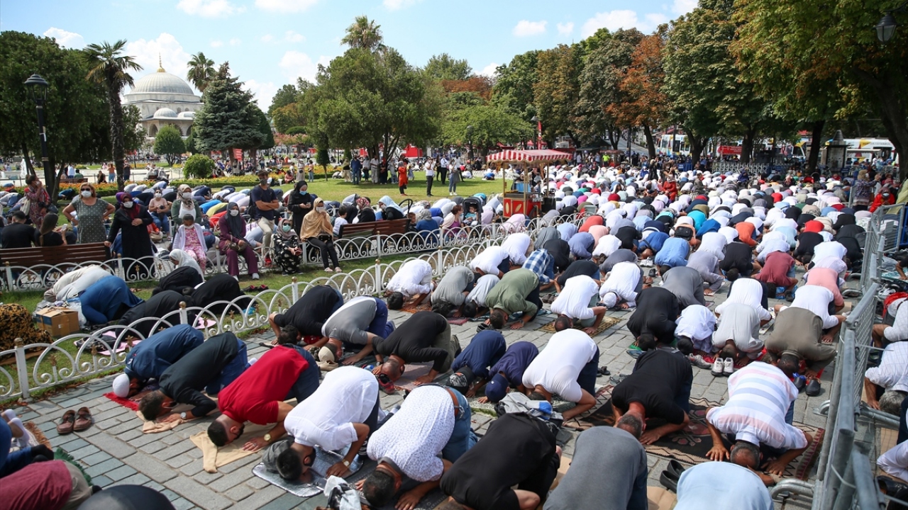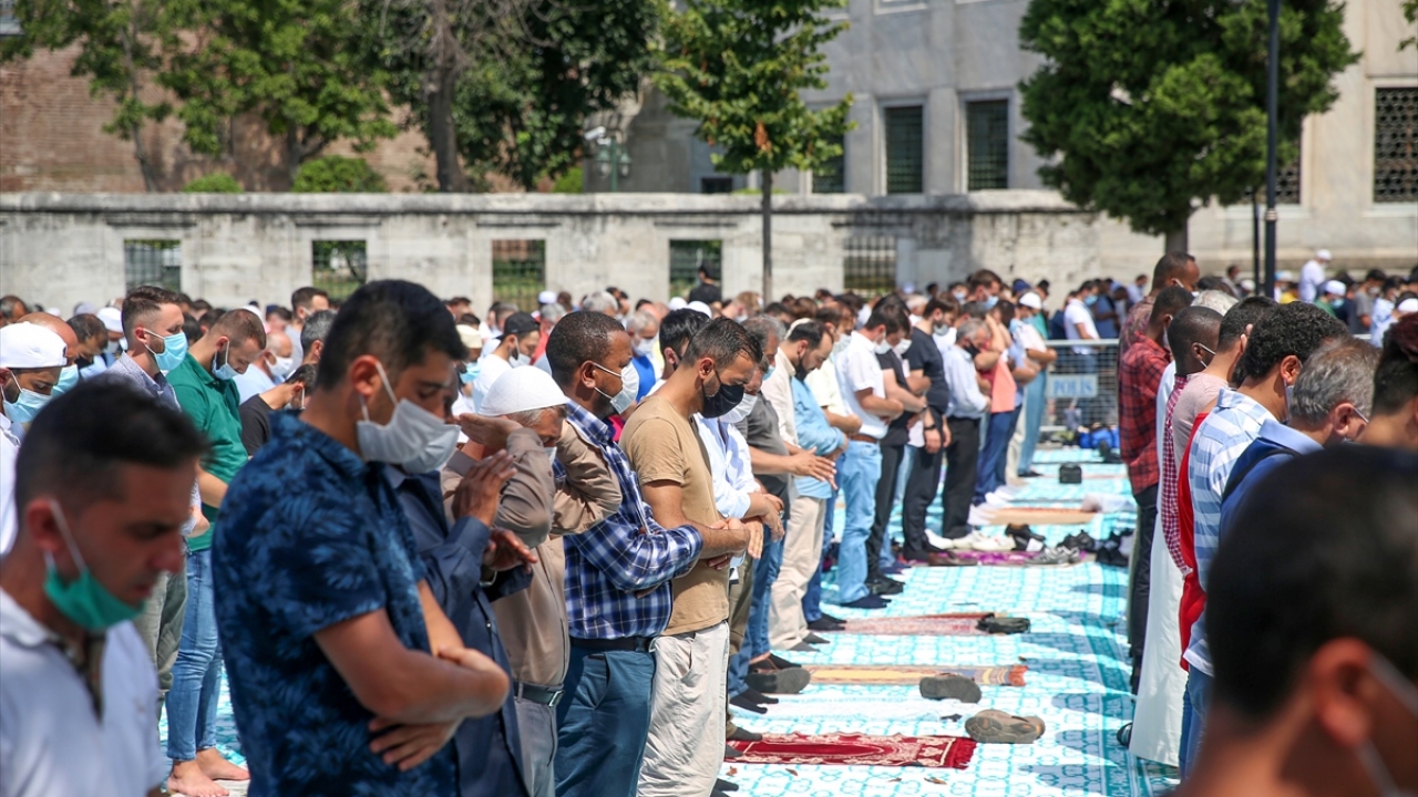 Cami içinin dolmasının ardından cemaatin bir kısmı, Ayasofya Meydanında belirlenen alanlarda sosyal mesafeyi gözeterek saf tuttu.