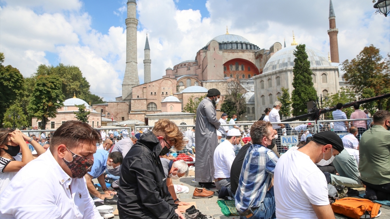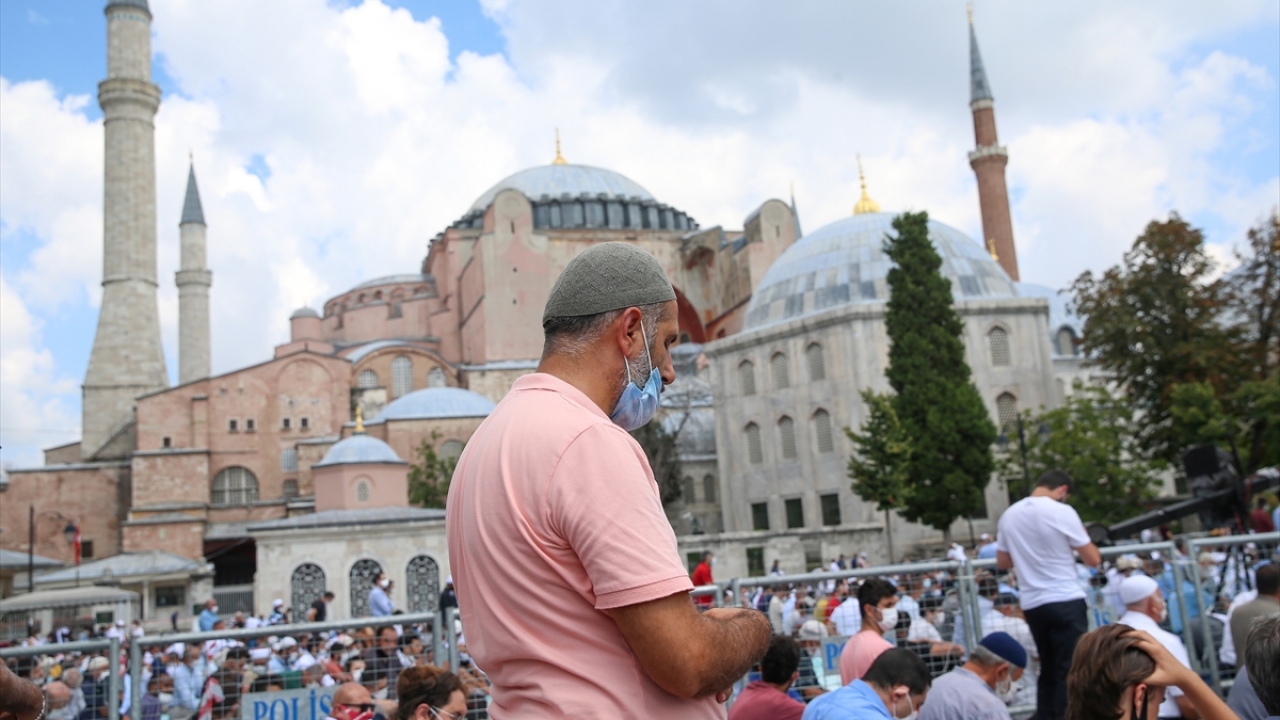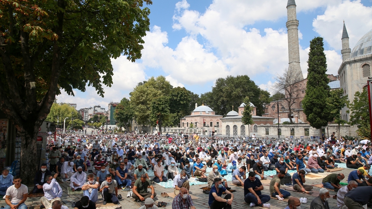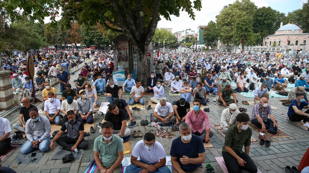 Cami içinin dolmasının ardından cemaatin bir kısmı, Ayasofya Meydanında belirlenen alanlarda sosyal mesafeyi gözeterek saf tuttu.
