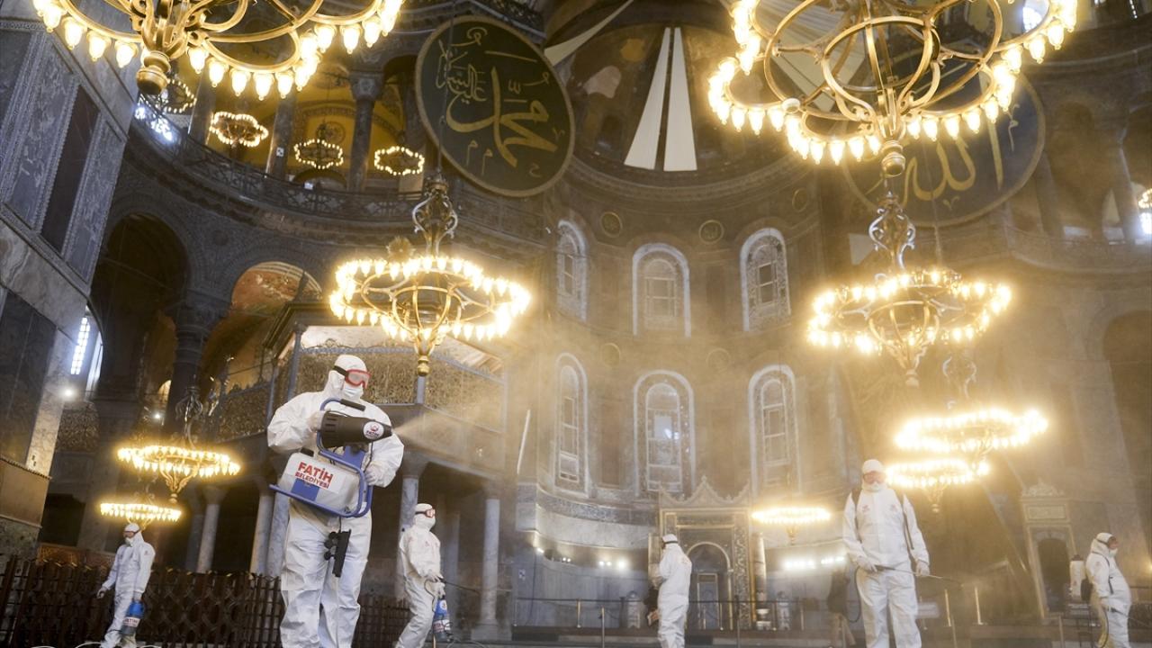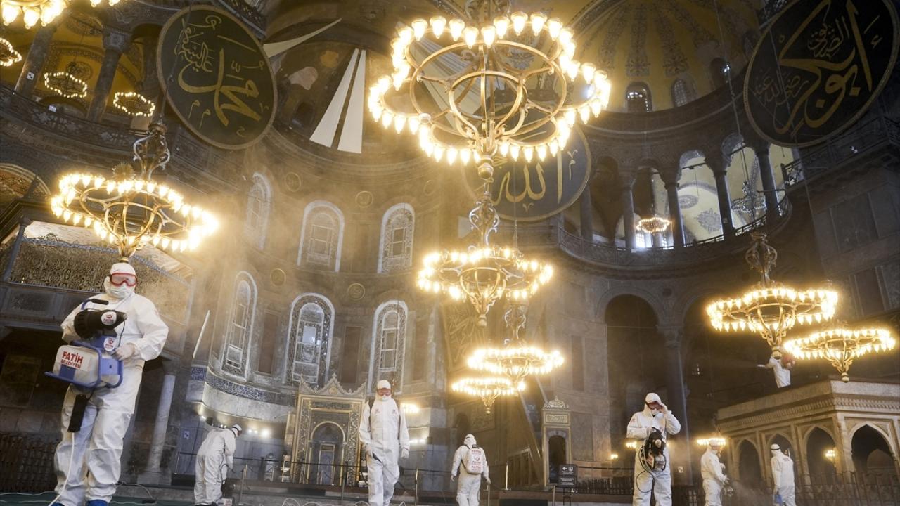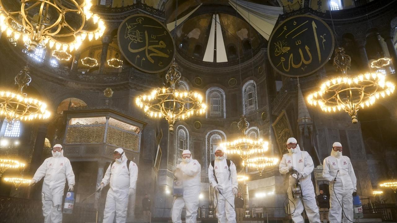 Caminin içine ve dışına da gül suyu sıkılırken, şadırvan, cami avlusu ve Ayasofya Meydanı sıcak suyla yıkandı.