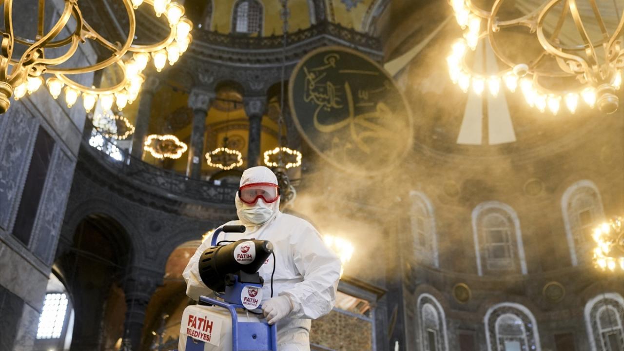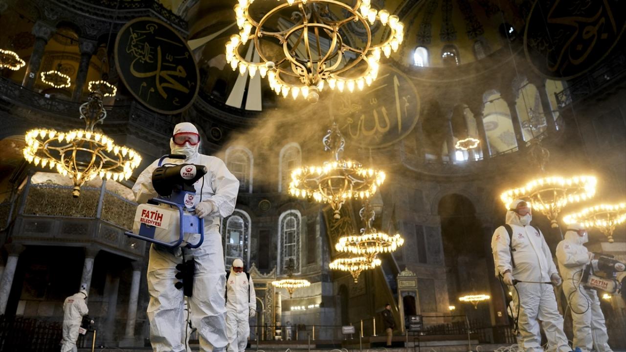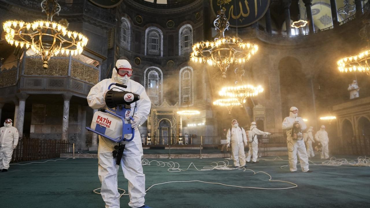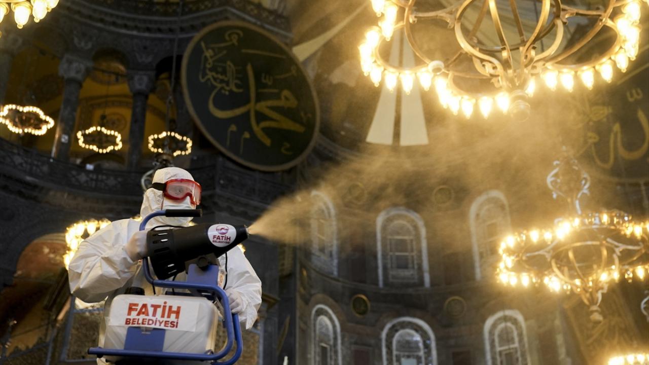 Caminin içine ve dışına da gül suyu sıkılırken, şadırvan, cami avlusu ve Ayasofya Meydanı sıcak suyla yıkandı.