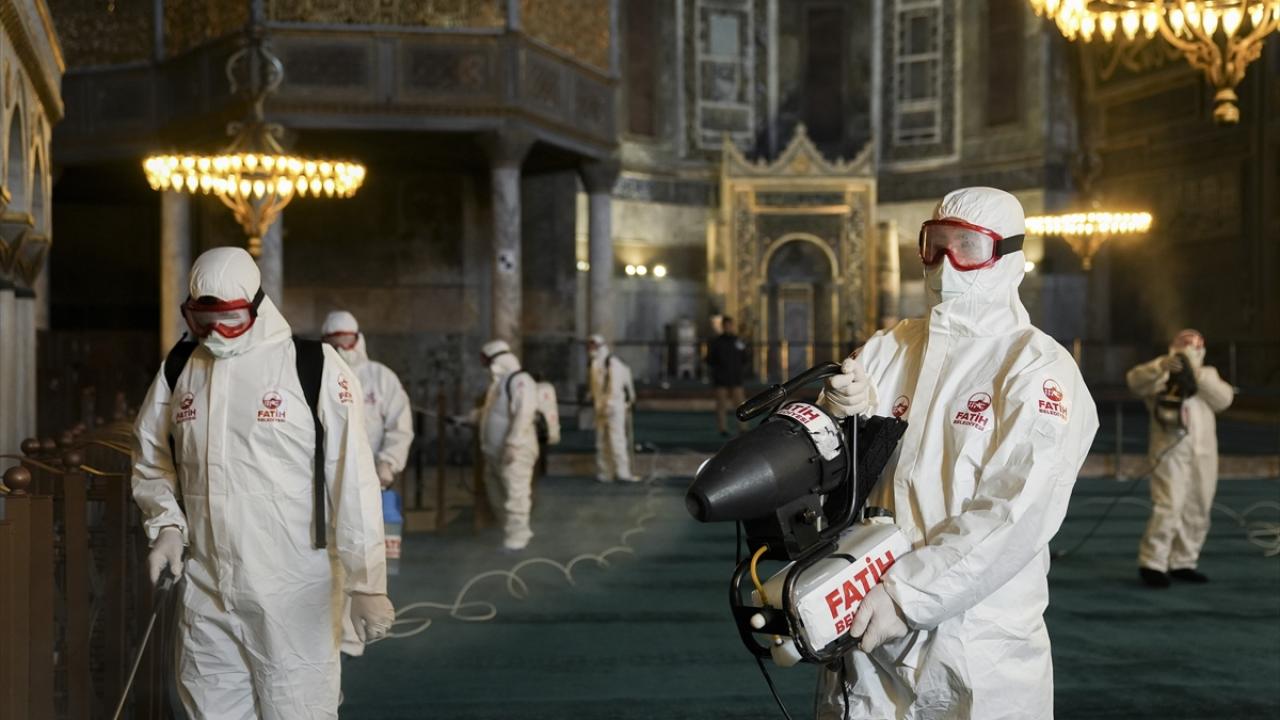 Halılar elektrik süpürgeleriyle süpürüldü, tozu alınan ayakkabılıklara ve caminin içine dezenfektan sıkıldı.