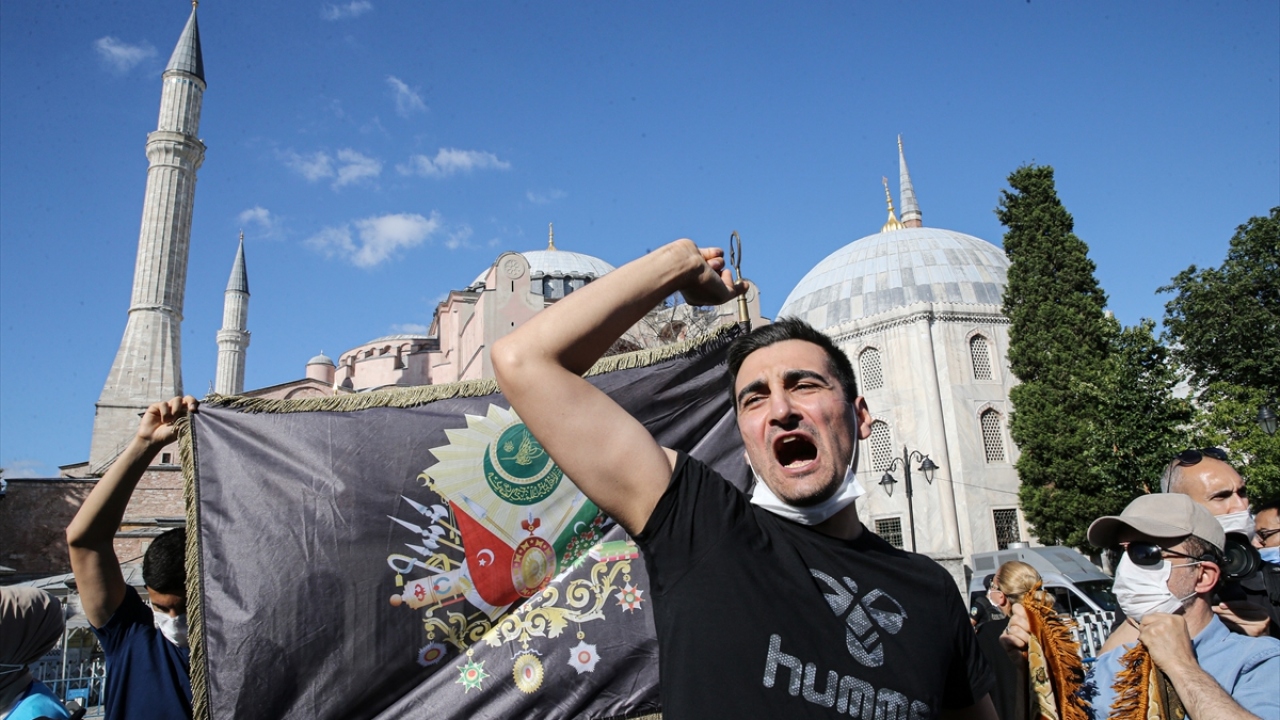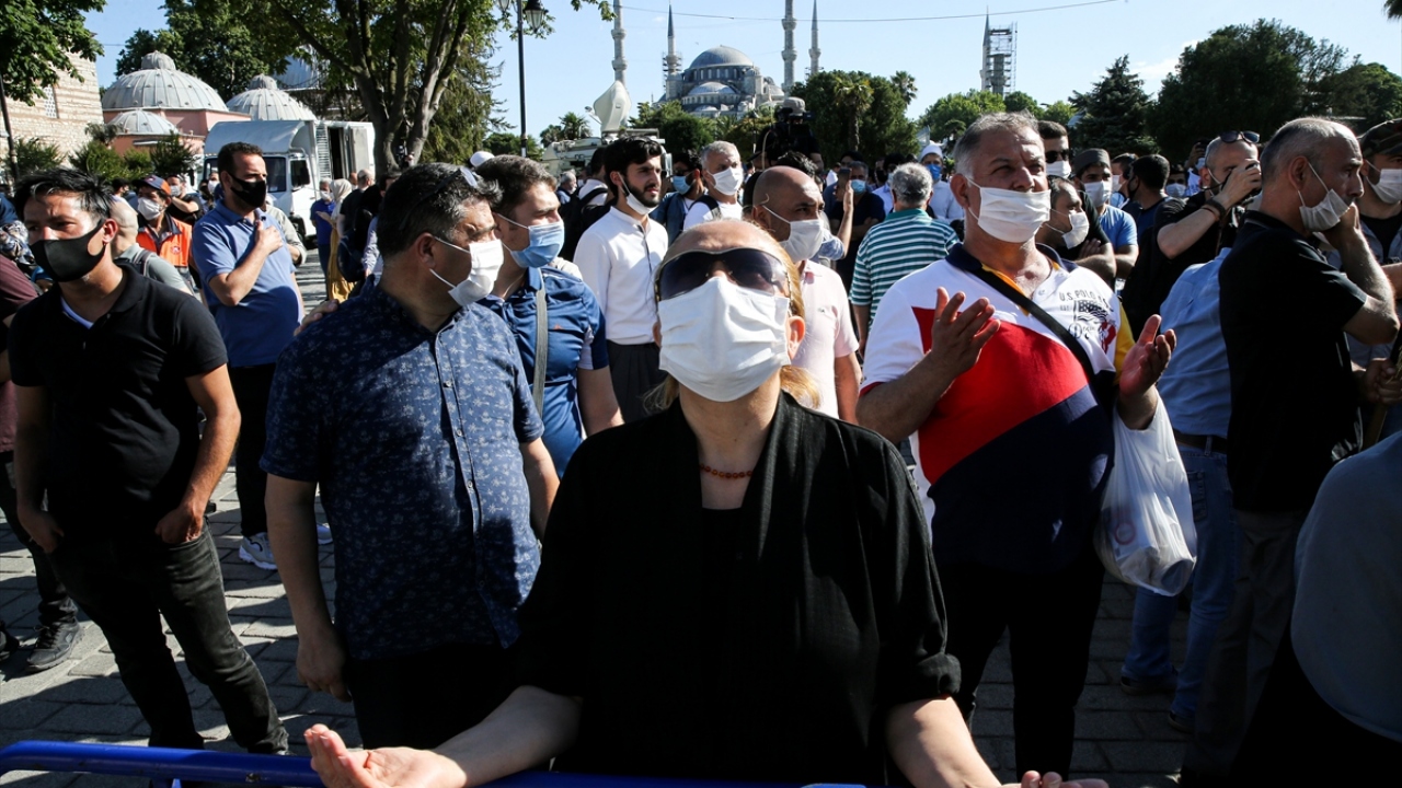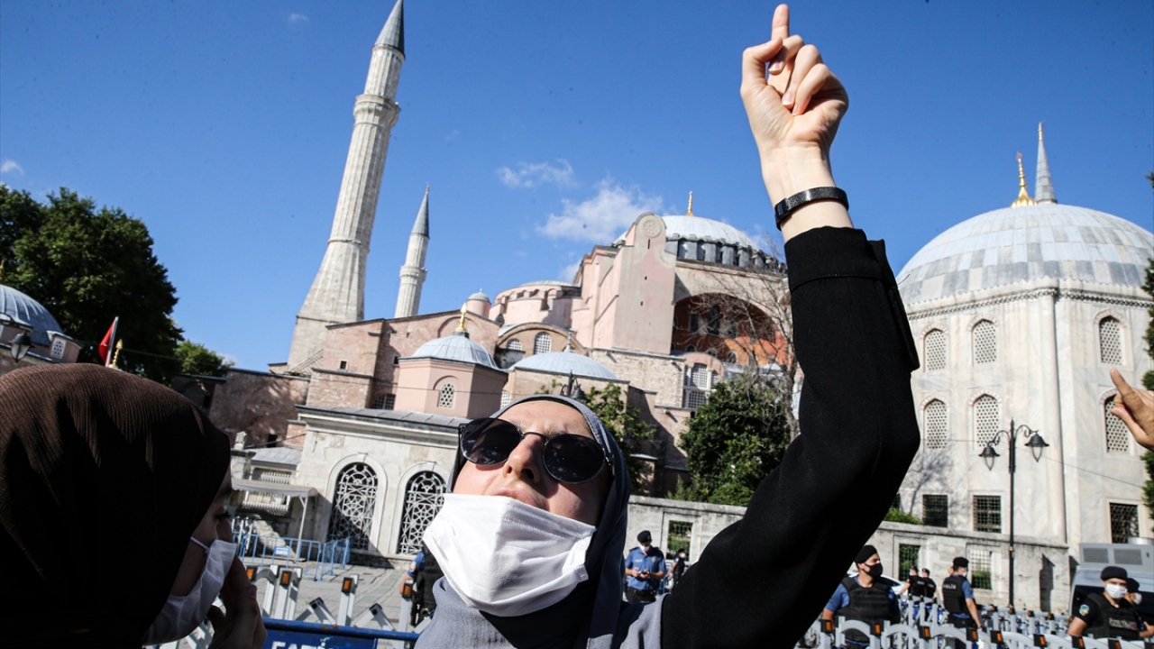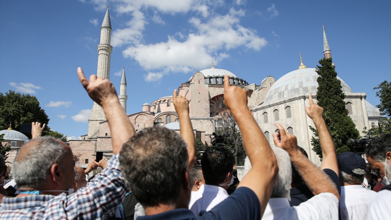 Meydanda toplanan yaklaşık 500 kişi, Cumhurbaşkanı Recep Tayyip Erdoğan`ın Ayasofya`nın Diyanet İşleri Başkanlığına devredilerek ibadete açılmasına yönelik paylaşımının ardından "Recep Tayyip Erdoğan" sloganları attı.