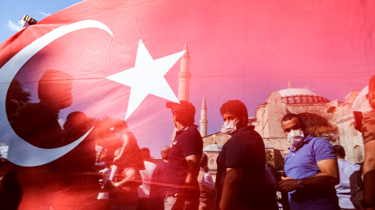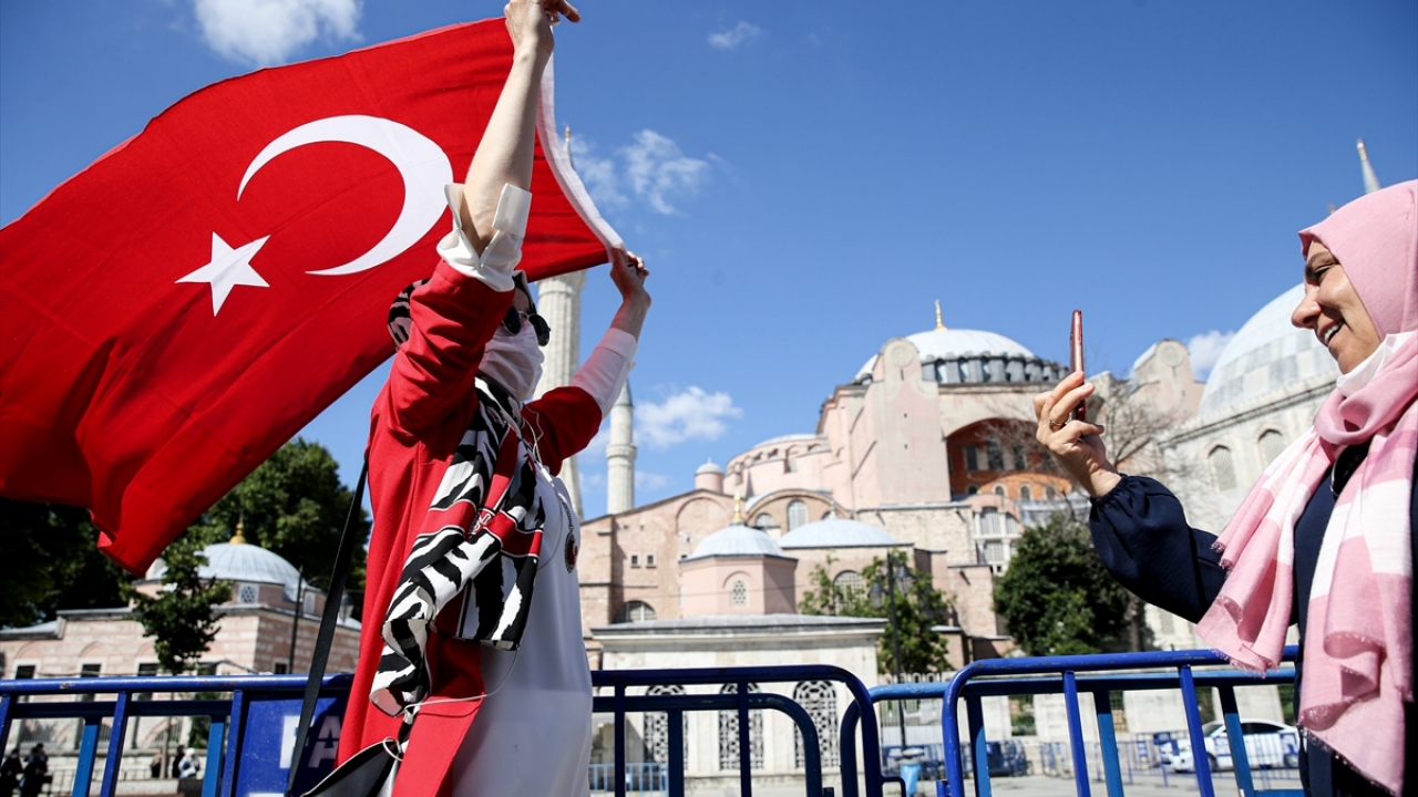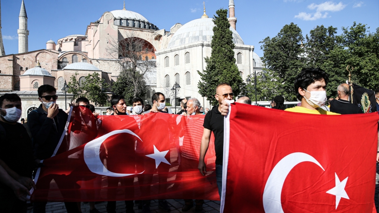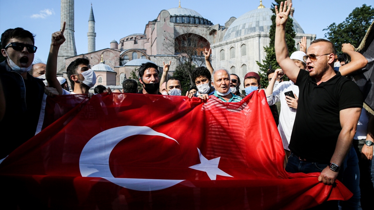 Meydanda toplanan yaklaşık 500 kişi, Cumhurbaşkanı Recep Tayyip Erdoğan`ın Ayasofya`nın Diyanet İşleri Başkanlığına devredilerek ibadete açılmasına yönelik paylaşımının ardından "Recep Tayyip Erdoğan" sloganları attı.