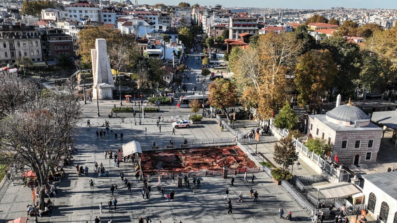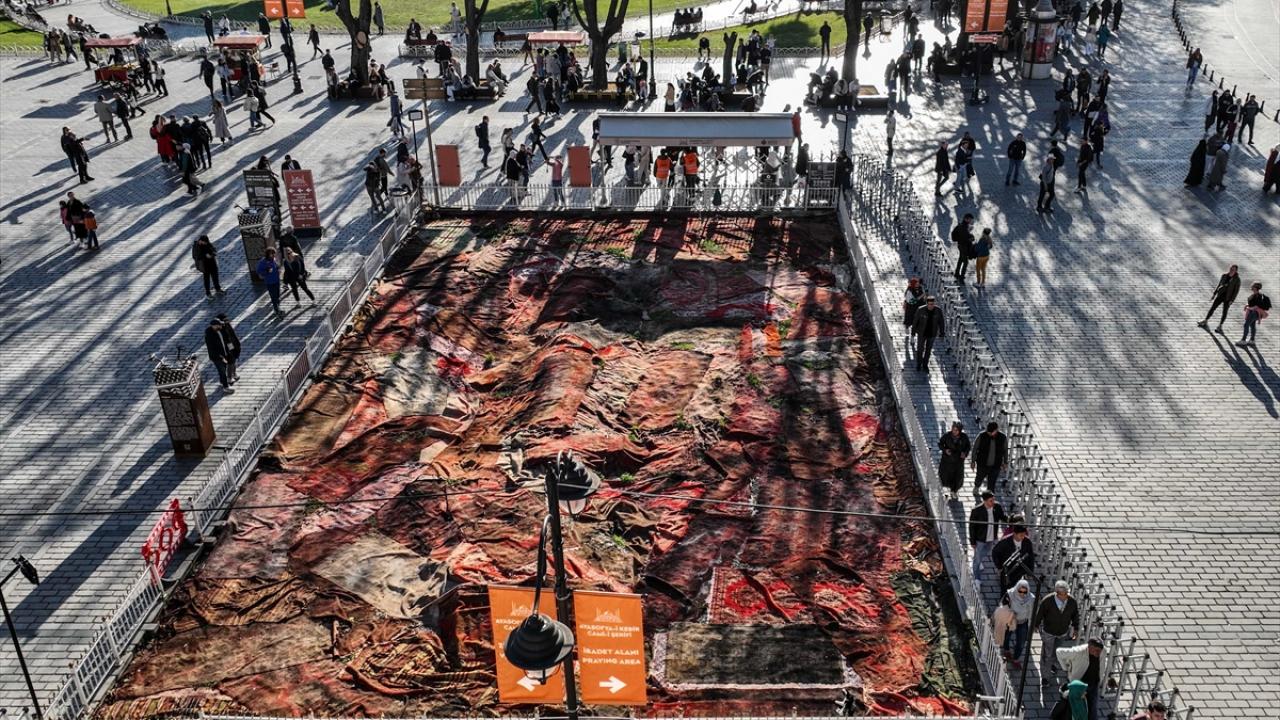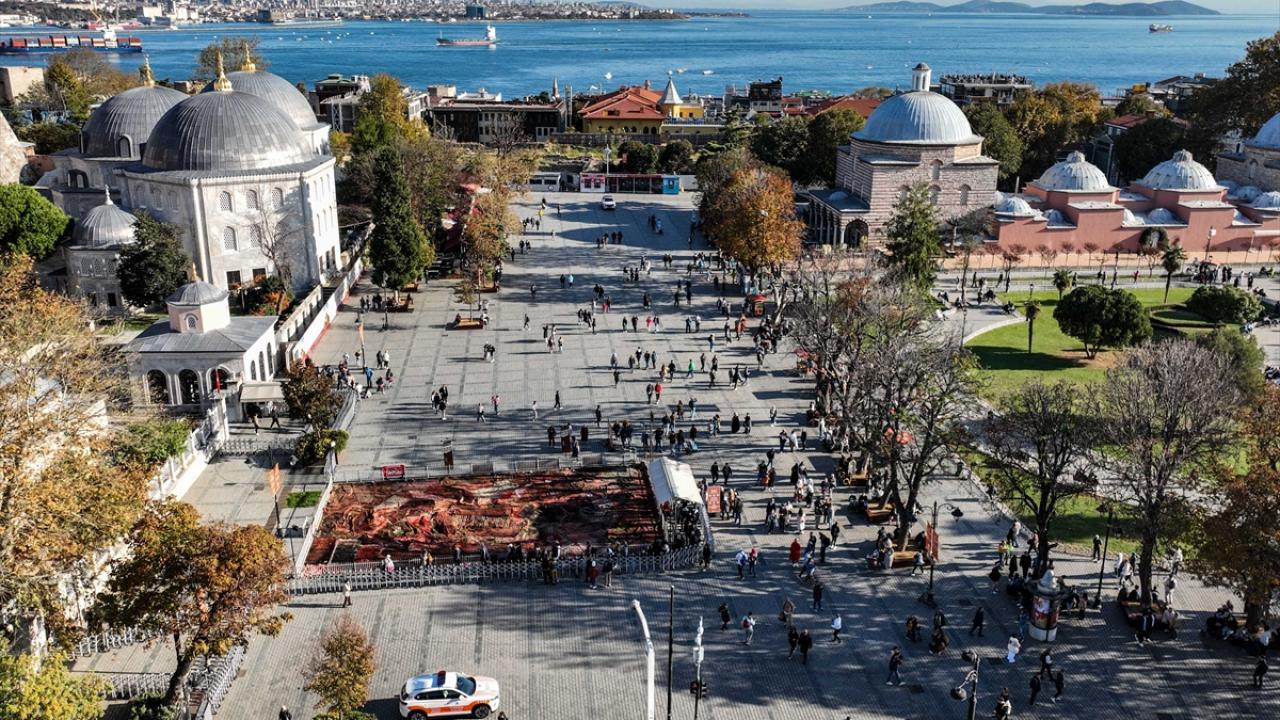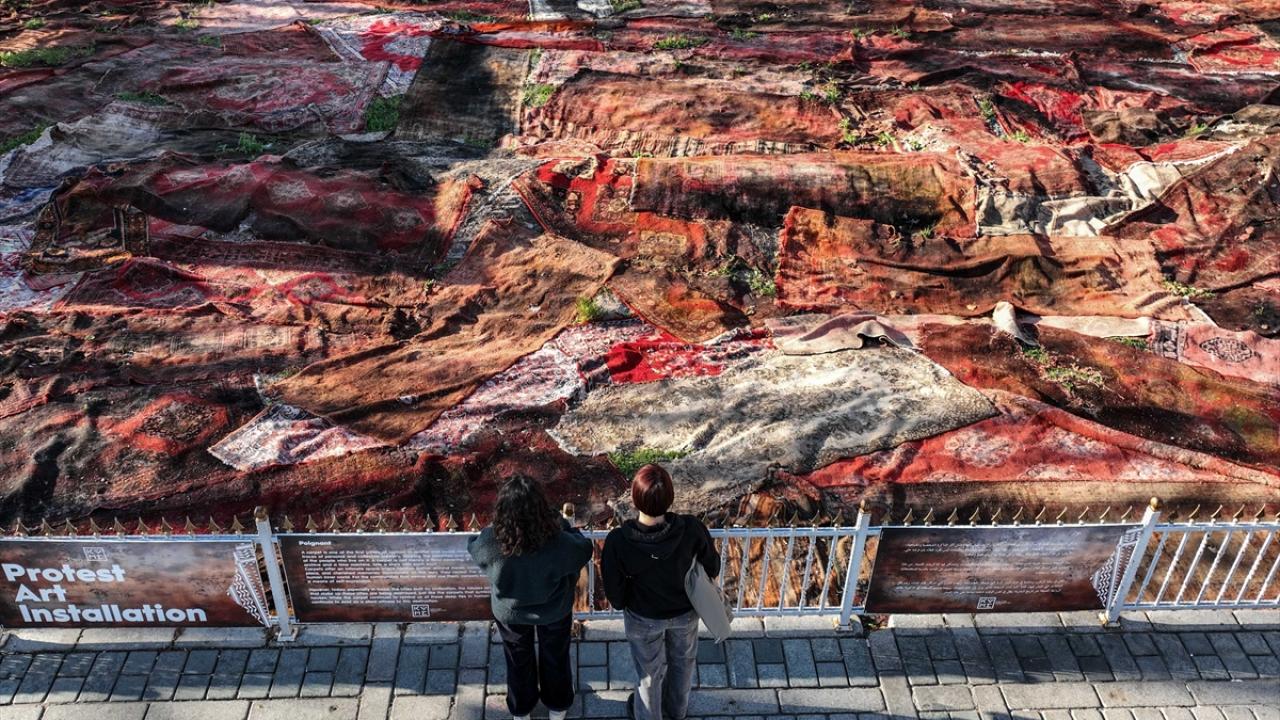 Ayasofya Meydanı`nda kasım sonuna kadar sergilenmesi planlanan sanat yerleştirmesinde, Filistin`deki evlerin parçalanmış halılarını hatırlatan çalışmalar yer alıyor.