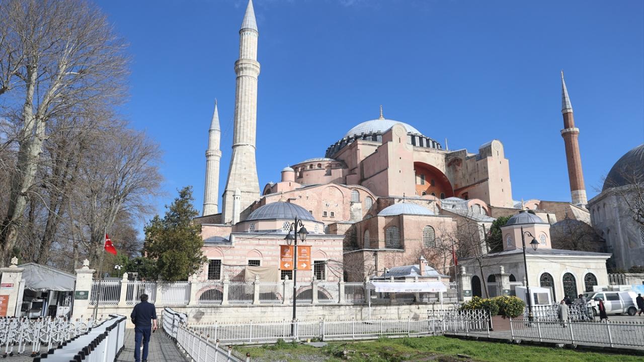 Camiye ibadet için gelen Türk vatandaşları, Sultanahmet Meydanı`ndaki bölümde İmparatorluk kapısından Ayasofya`ya giriş yapıyor.