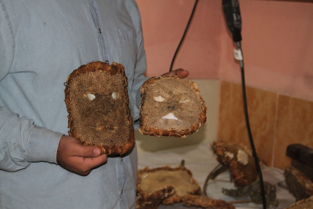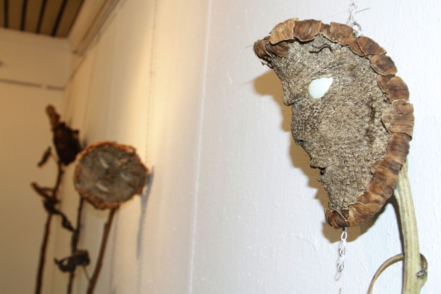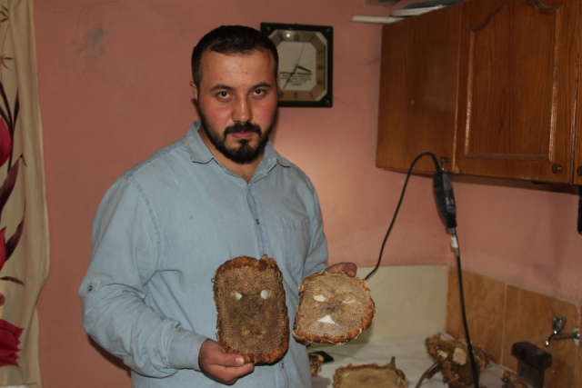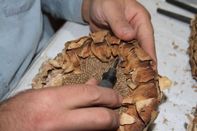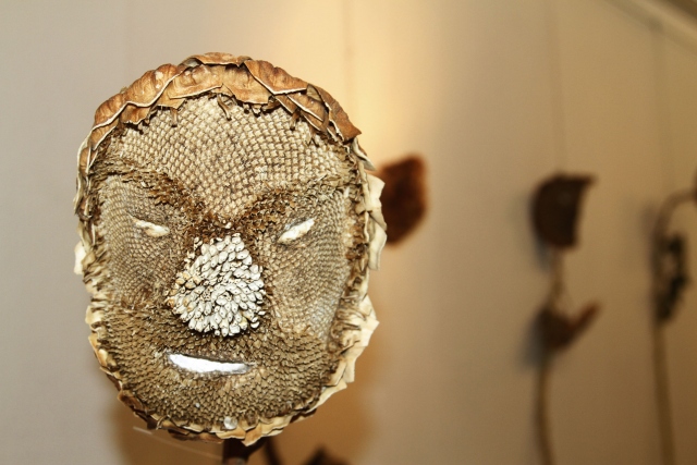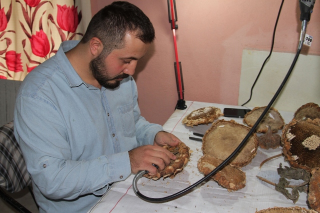 Gazi Üniversitesi Eğitim Fakültesi Resim İş Öğretmenliği Bölümü 4. sınıf öğrencisi Sefer Oruç, ayçiçeklerinden "ay yüzler" ismini verdiği sanat eserleri yapıyor.