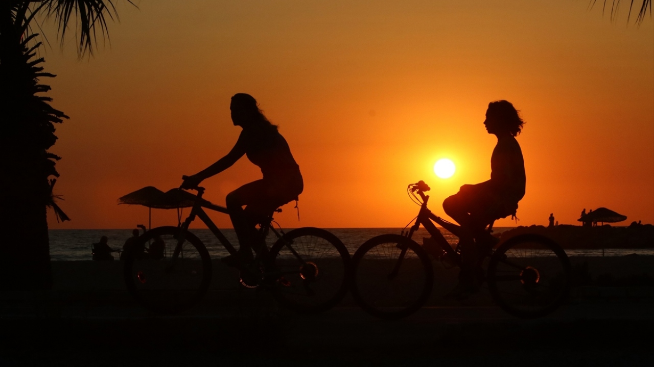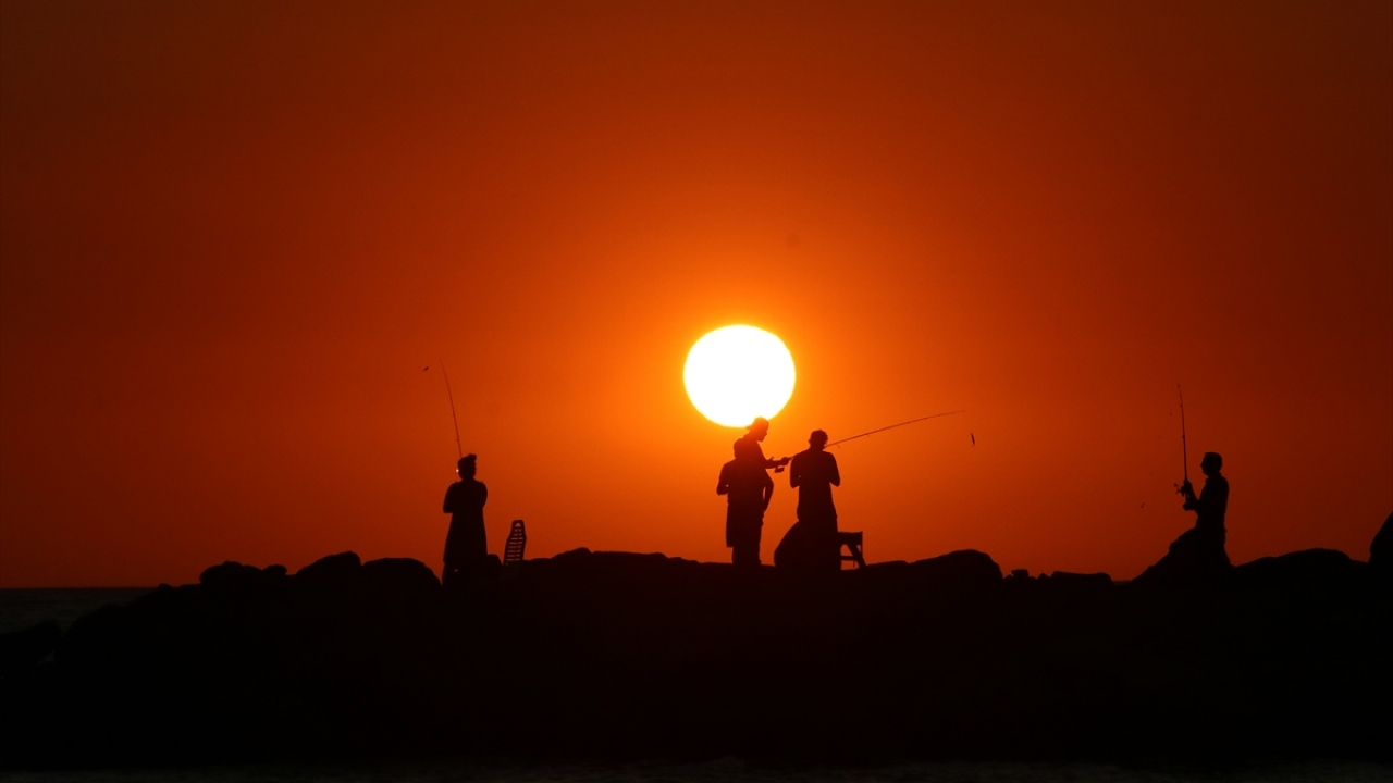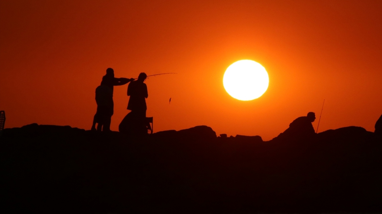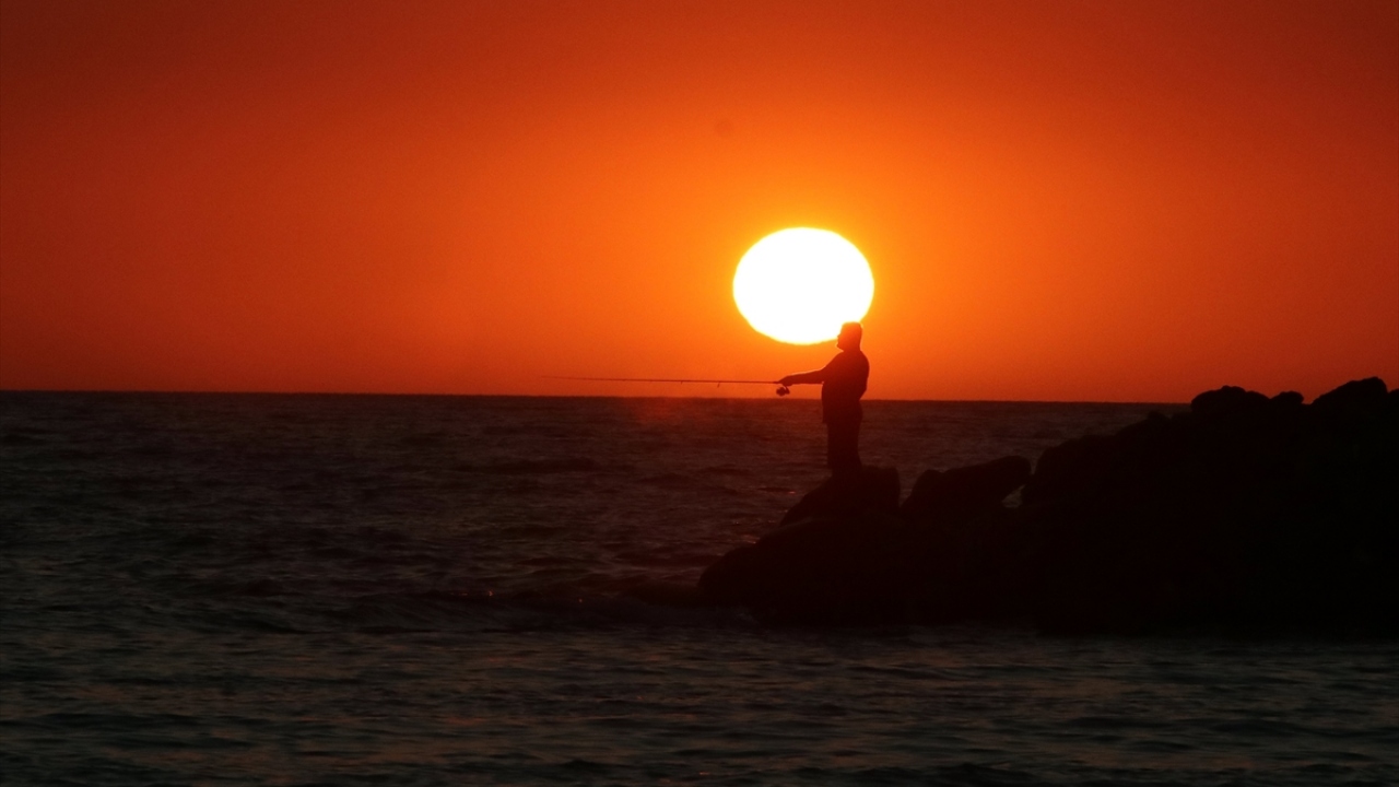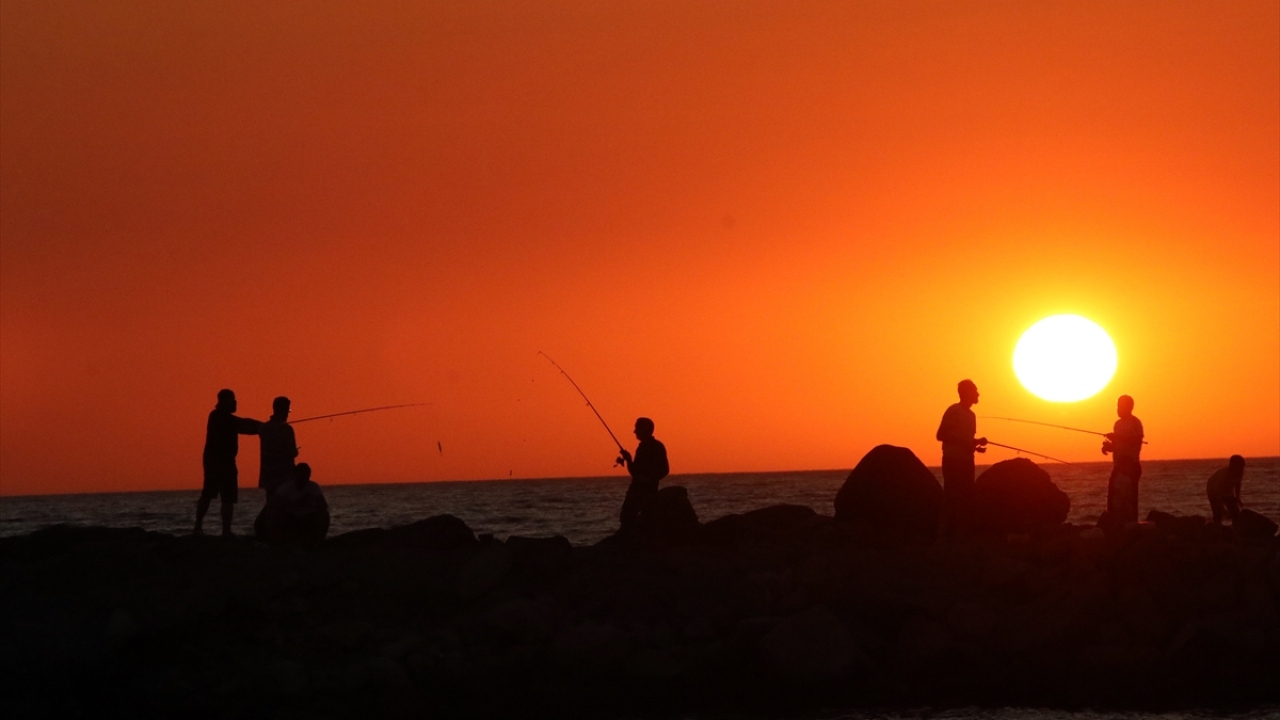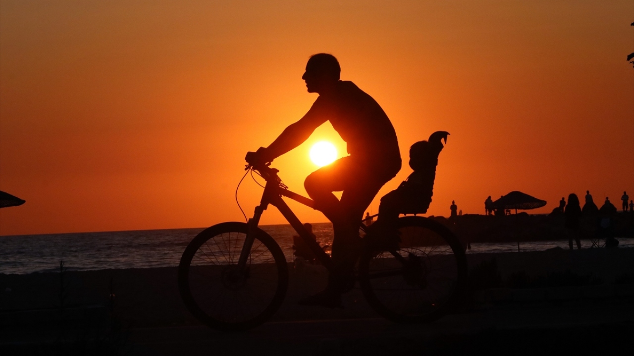 Aydın'ın Kuşadası ilçesindeki Sevgi Plajı'nda gün batımı sırasında oluşan renk cümbüşü ve plajda vakit geçiren insanların silüetleri güzel görüntü oluşturdu.
