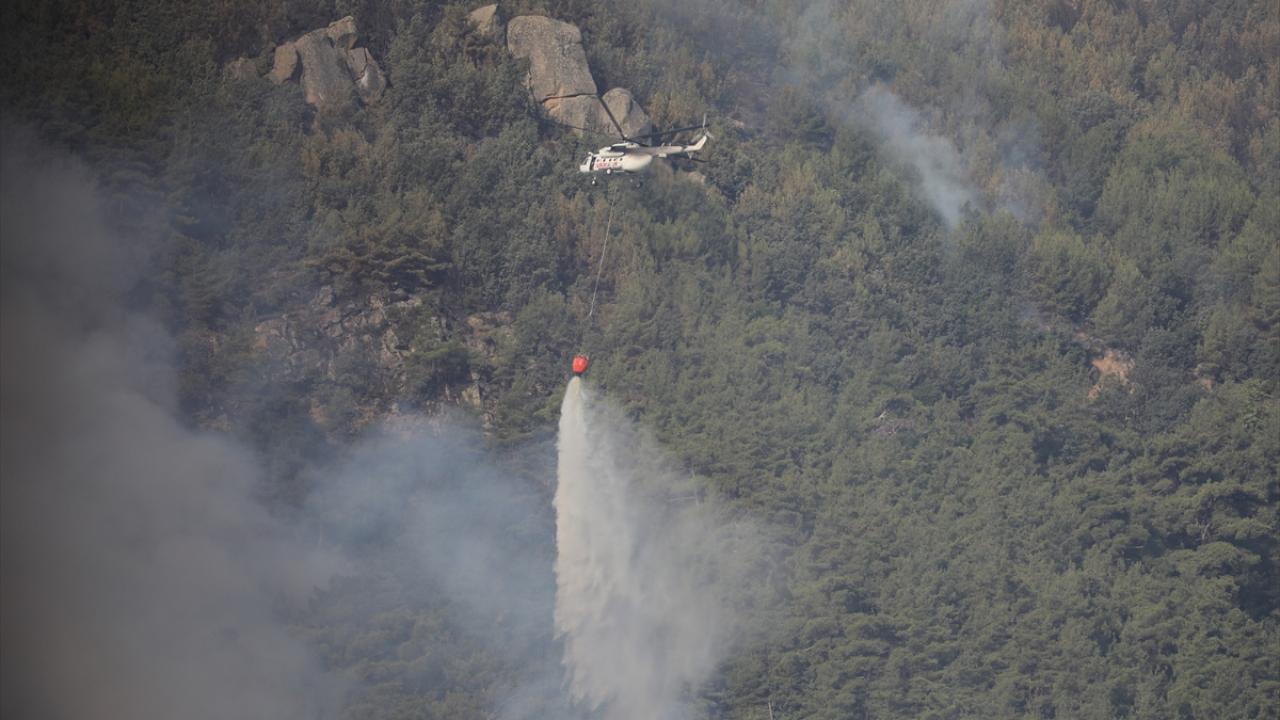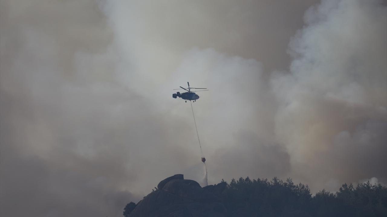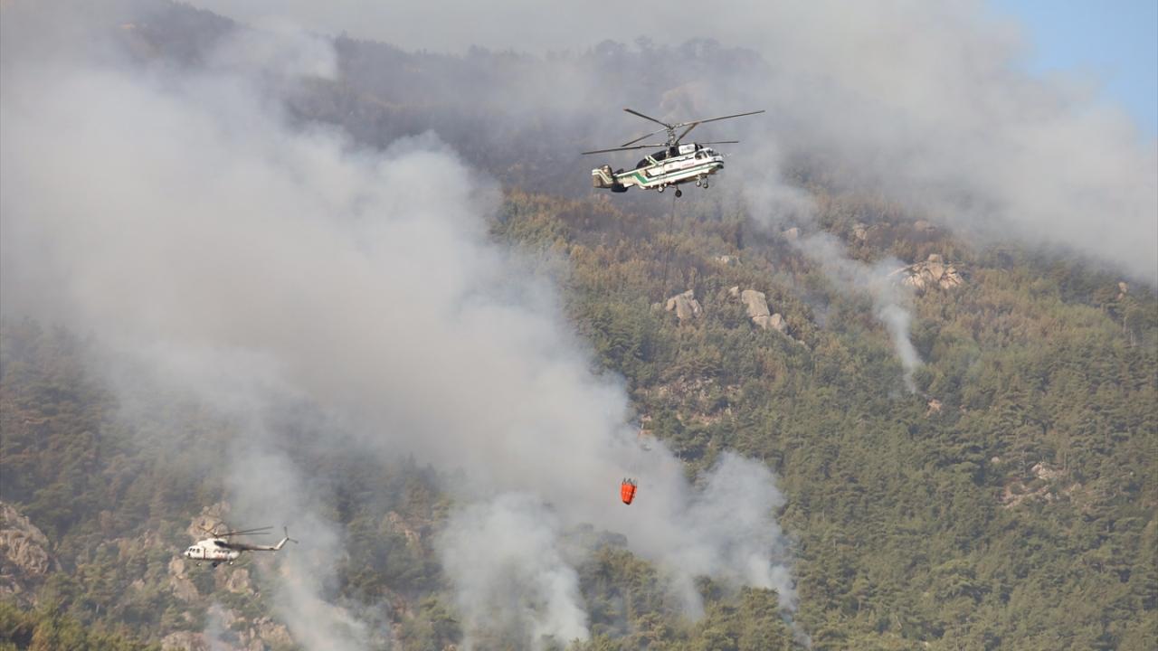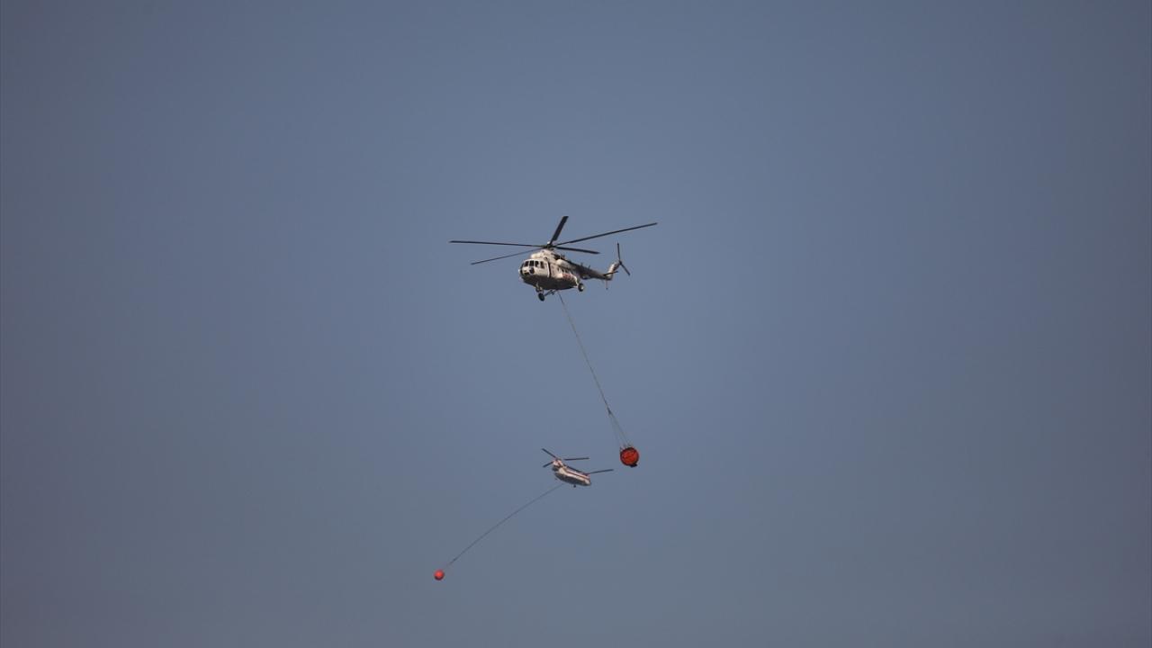 Bölgedeki 6 mahallenin belirli bölümlerinin tahliye edildiği yangını söndürme çalışmalarında 6 helikopter ve çok sayıda arazöz kullanılıyor.