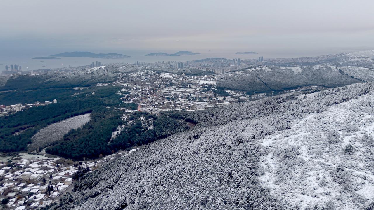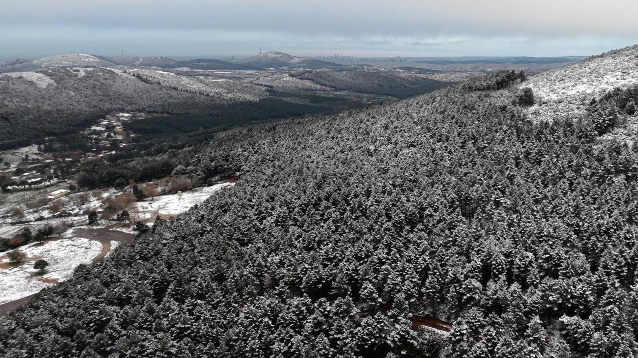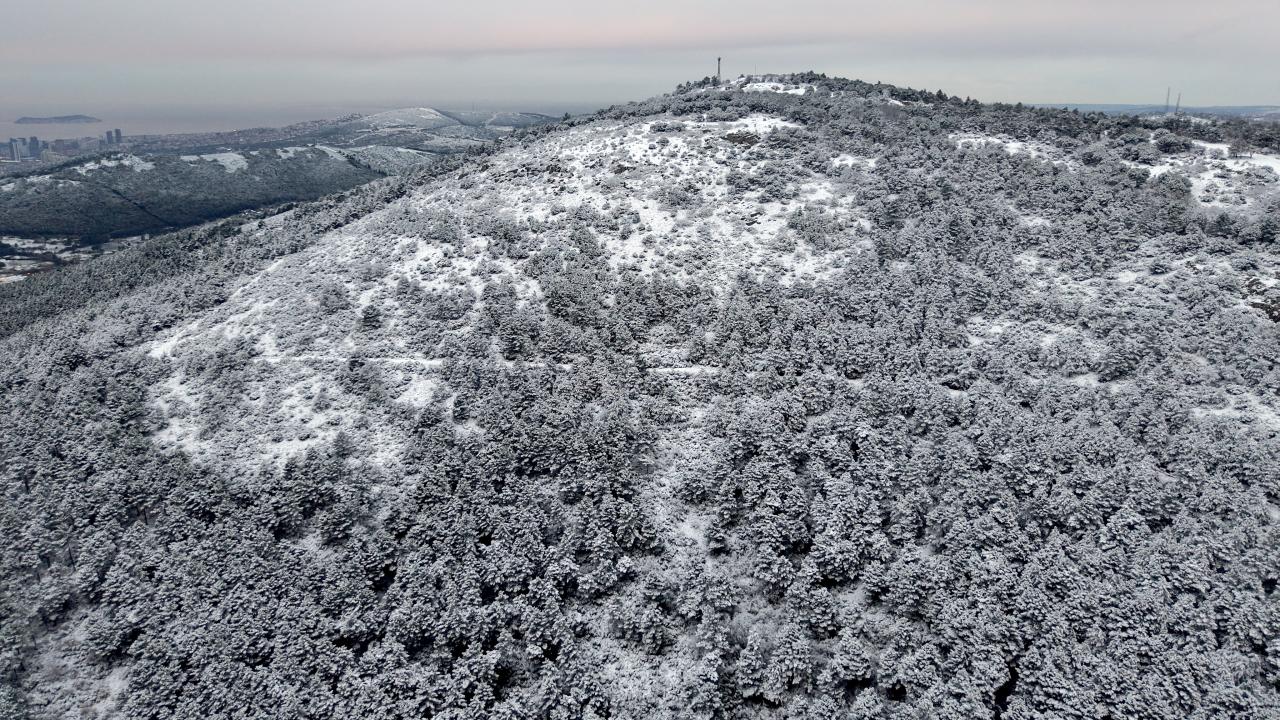 İstanbul'da kar yağışının etkili olduğu Aydos Ormanı ve çevresi, dronla havadan görüntülendi.