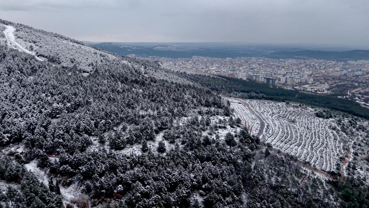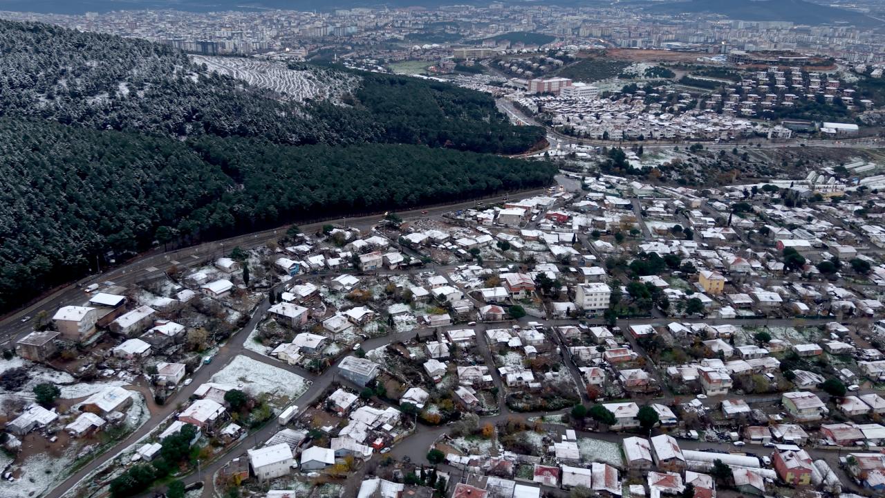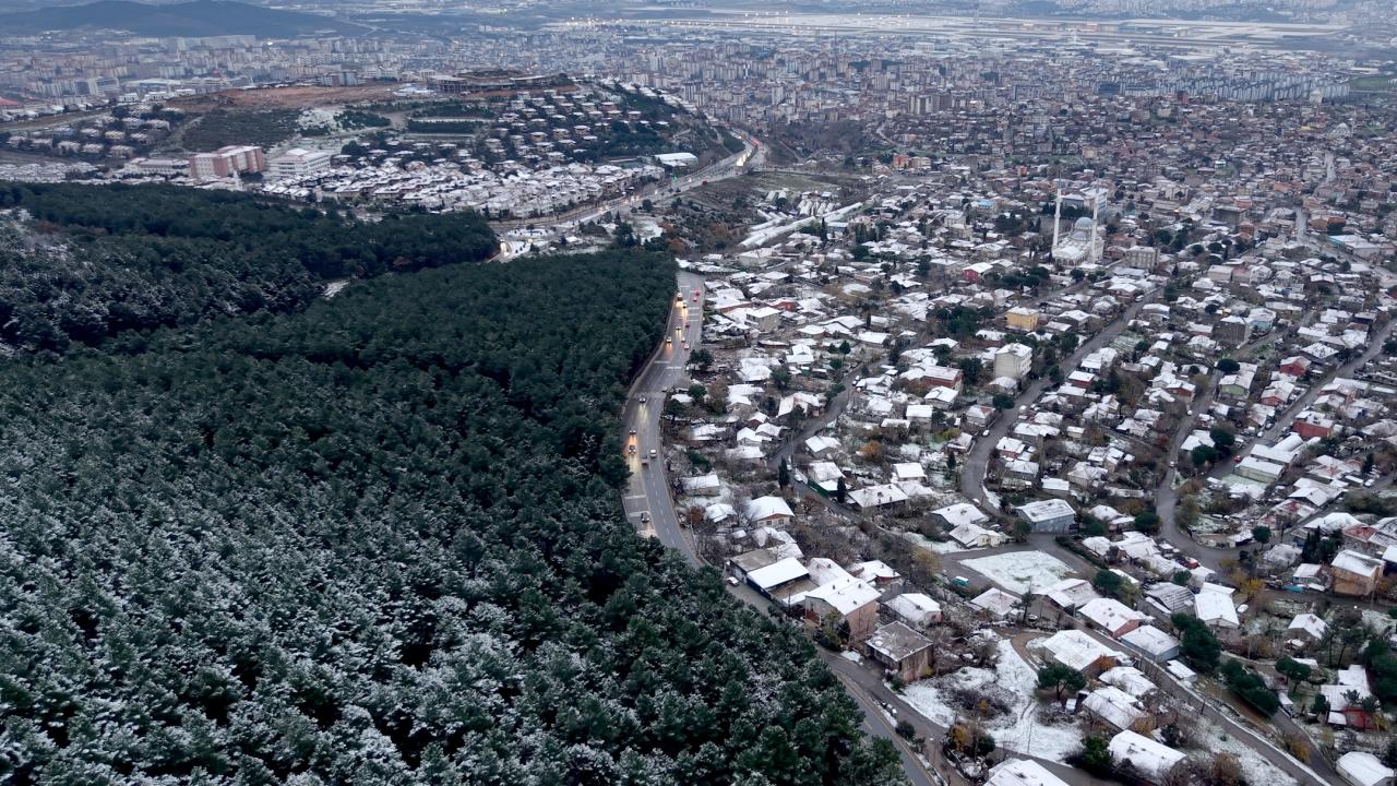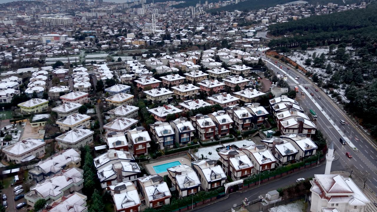 İstanbul'da kar yağışının etkili olduğu Aydos Ormanı ve çevresi, dronla havadan görüntülendi.