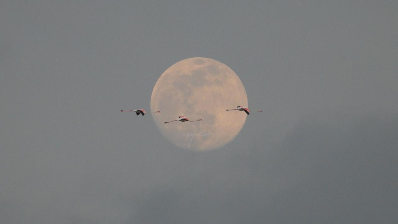 ‘Pembe Ay’ olarak belirtilen Nisan ayında Gediz Deltası Kuş Cenneti İzmir’de yakaladığı o anda ise flamingoların ayın önünden geçtiği görüldü.