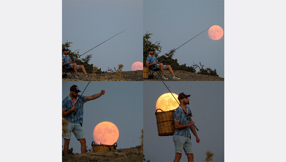 ‘Mersin Balığı Ayı’ olarak bilinen Ağustos ayında Uşak Ulubey’de kaydedilen fotoğrafa bir kişinin dolunayı balık tutar gibi tutmaya çalıştığı ve sırtındaki sepette taşımaya çalıştığı yansıtıldı.