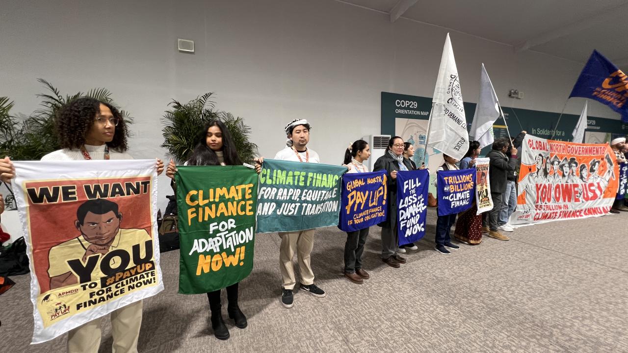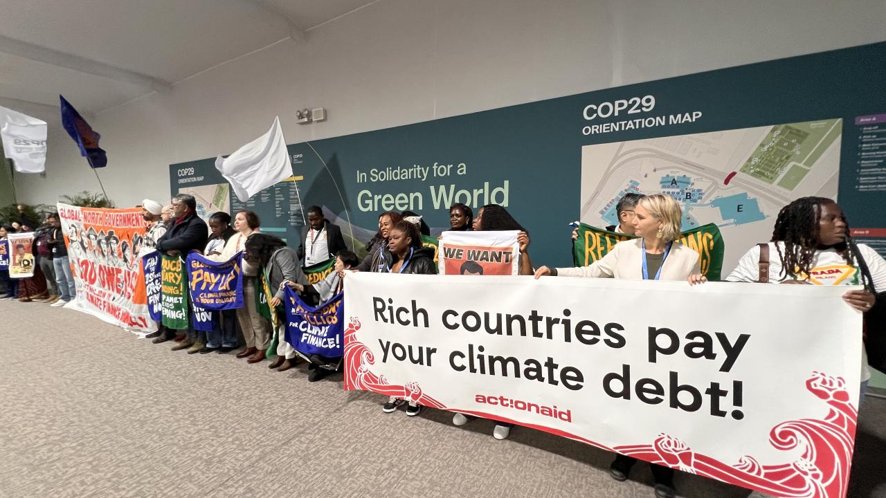 İklim aktivistleri, pavilyonlarda pankart açarak yaşanan sorunlara dikkat çekip İsrail`in Filistin`e saldırılarının durdurulması çağrısında bulunuyor.
