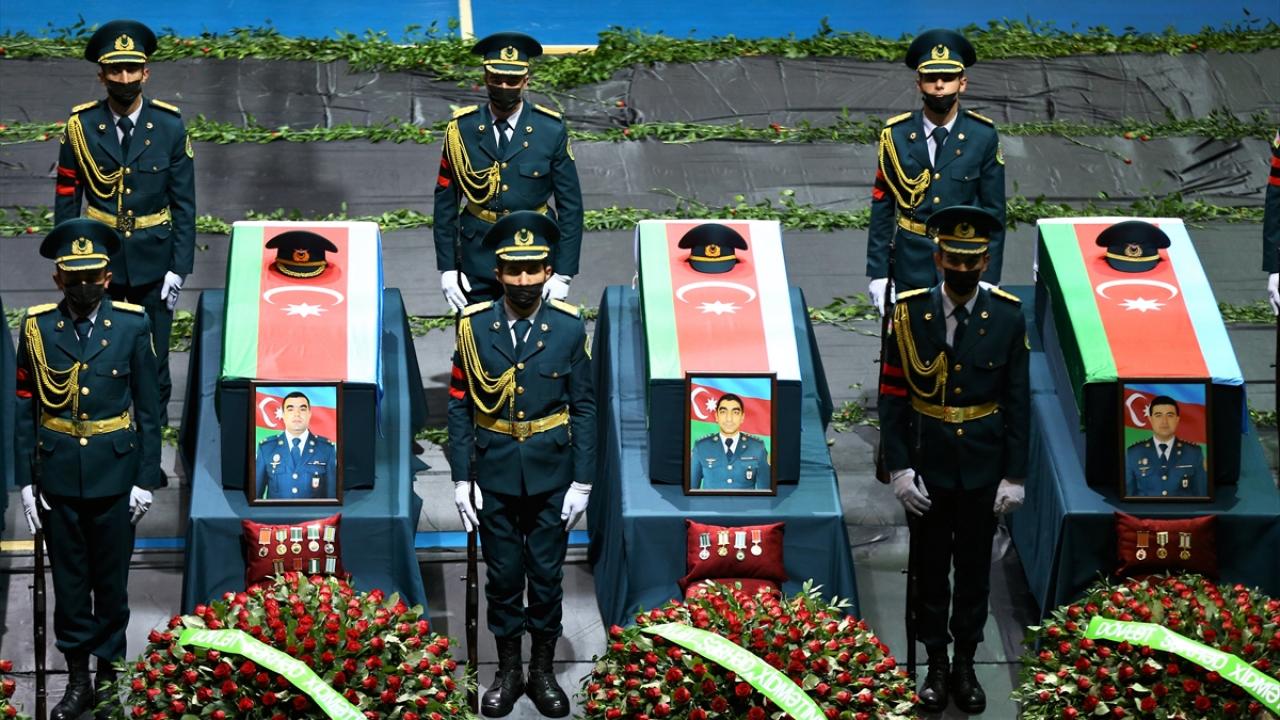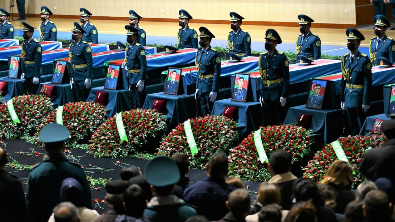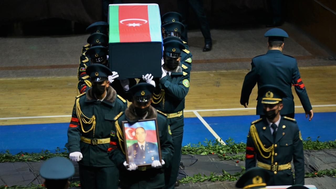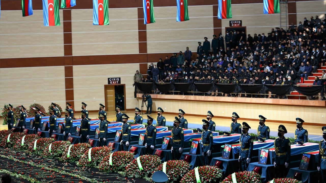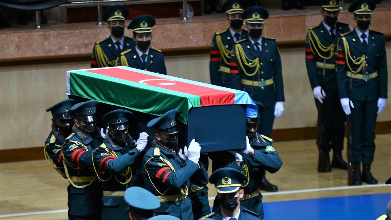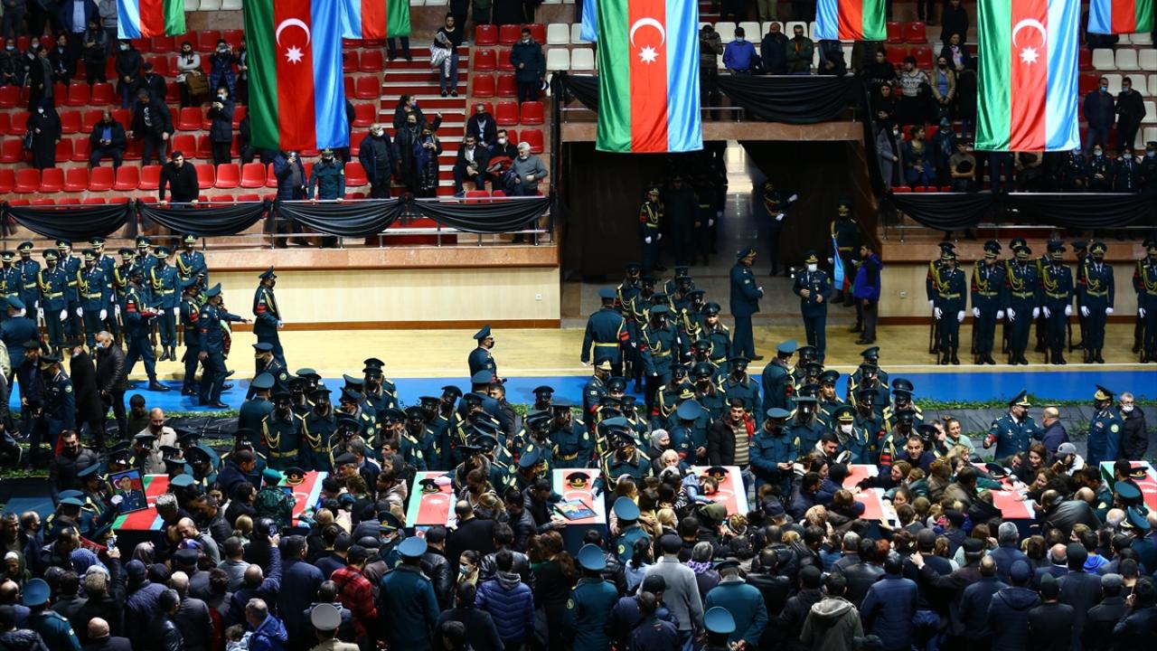 Törende, şehitlerin Azerbaycan bayrağına sarılı tabutu alana getirildi. Saygı duruşunda bulunulmasının ve Azerbaycan Milli Marşı`nın seslendirilmesinin ardından şehitlerin öz geçmişi okundu.