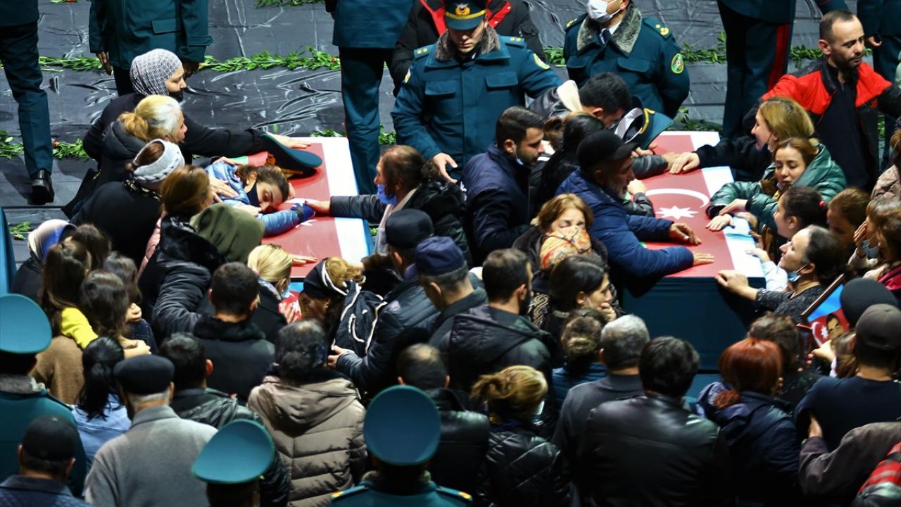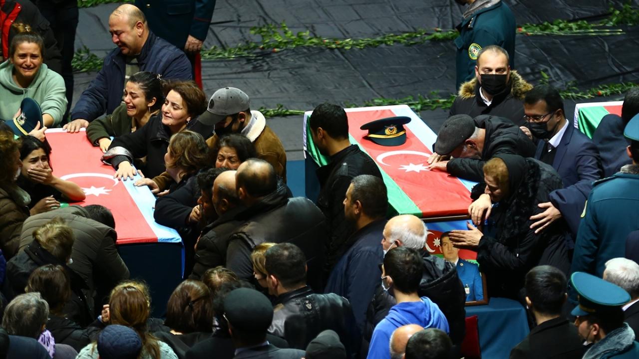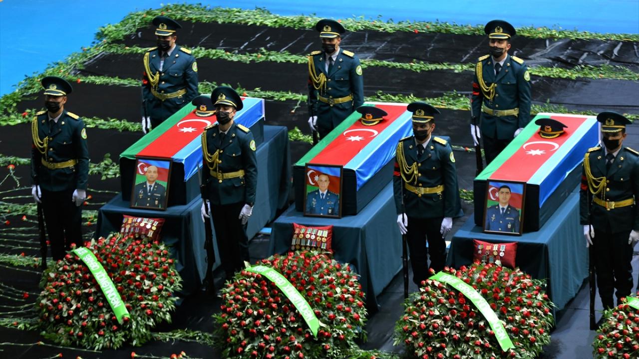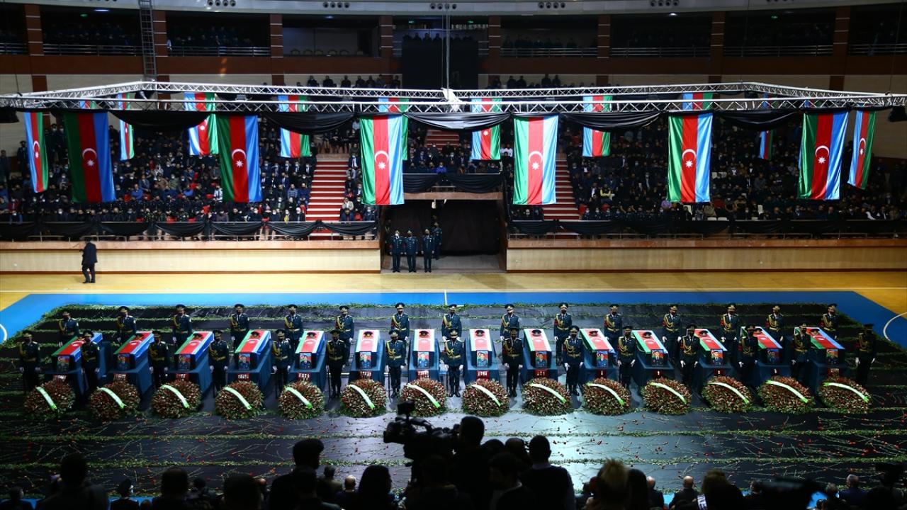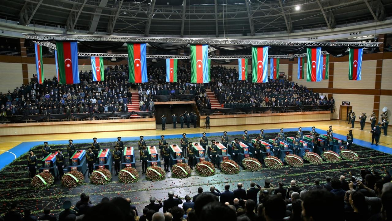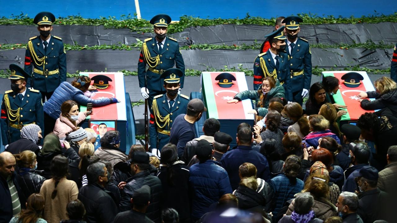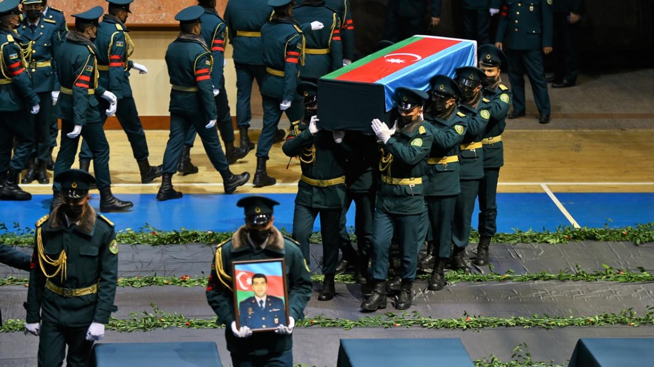 Törende, şehitlerin Azerbaycan bayrağına sarılı tabutu alana getirildi. Saygı duruşunda bulunulmasının ve Azerbaycan Milli Marşı`nın seslendirilmesinin ardından şehitlerin öz geçmişi okundu.