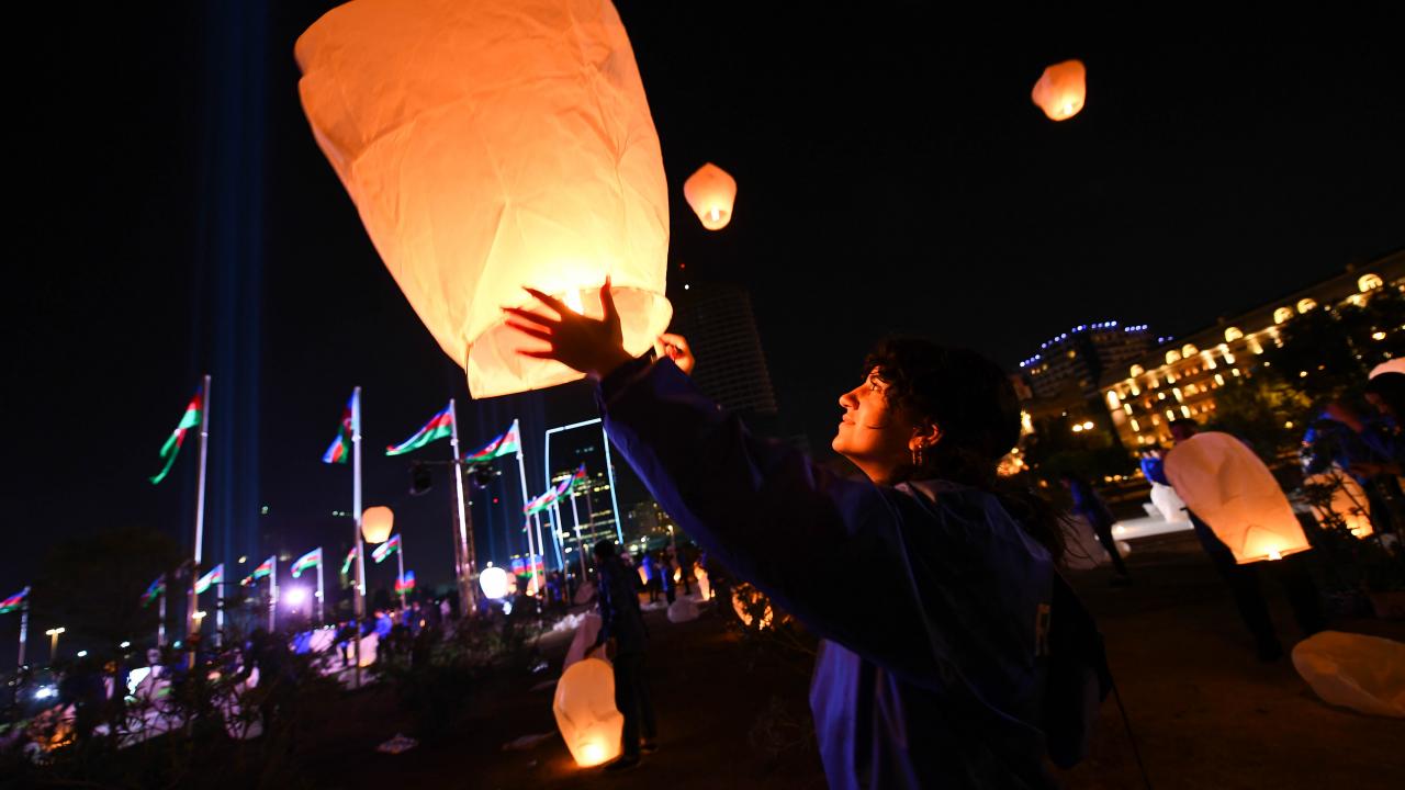 Azerbaycan'da, Ermenistan'ın işgali altındaki toprakların kurtarılması için 27 Eylül 2020'de başlatılan 44 günlük savaşın birinci yılında şehitlerin anısına Bakü'nün ünlü yapılarına Azerbaycan bayrağı yansıtıldı, havaya dilek balonları bırakıldı.