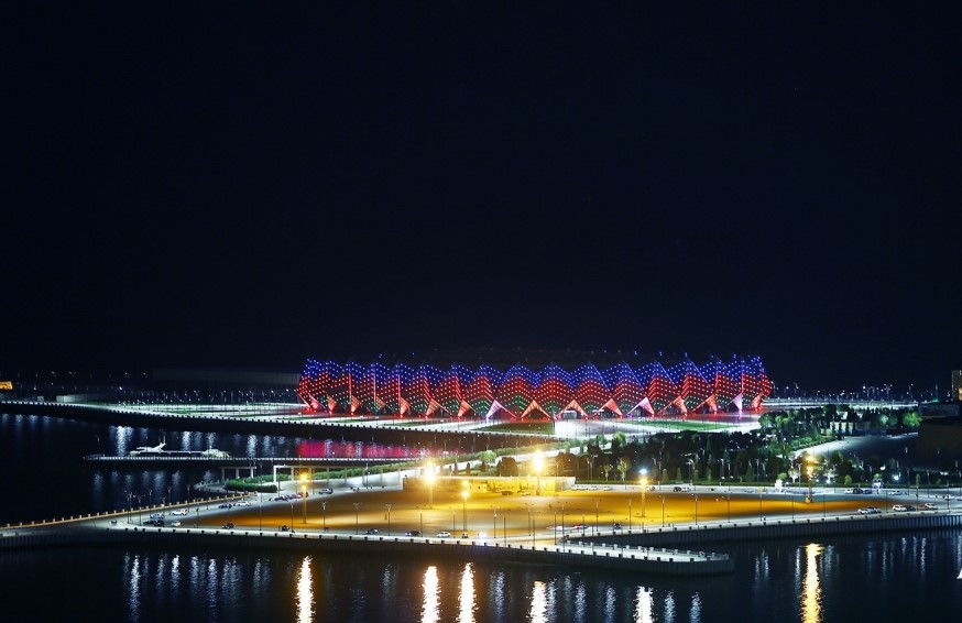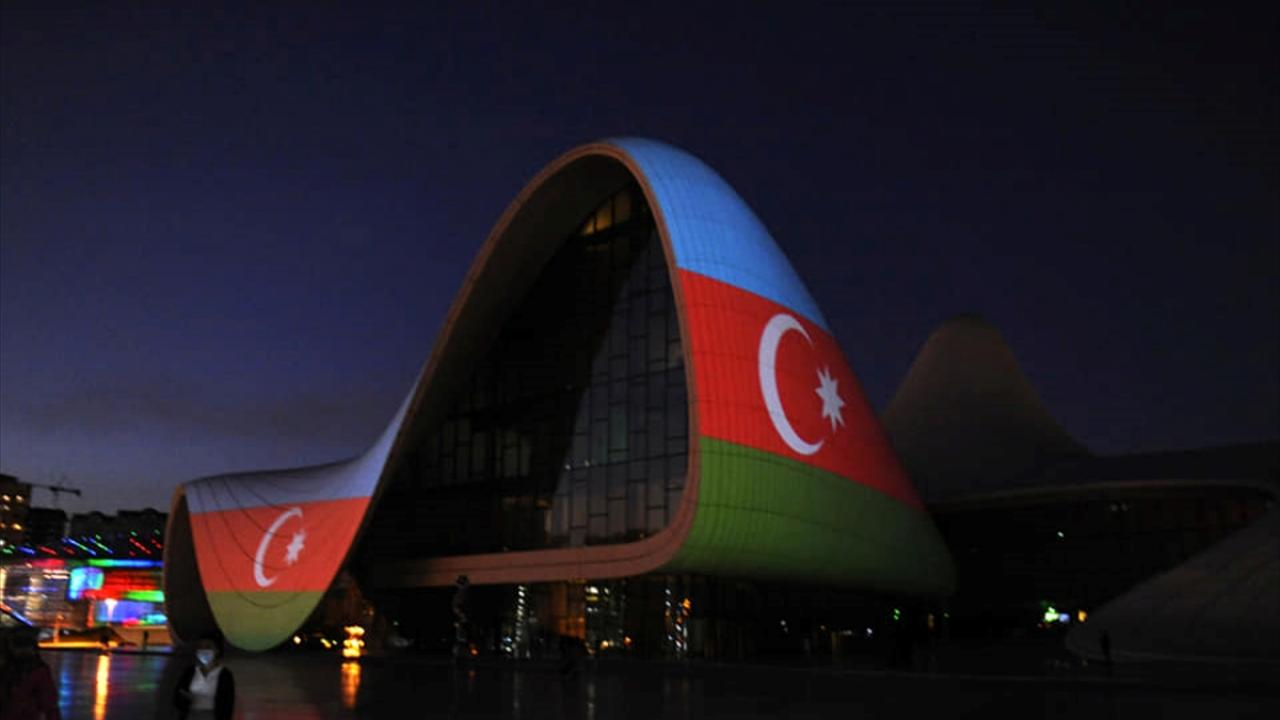 Bakü`nün yeni mimari sembollerinden Flame Towers ve Haydar Aliyev Merkezi, ülke bayrağının yansımalarıyla ışıklandırıldı.