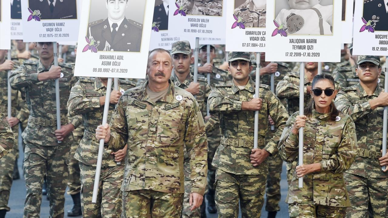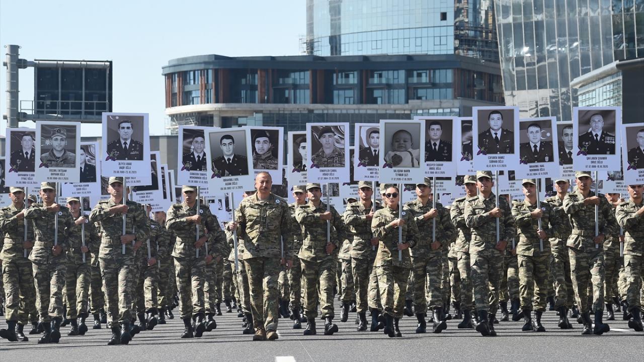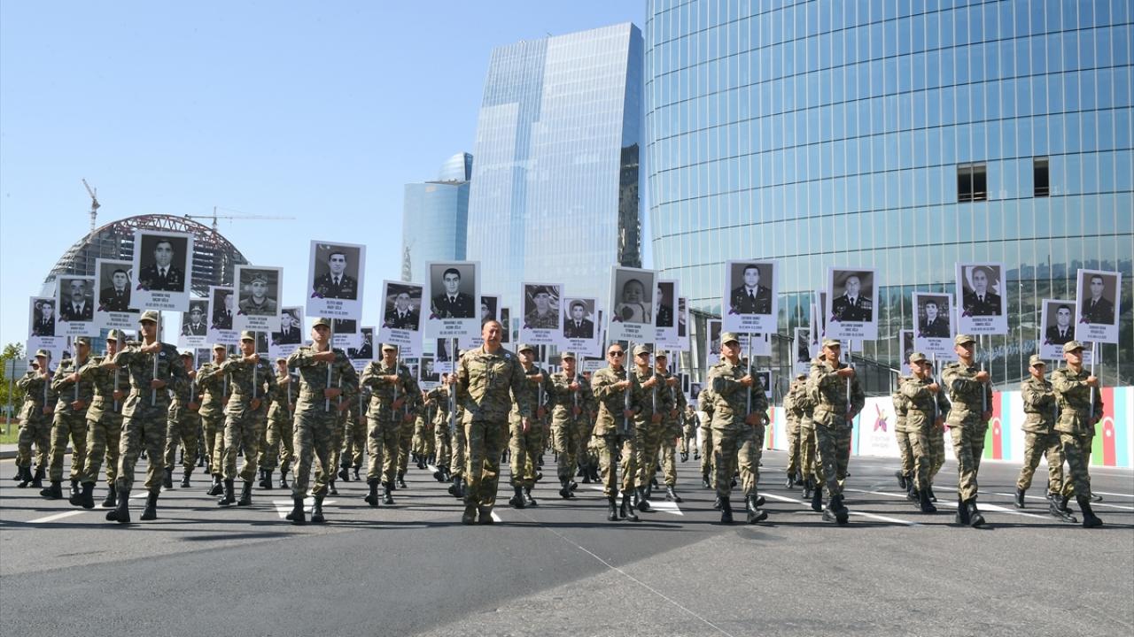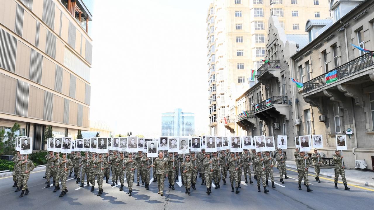 Askerler de ellerinde şehitlerin resmi bulunan pankartlarla Cumhurbaşkanı Aliyev`in arkasından yürüdü.