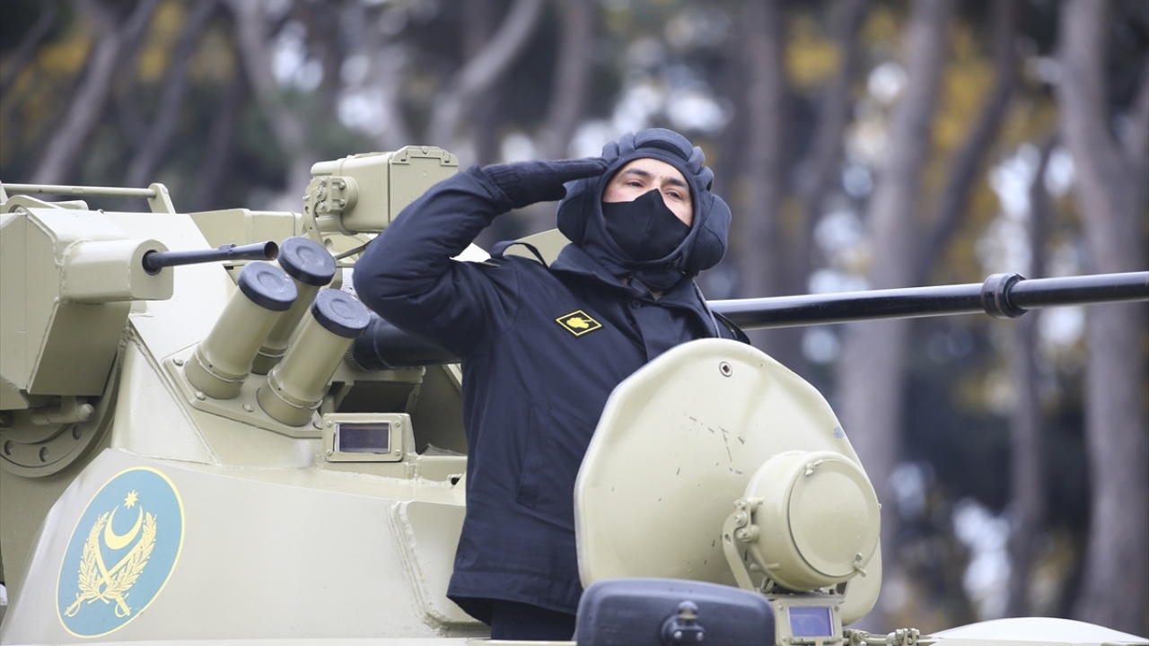 Geçit törenine ``Karabağ Azerbaycandır`` yazılı askeri araç katıldı.