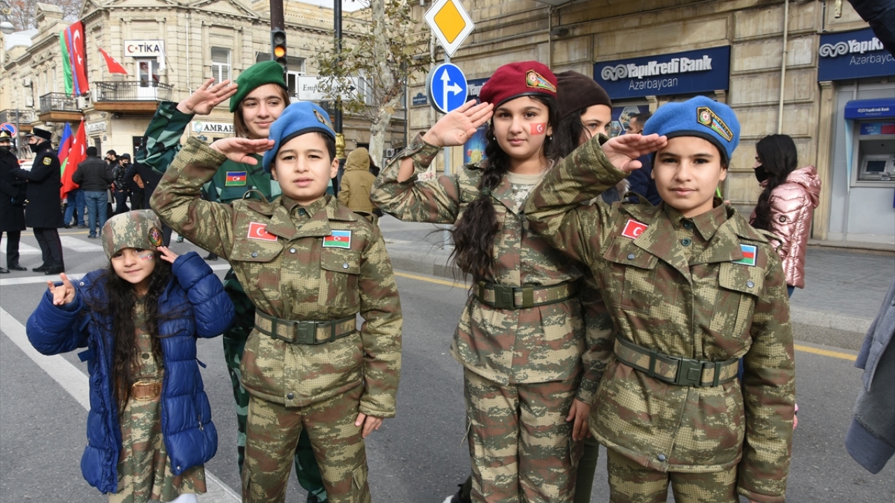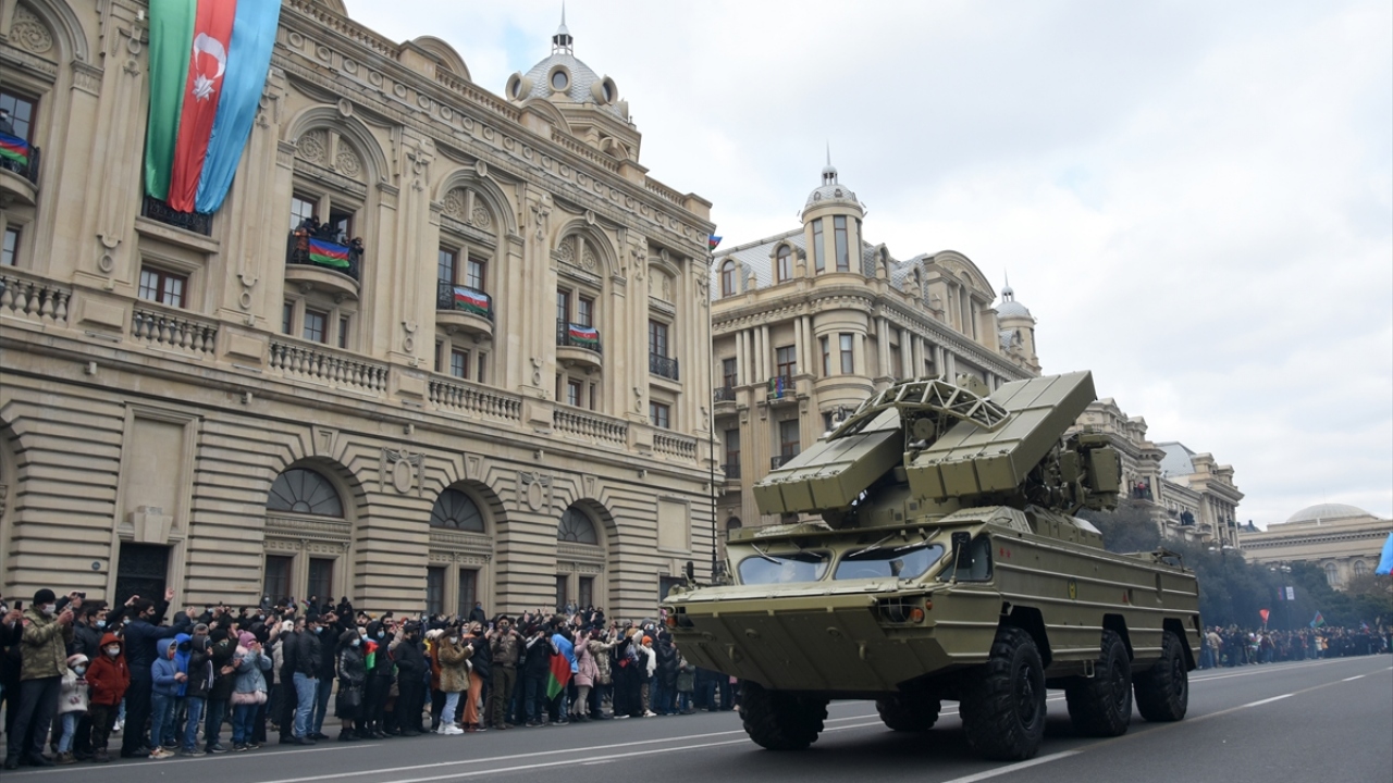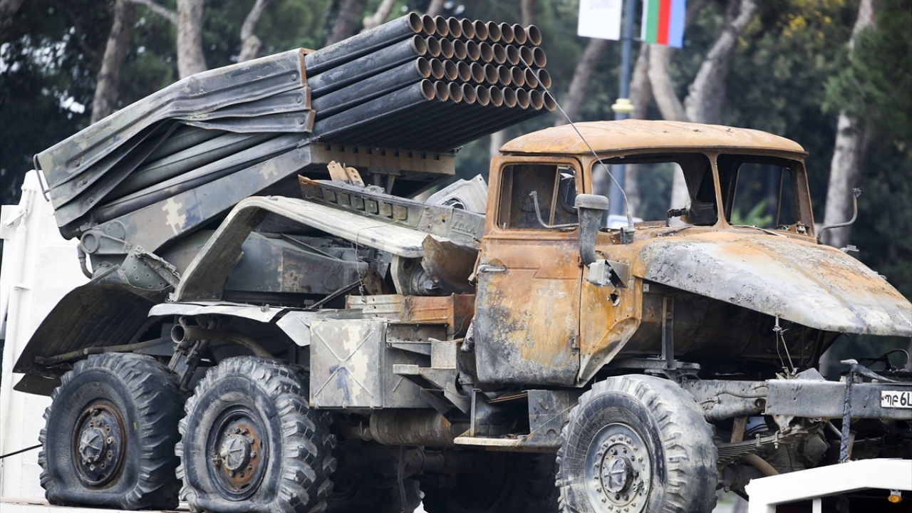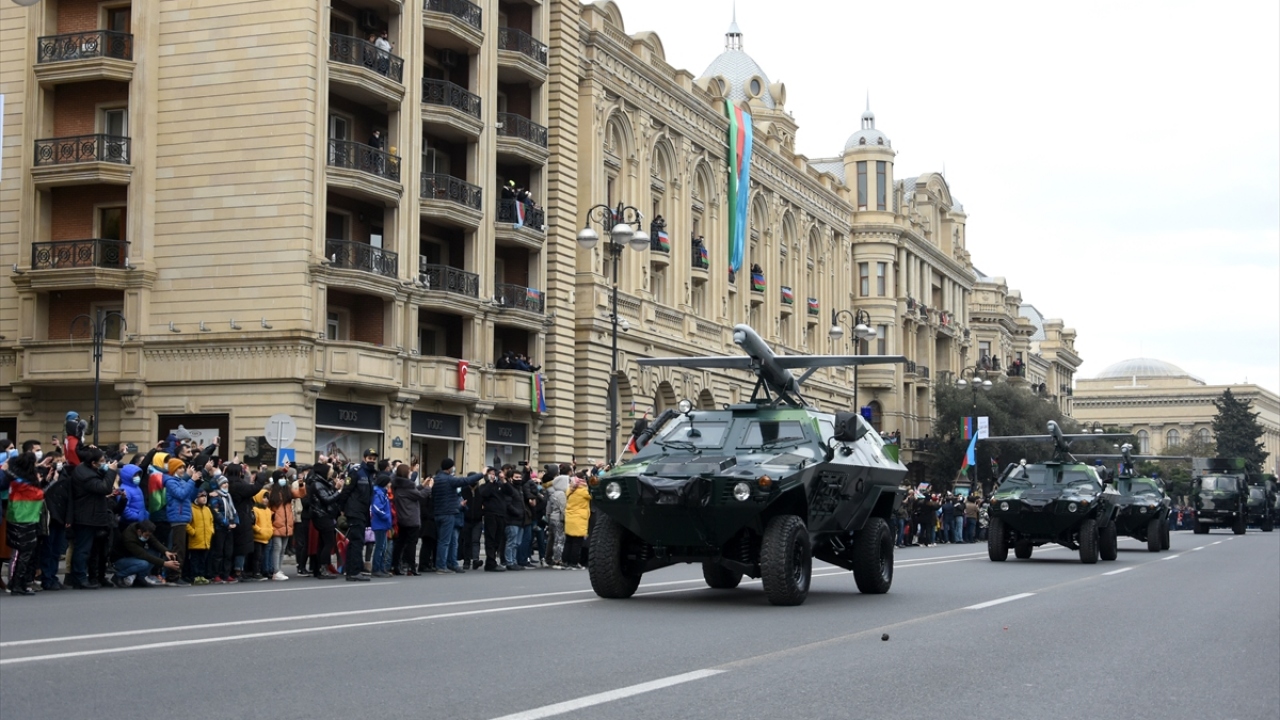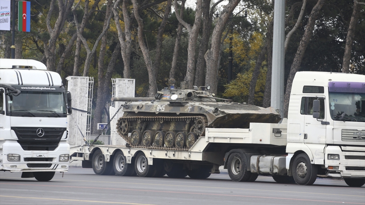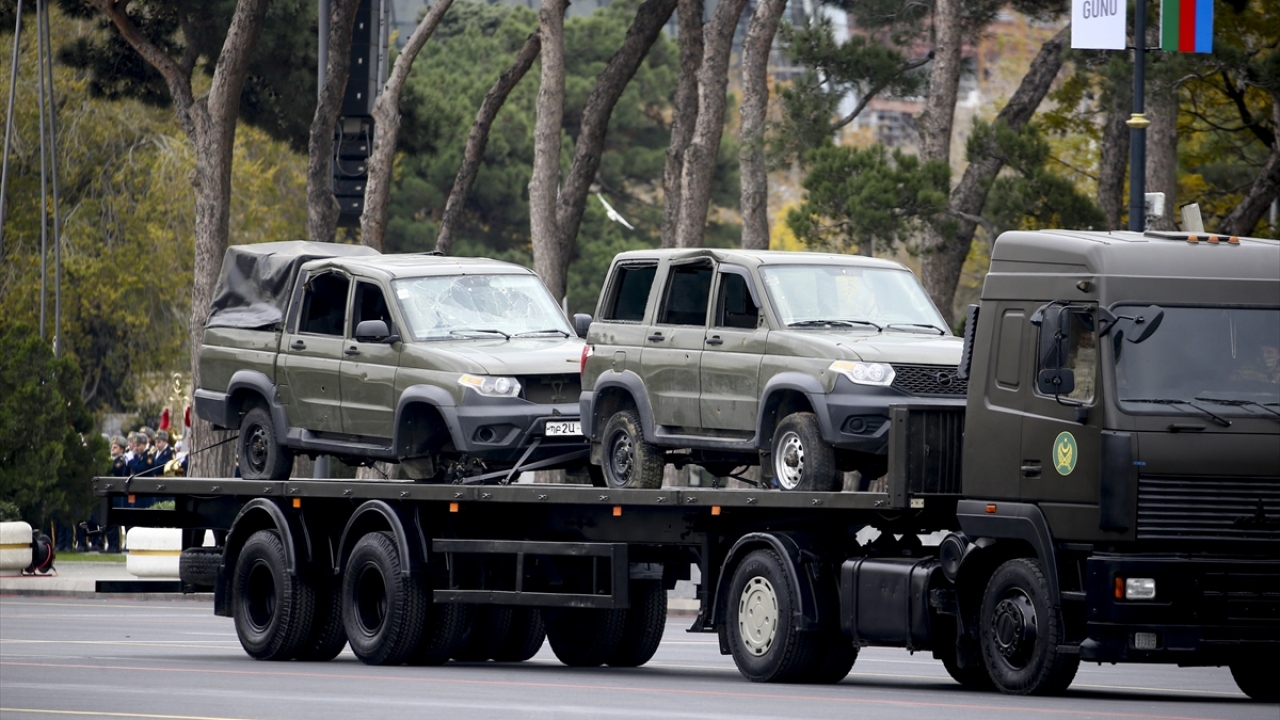 Geçit töreninde Karabağ`da ele geçirilen Ermenistan`a ait hasar görmüş askeri araçlar sergilendi.