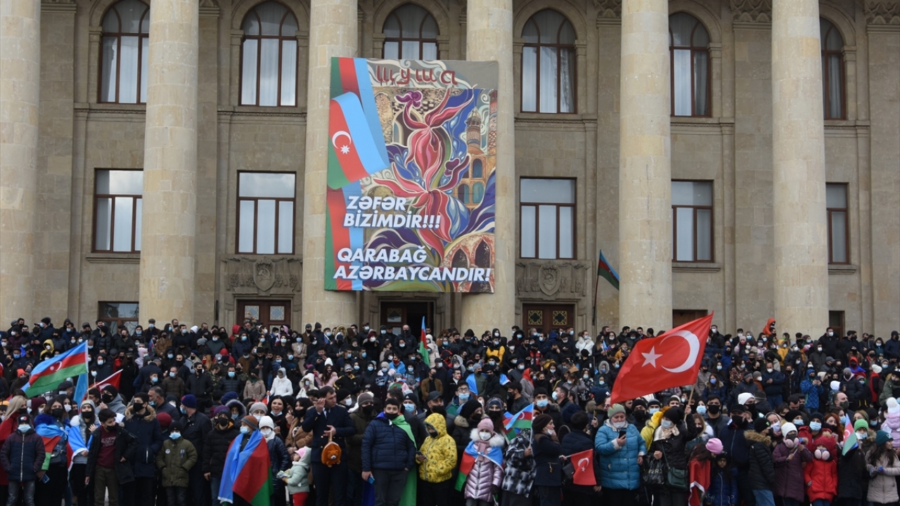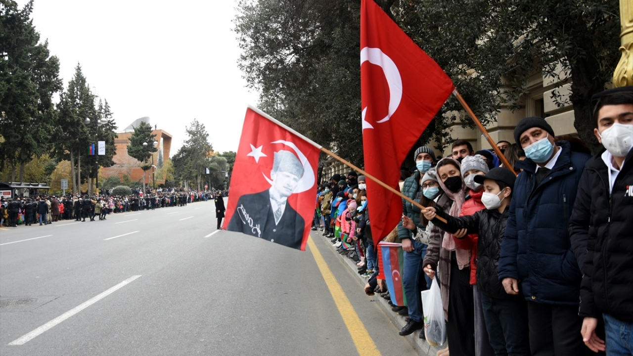 Azerbaycanlılar, Türkiye ve Azerbaycan bayraklarıyla geçit alanında askerlere sevgi gösterisinde bulundu.