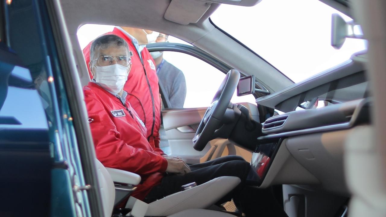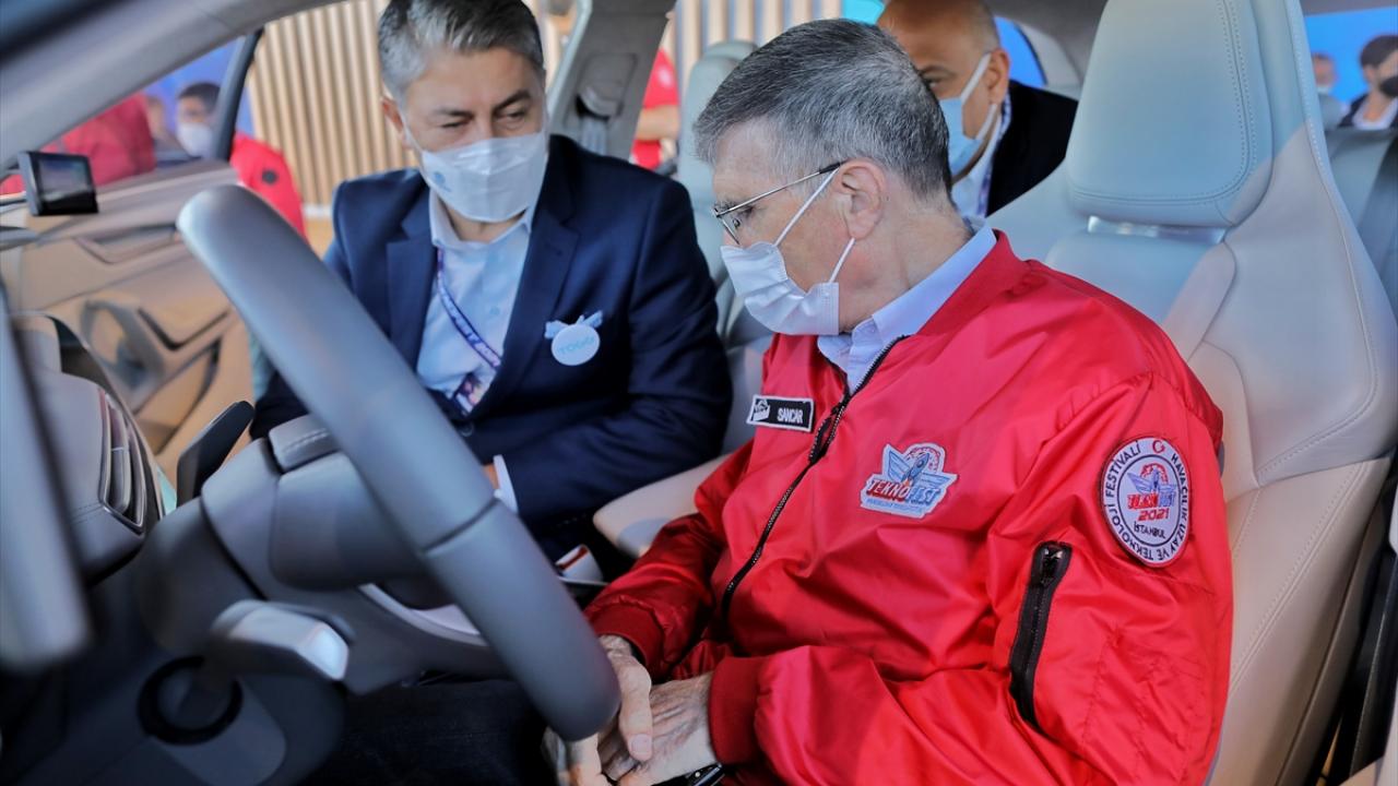 Sancar, daha sonra 4x4 çeker sistemine sahip ve tamamen elektrikli SUV TOGG`un direksiyonuna geçerken, TOGG Üst Yöneticisi Gürcan Karakaş, kendisine eşlik etti.