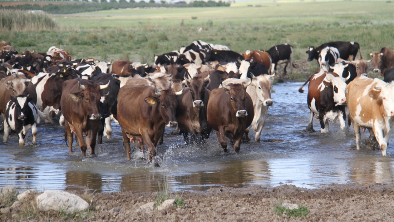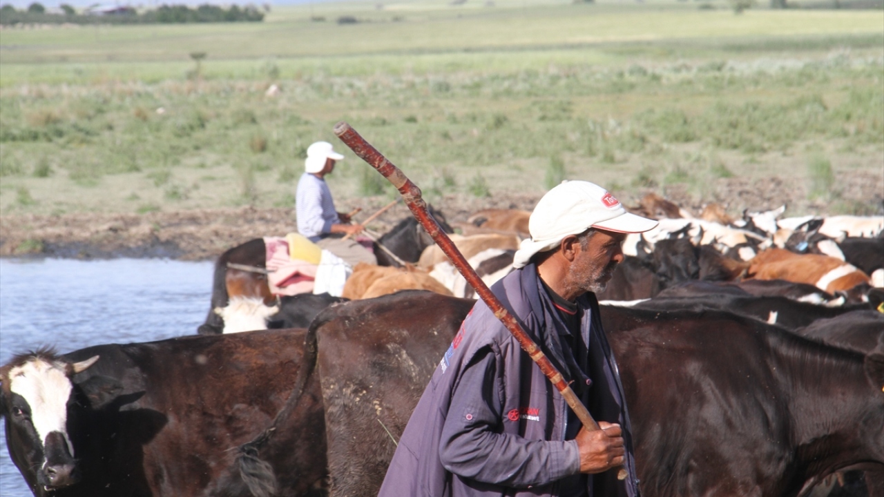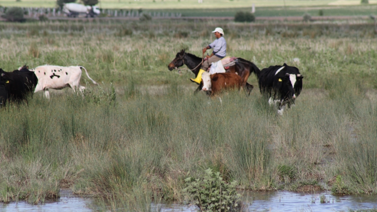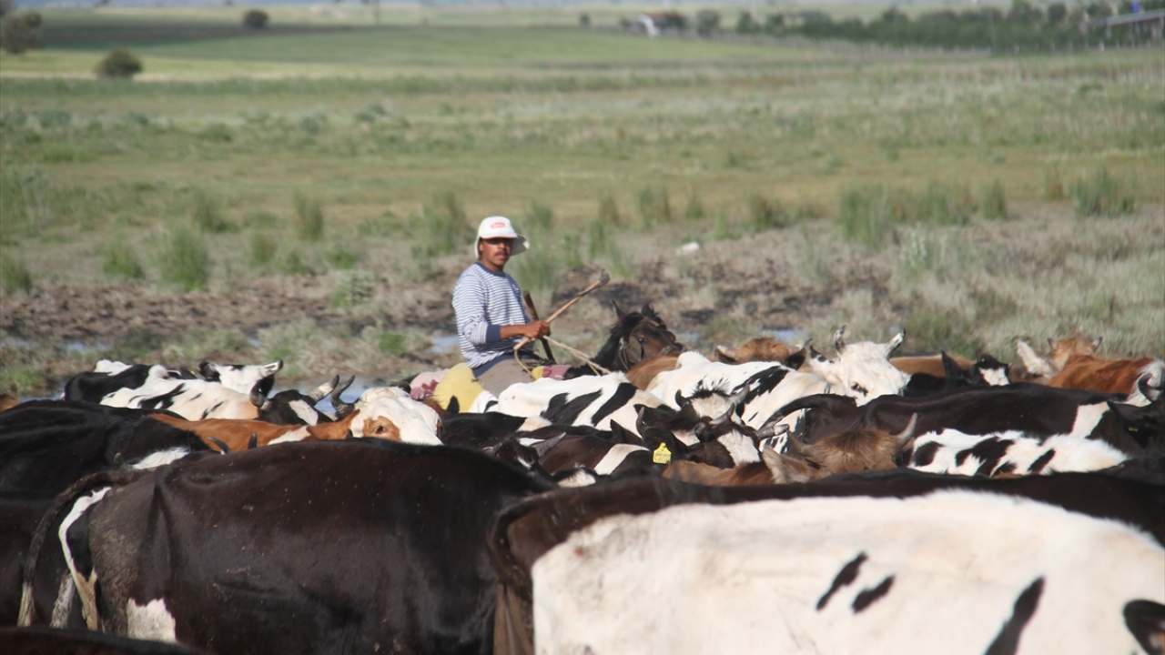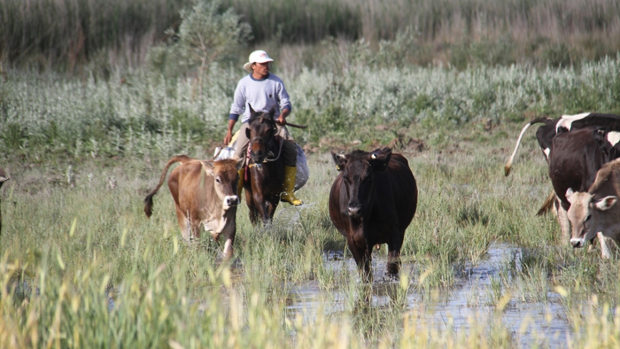 Konya'nın Beyşehir ilçesinde, çobanlık yapan baba oğul göl kıyısındaki yerleşim yerinde büyükbaş hayvan sürülerini at üzerinde yöneterek mesleğini icra ediyor.
