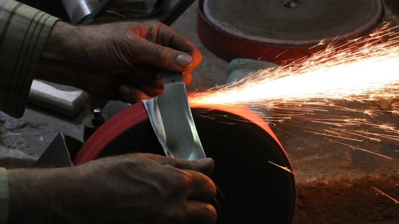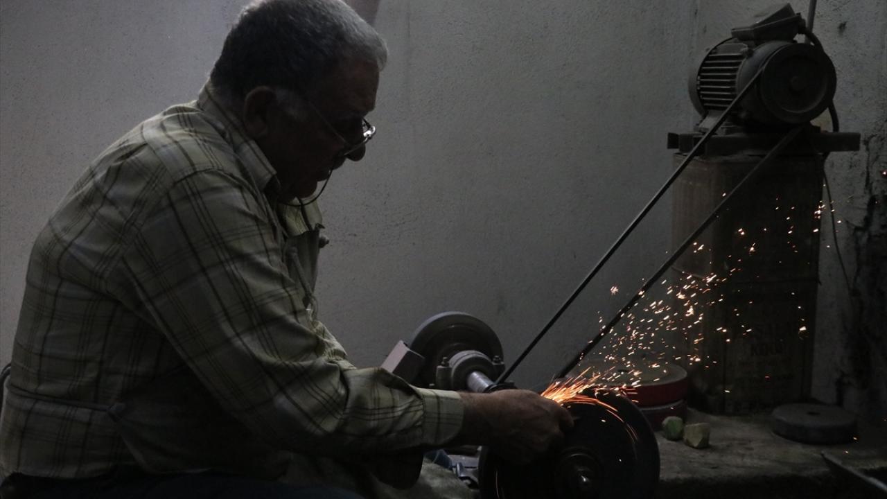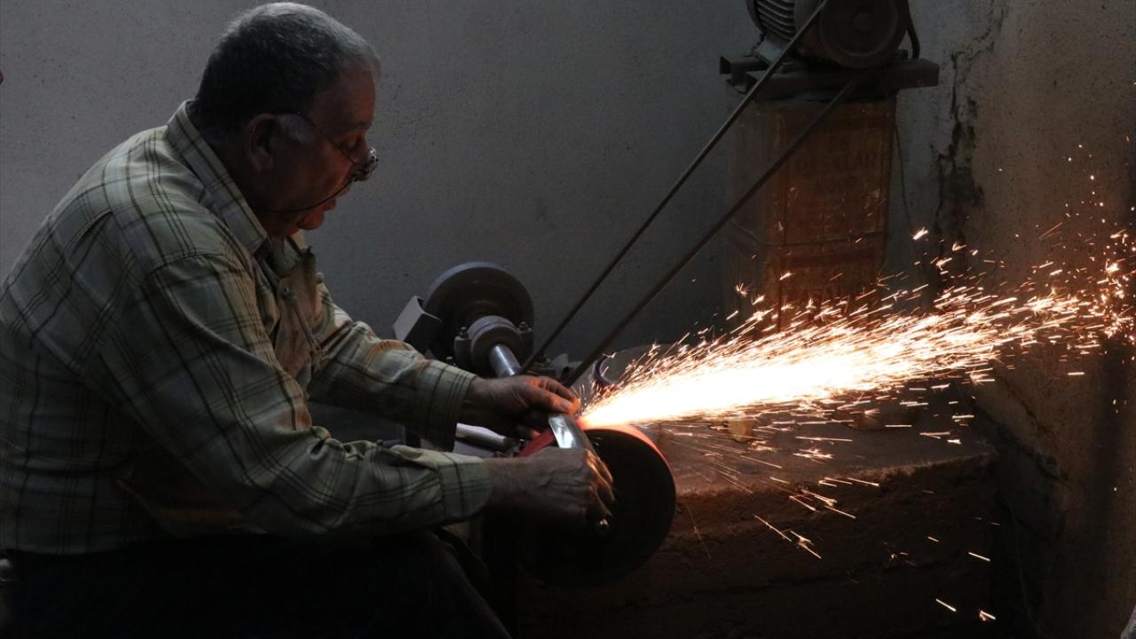 Oğlu Hikmet`i (43) de 5 yaşındayken yanına alan Şeref, mesleğin inceliklerini ona da öğretti. Baba oğul, geleneksel yöntemlerle önce makasla çelik ham maddeyi şekillendiriyor.