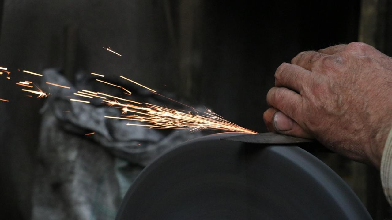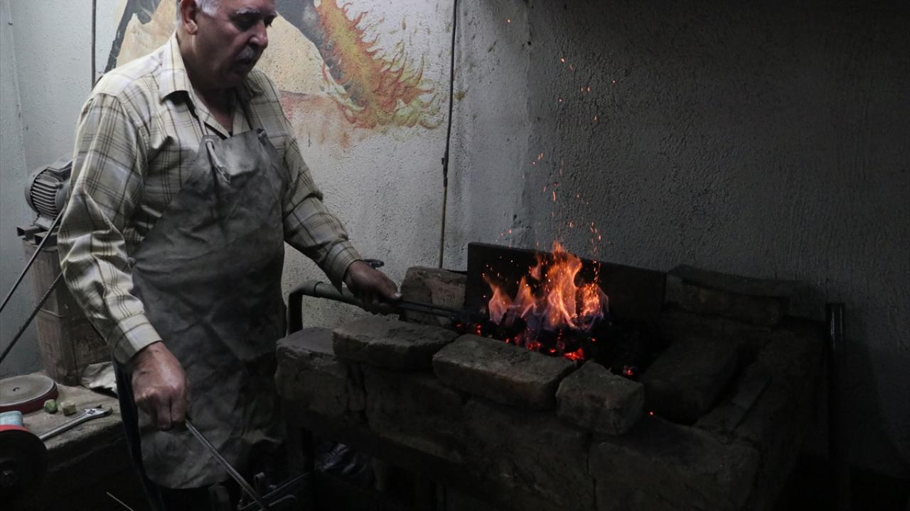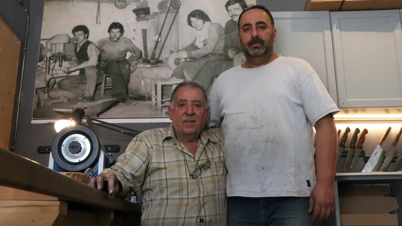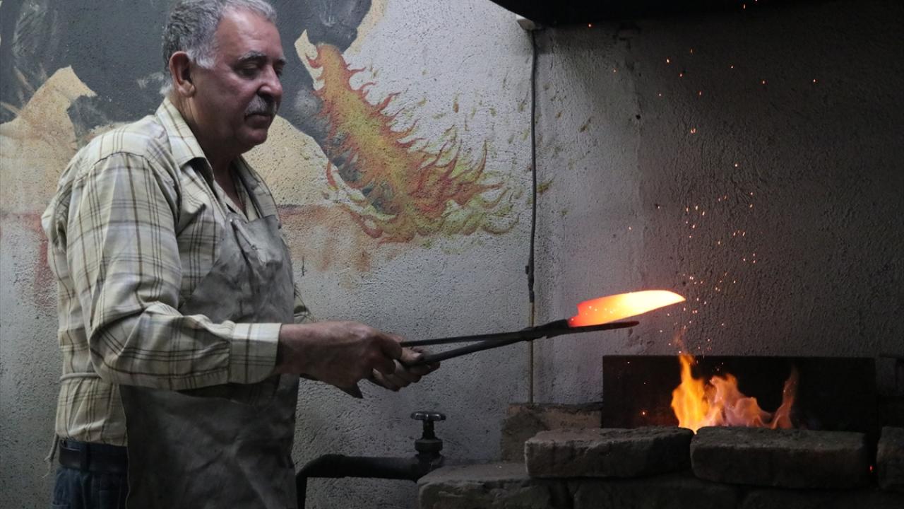 Oğlu Hikmet`i (43) de 5 yaşındayken yanına alan Şeref, mesleğin inceliklerini ona da öğretti. Baba oğul, geleneksel yöntemlerle önce makasla çelik ham maddeyi şekillendiriyor.