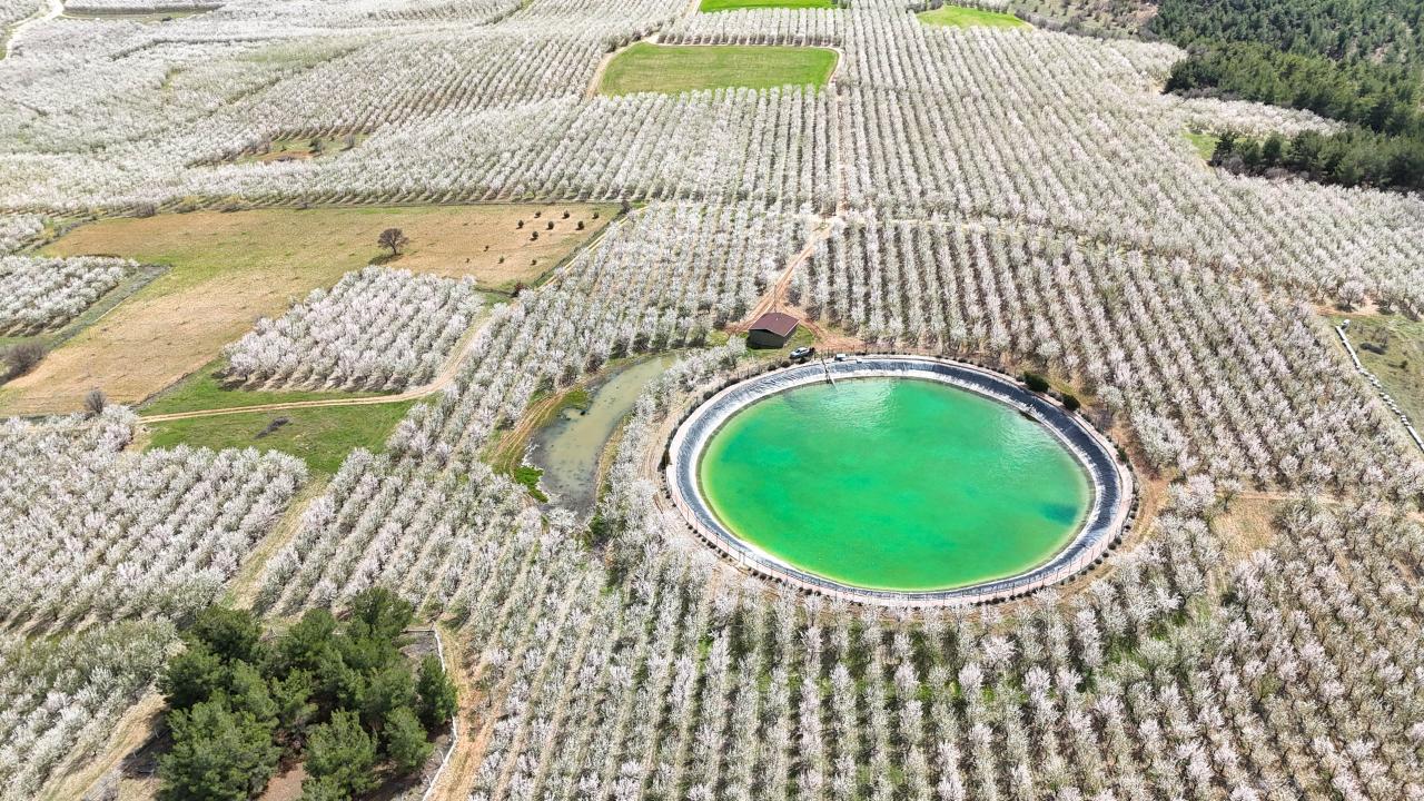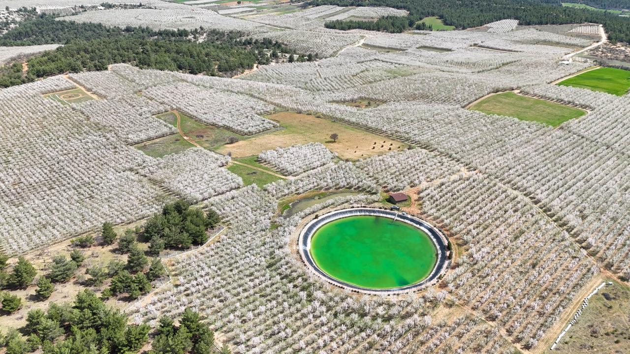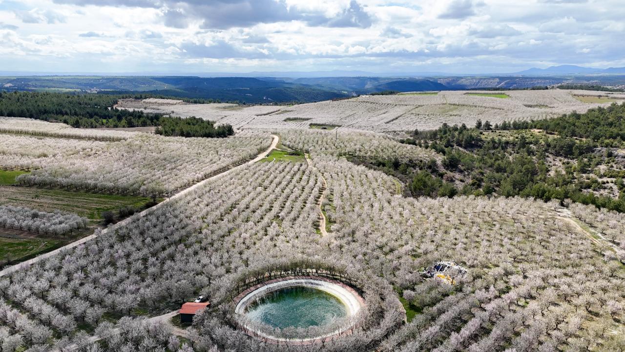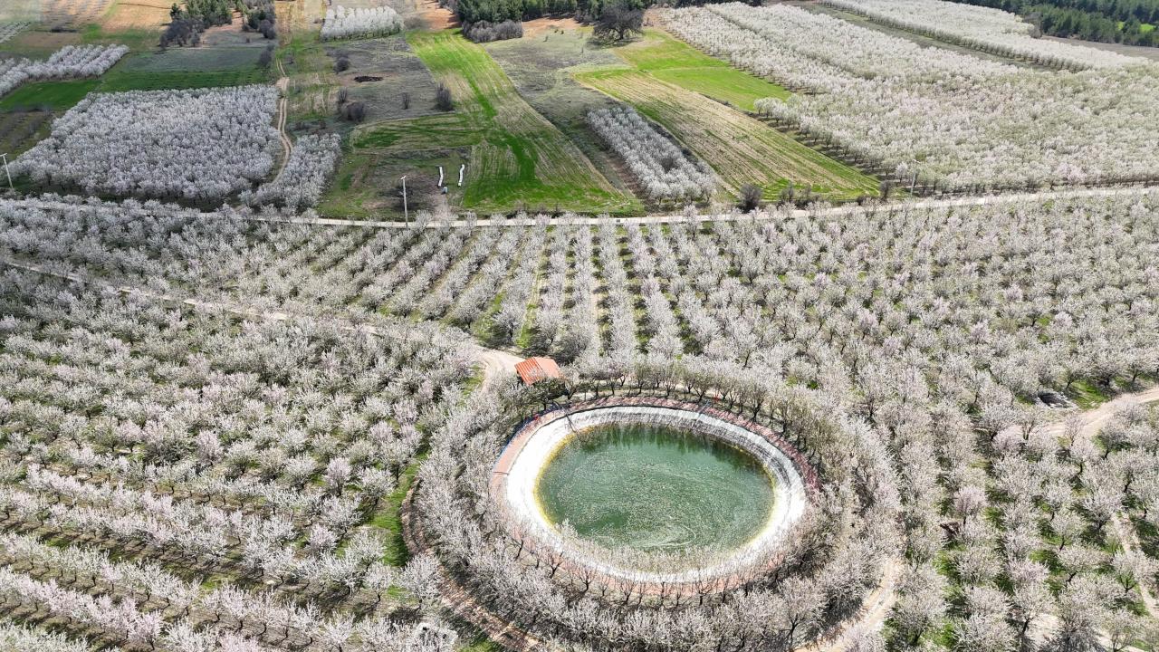 Türkiye`nin en büyük badem bahçeleri arasında yer alan bahçenin içerisindeki sulama havuzları çiçek açan badem ağaçlarıyla birlikte güzel görüntü oluşturdu.