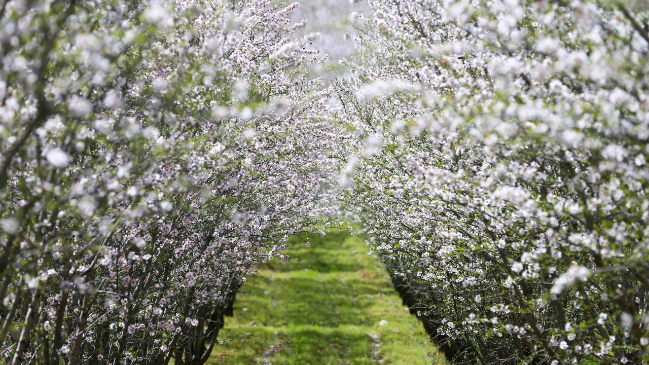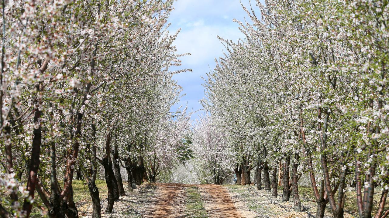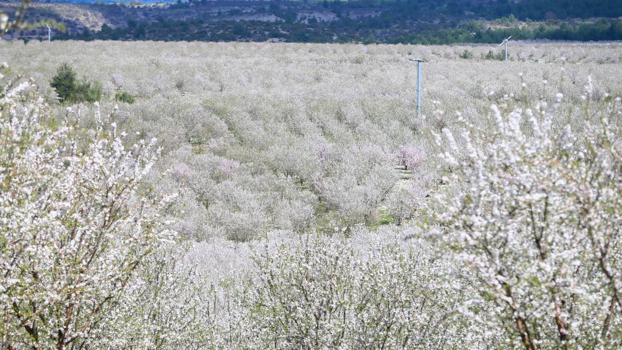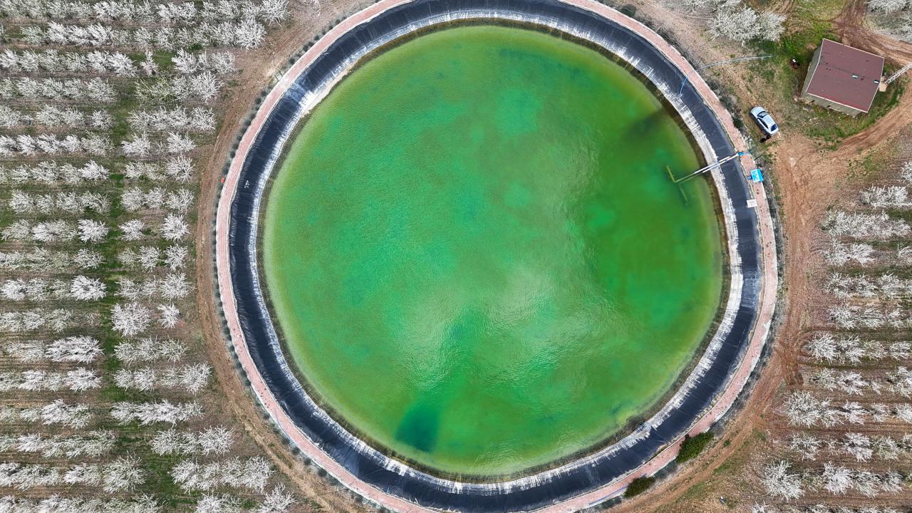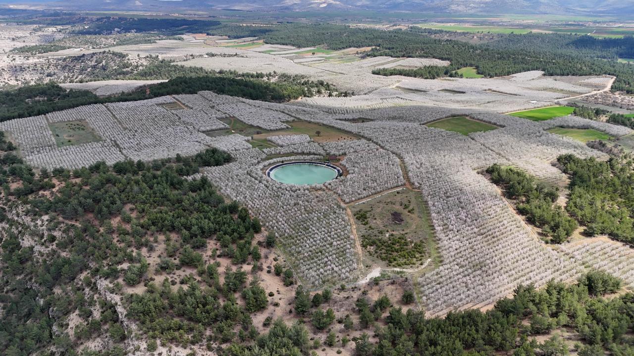 Türkiye`nin en büyük badem bahçeleri arasında yer alan bahçenin içerisindeki sulama havuzları çiçek açan badem ağaçlarıyla birlikte güzel görüntü oluşturdu.