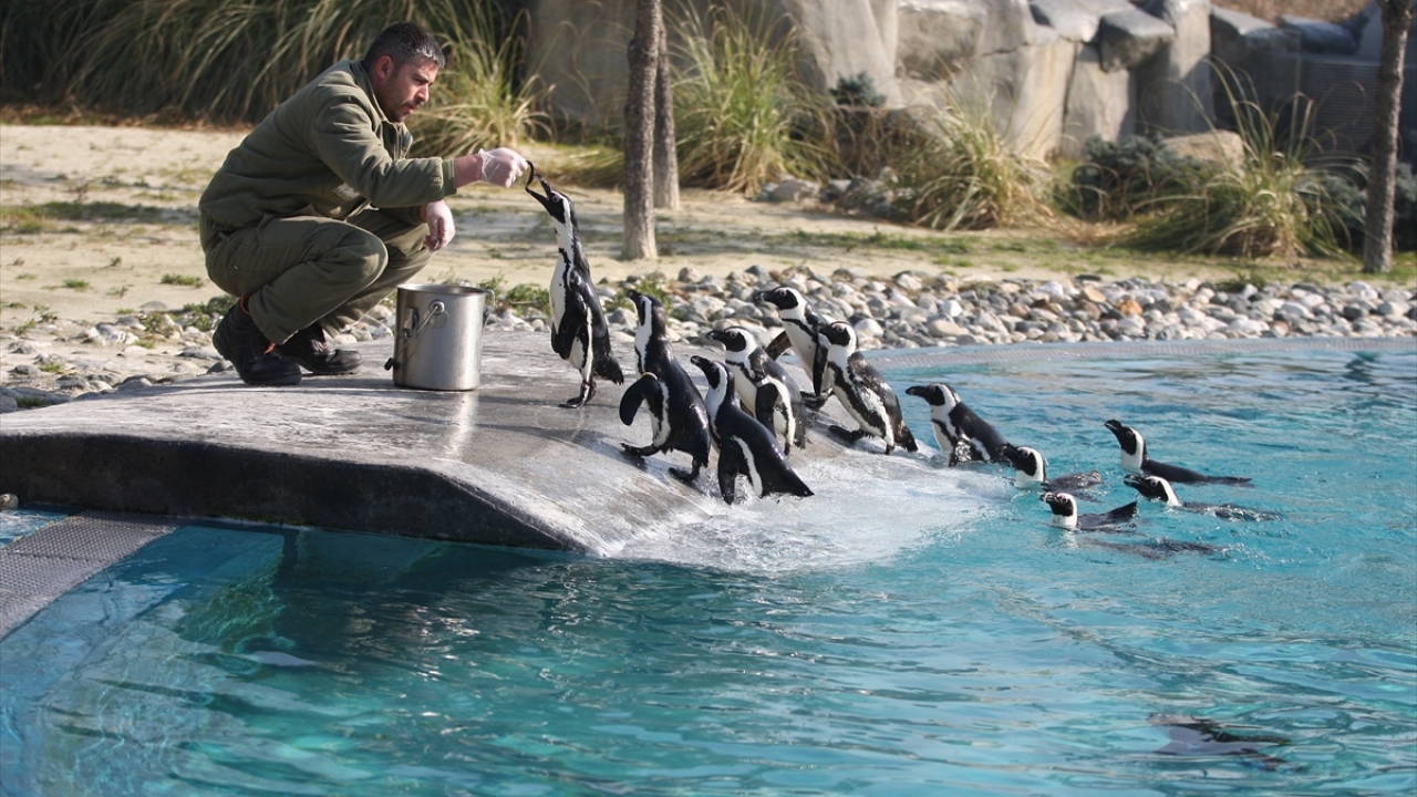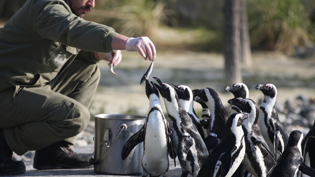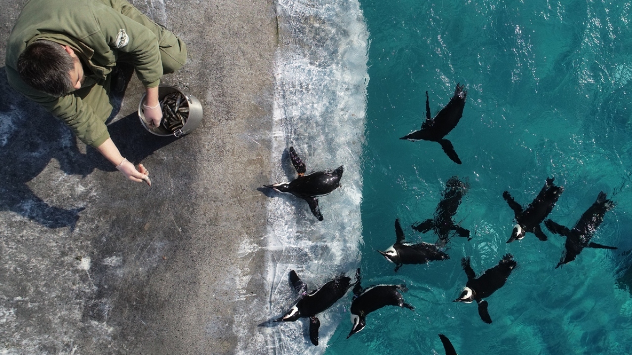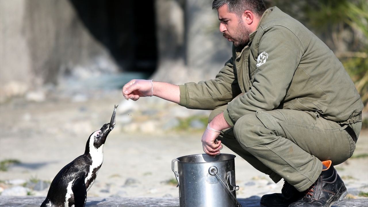 Günün belli vakitlerinde doğal ortamlarına uygun hazırlanan sardalya balığı yiyen penguenler, bakıcıları tarafından elle besleniyor.