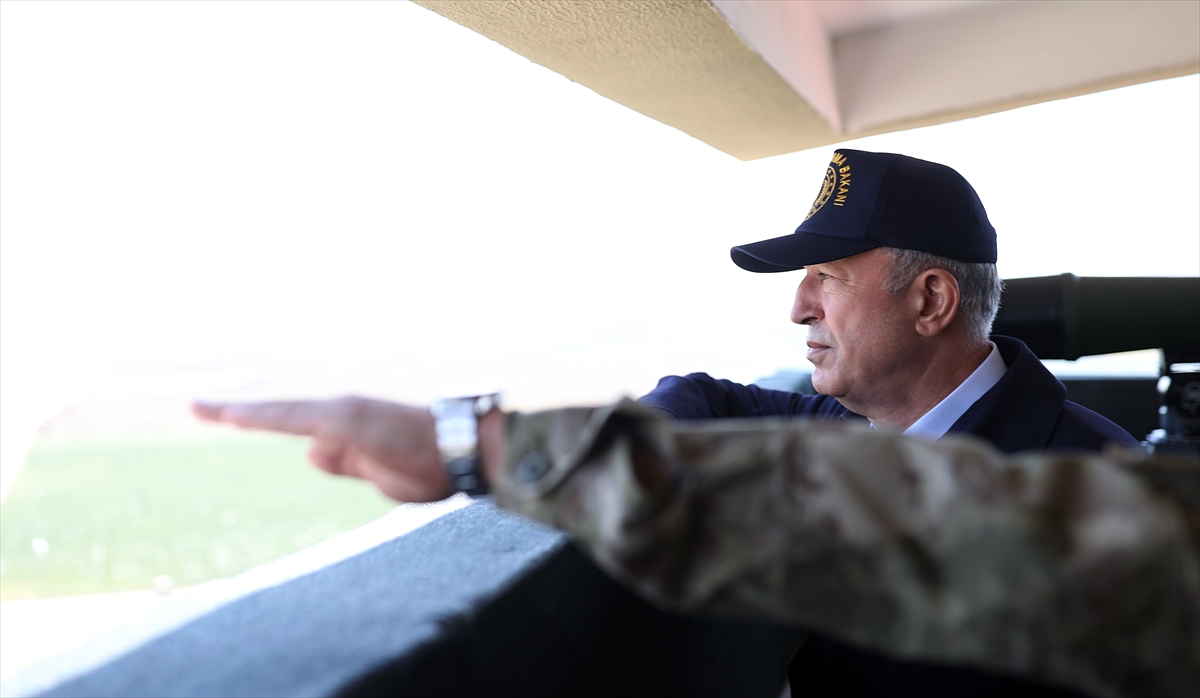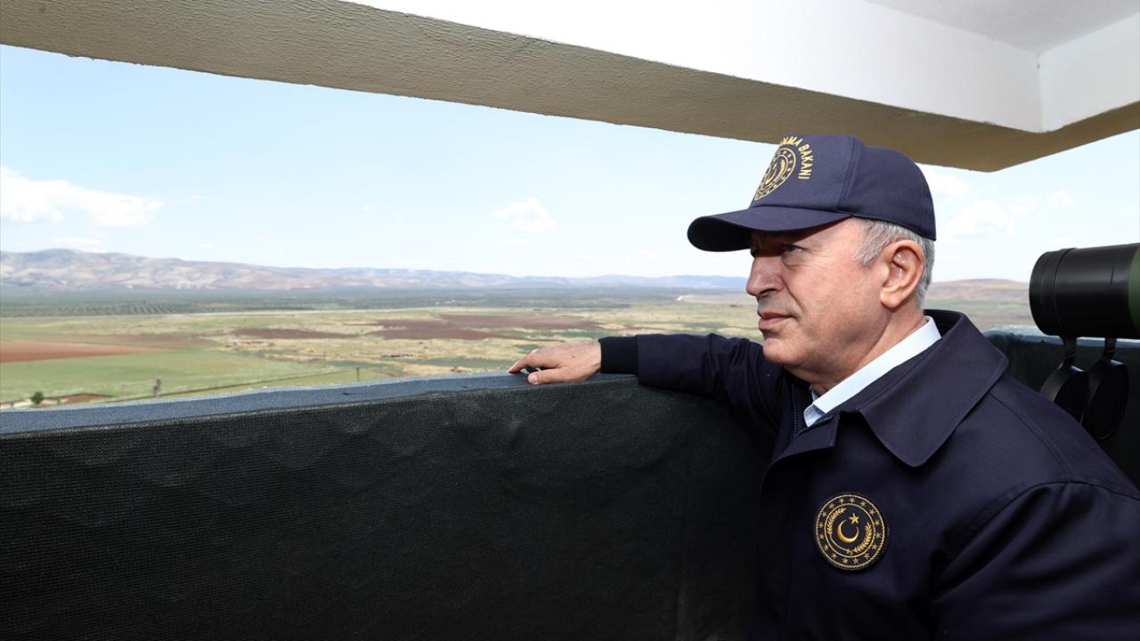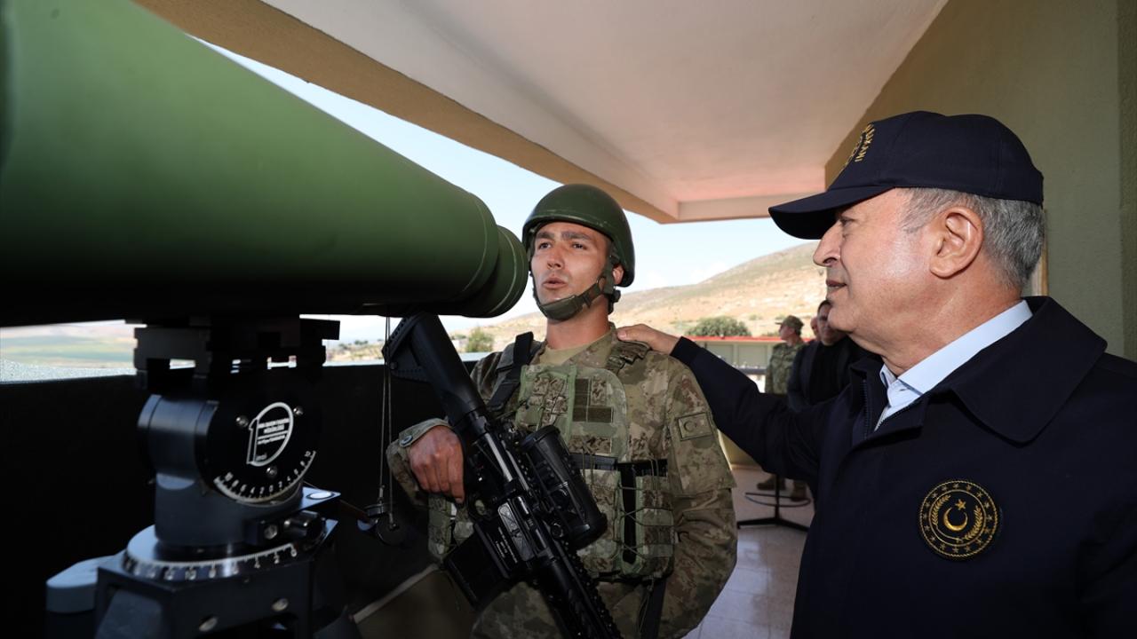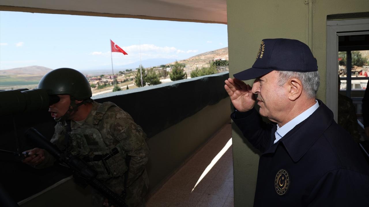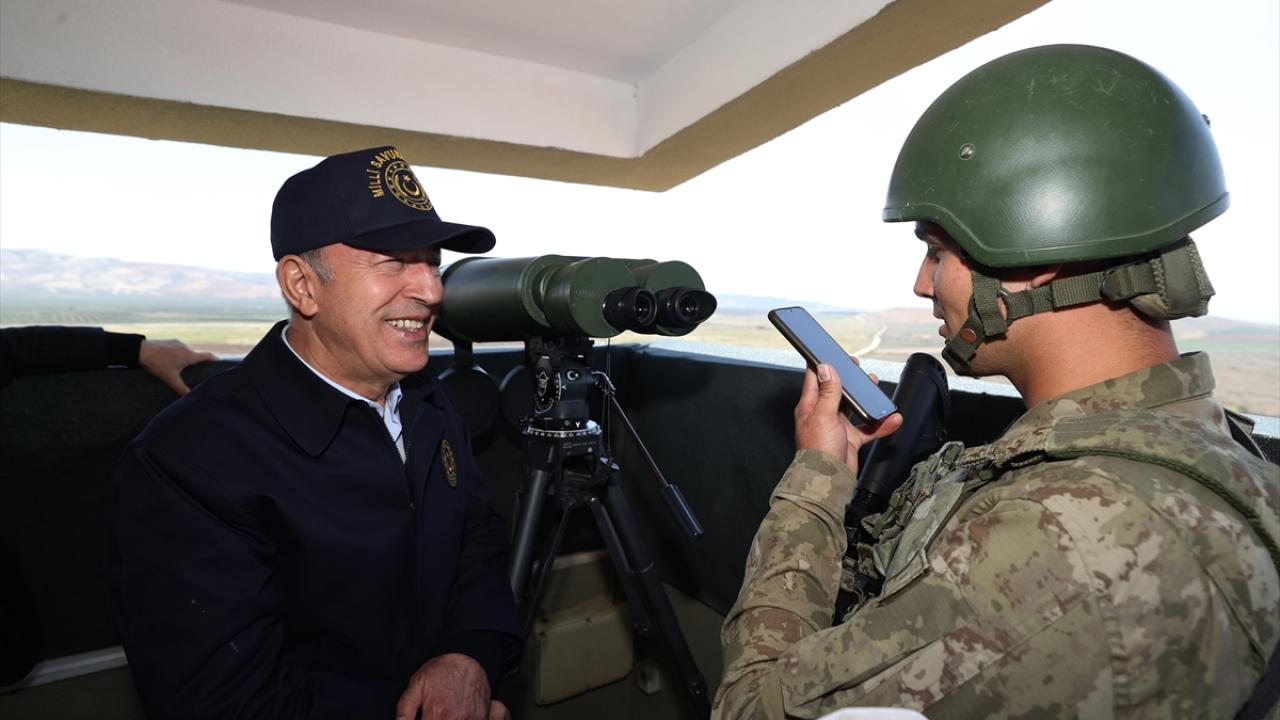 Hudut Karakol Komutanı’na Türk bayrağını öperek emanet eden Akar daha sonra alınan tedbirlere ilişkin brifing aldı, gözetleme kulesine çıkarak hududu inceledi.