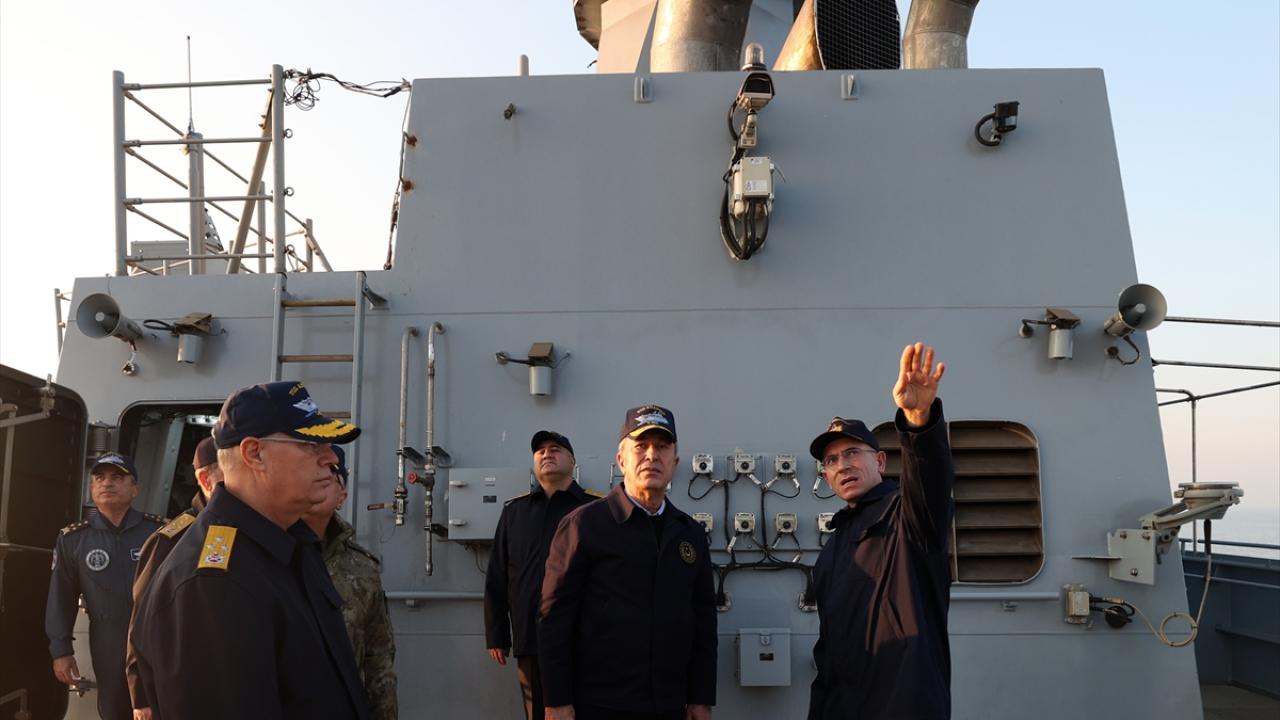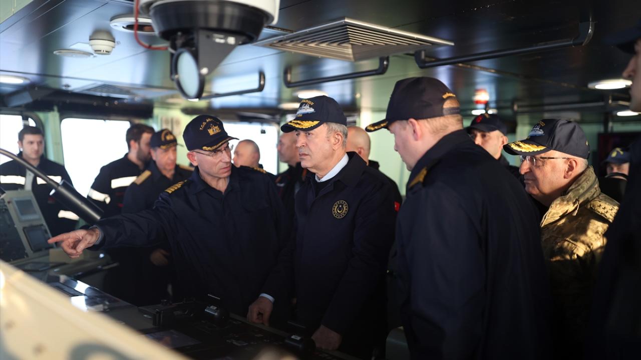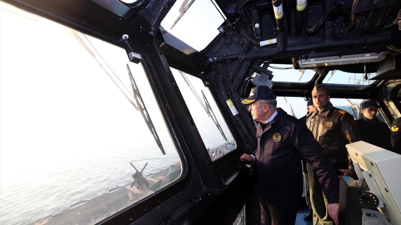 Donanma Kurmay Başkanı Tuğamiral İsmail Güldoğan`dan gemiye ilişkin brifing alan Akar, daha sonra köprü üstüne çıkarak incelemelerde bulundu.