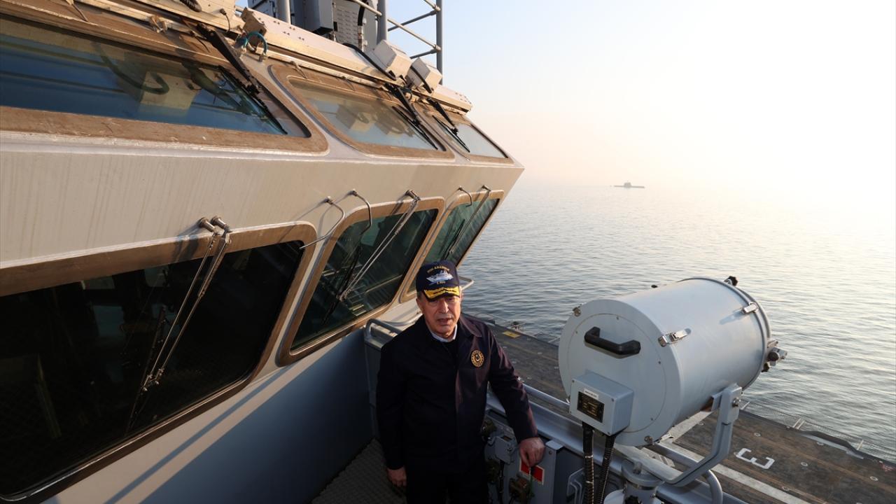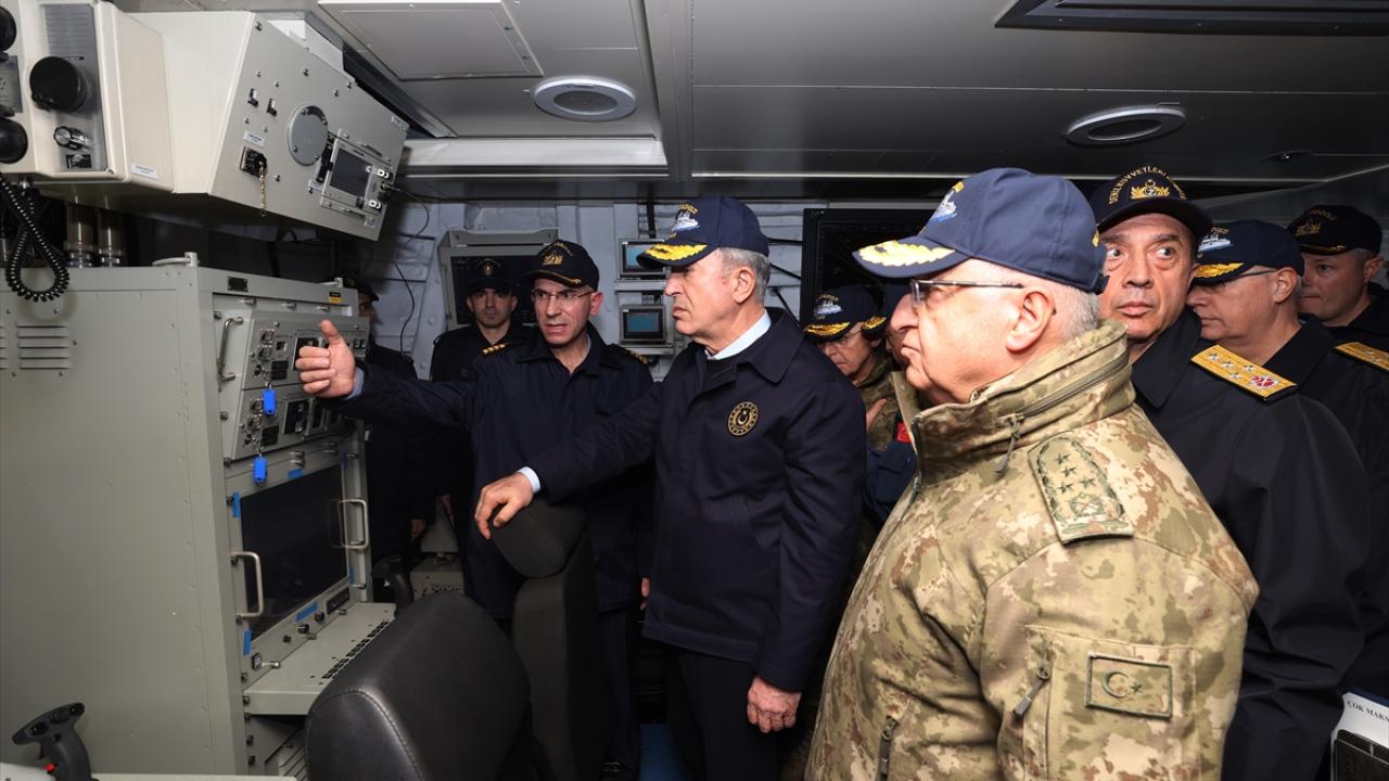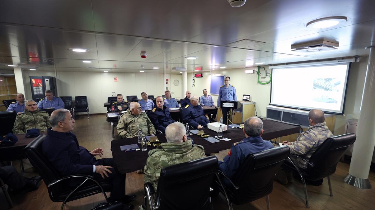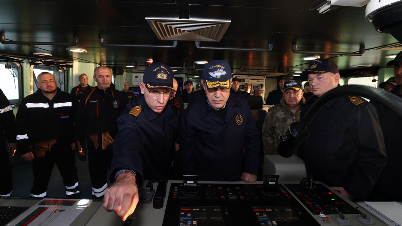 Donanma Kurmay Başkanı Tuğamiral İsmail Güldoğan`dan gemiye ilişkin brifing alan Akar, daha sonra köprü üstüne çıkarak incelemelerde bulundu.