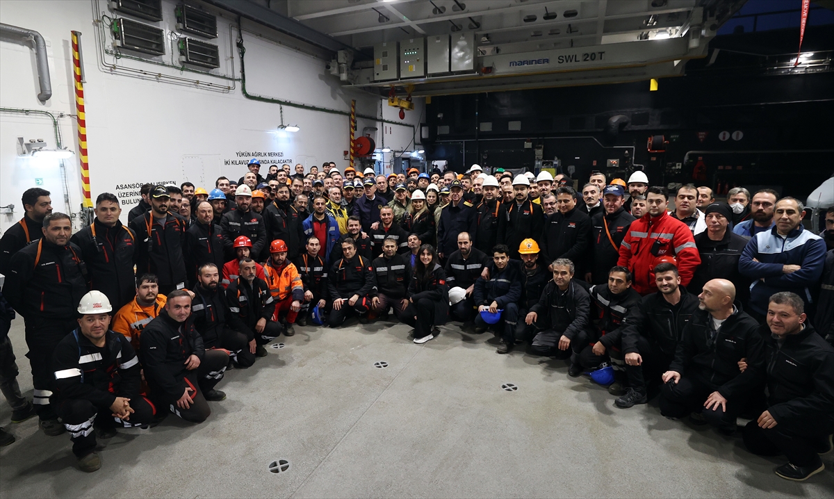 Akar, beraberindeki komuta kademesi ile geminin savaş harekat merkezindeki incelemelerinin ardından havuz olarak adlandırılan bölümde mürettebat ve gemi inşasında görevli personelle bir araya geldi.